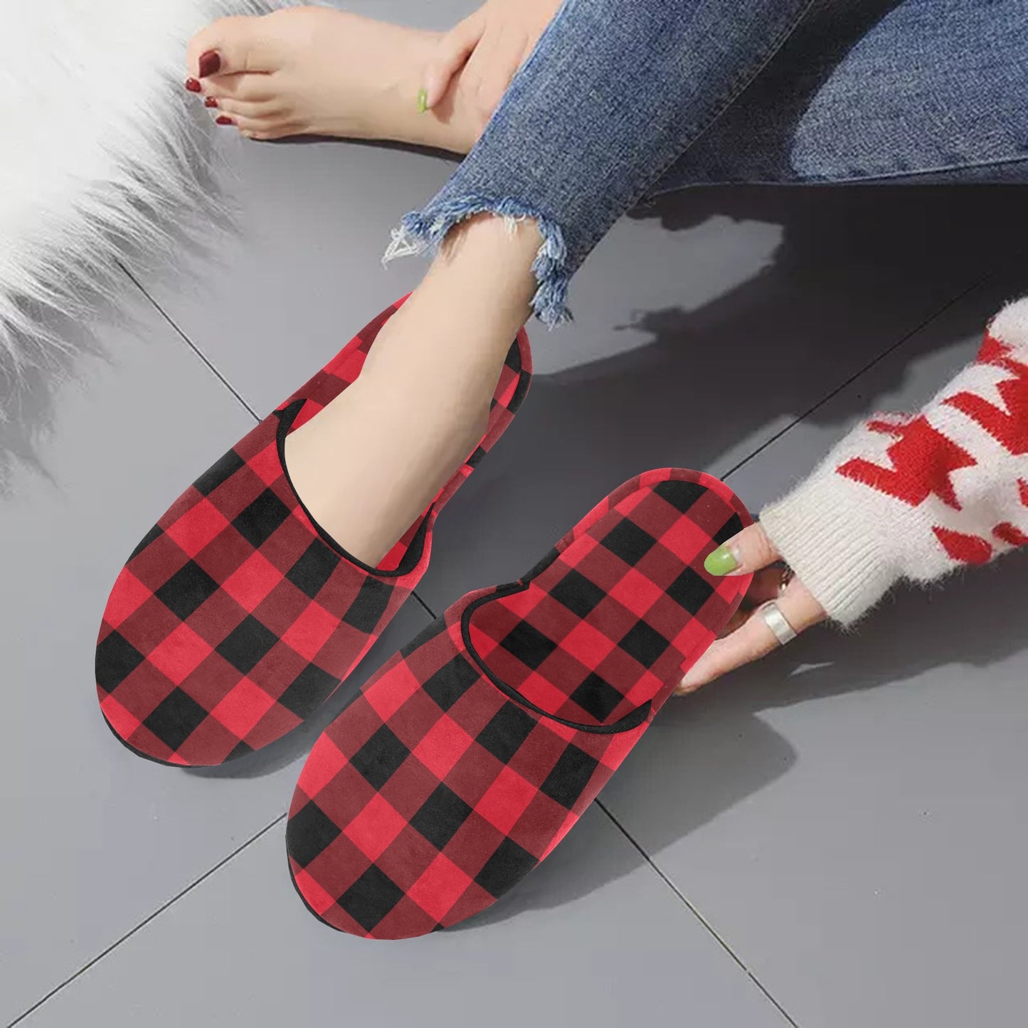 Buffalo Plaid Women's House Slide Slippers, Red Black Check Christmas Handmade Bedroom Cozy Winter Shoes