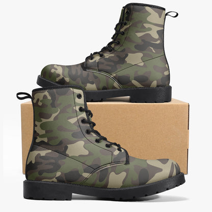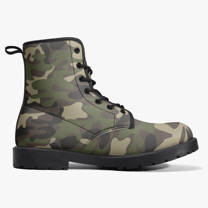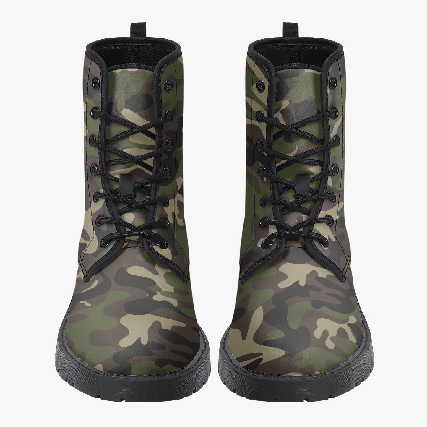 Camouflage Men Vegan Leather Combat Boots, Green Army Camo Lace Up Shoes Hiking Festival Black Ankle Work Winter Casual Custom