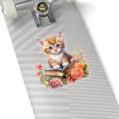 Cat on Books Sticker, Kitten Floral Flowers Reading Art Laptop Decal Vinyl Cute Waterbottle Tumbler Car Waterproof Wall Clear