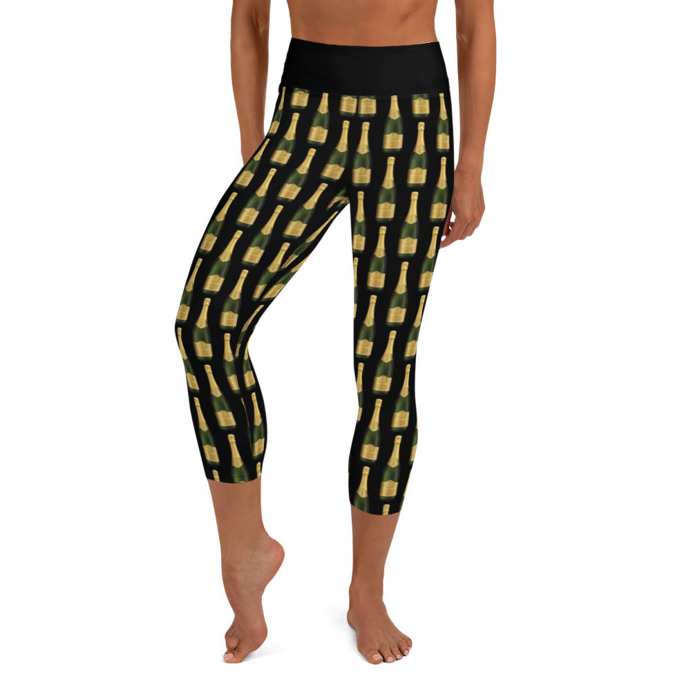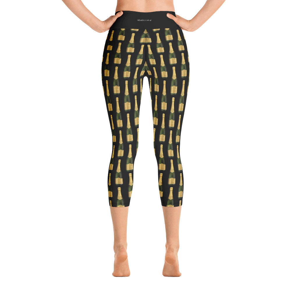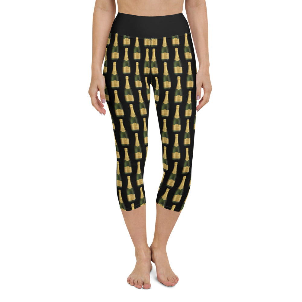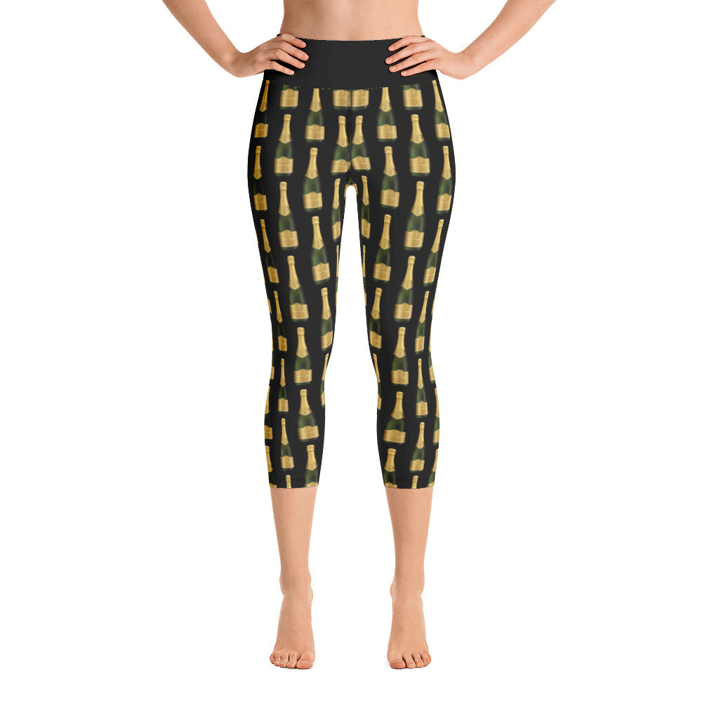 Champagne Bottle Yoga Capri Leggings for Women, Cheers Glass Bubbles Drinking, Classy for Party Festival Birthday Workout Pants w Pocket