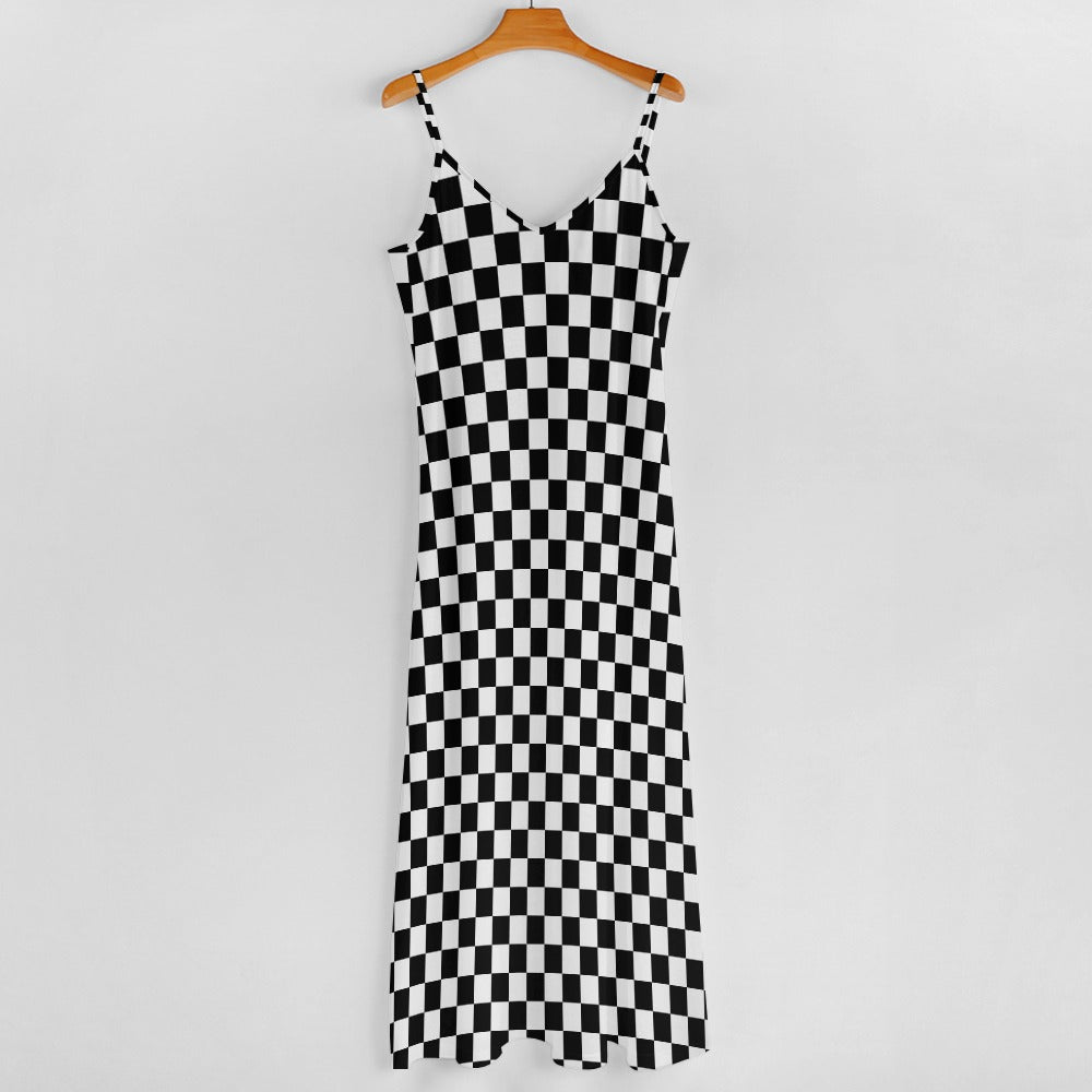 Checkered Maxi Dress, Black White Check Long Spaghetti Straps Flowy Women Sleeveless Casual Designer Elegant Plus Size Cocktail Party Summer
