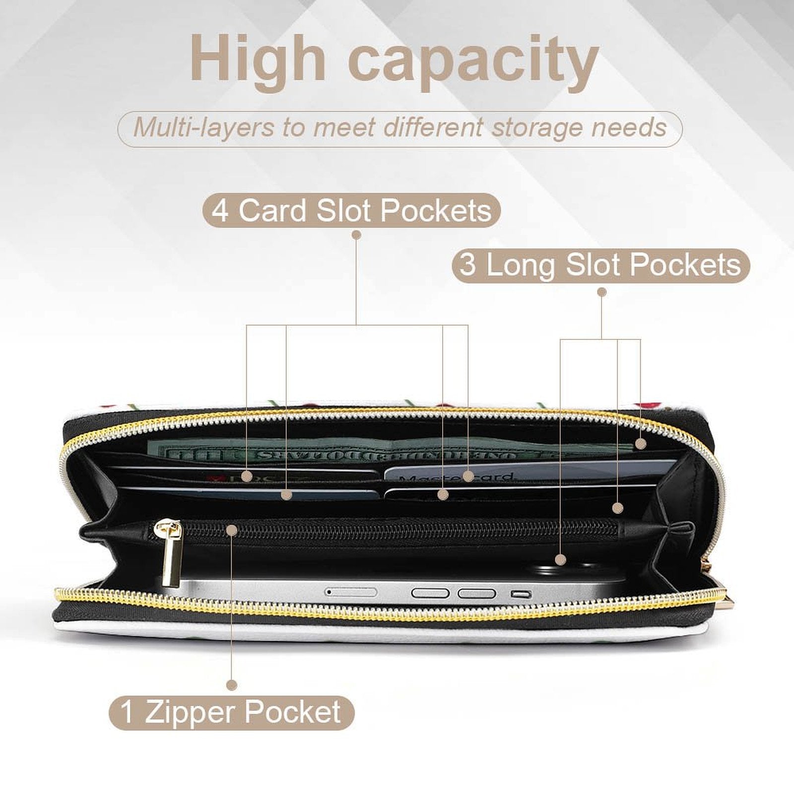 Cherry Leather Wallet Women, White Red Fruit Vegan Zipper Zip Around Coins Credit Cards Pocket Cash Ladies Female Slim Clutch Purse