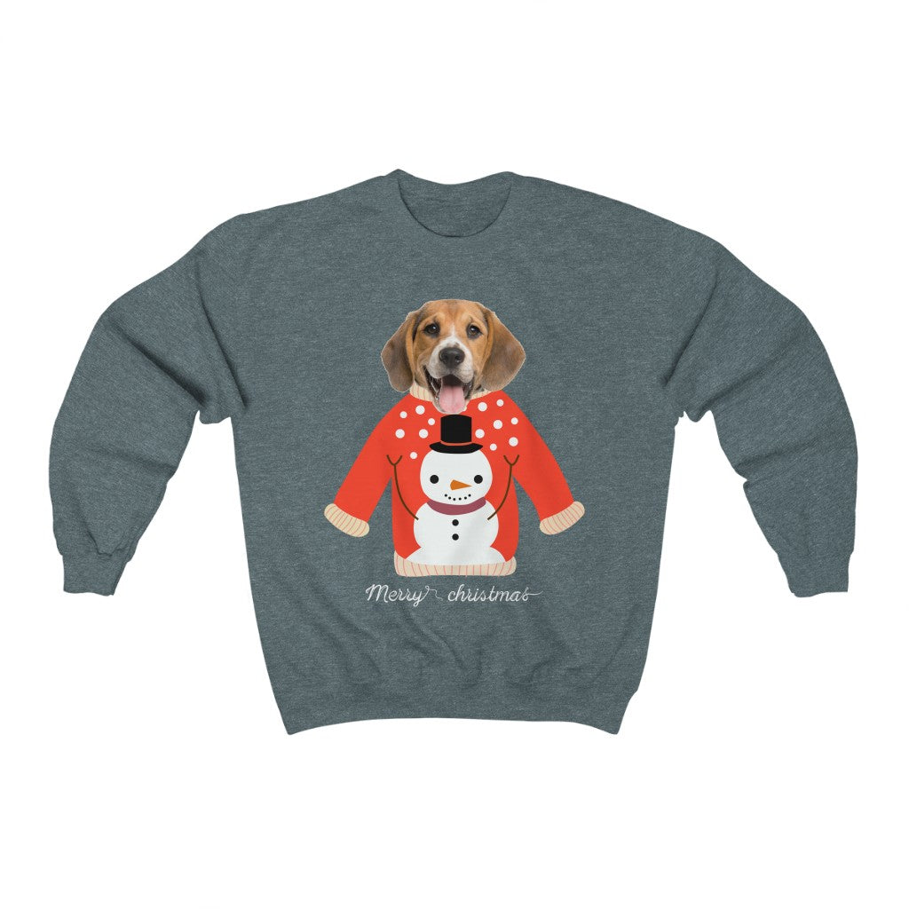 Upload your photo and let our designers put your pet's face on our snowman Christmas sweater. We will send a free mockup prior to printing.