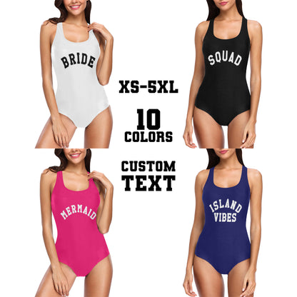 CUSTOM Swimsuit Women, Personalized text Bride Squad Bachelorette Plus Size One Piece Swim Birthday Halter Bathing Suit Bridesmaid Swimwear