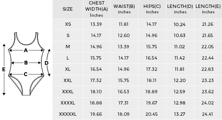 - Size: XS, S, M, L, XL, XXL, XXXL, XXXXL, XXXXXL. Calculate your size from the measurement chart below please. The measurements in the size chart are taken with the swimsuit lying flat, measured from left to right. To find the full circumference, simply double these measurements.
