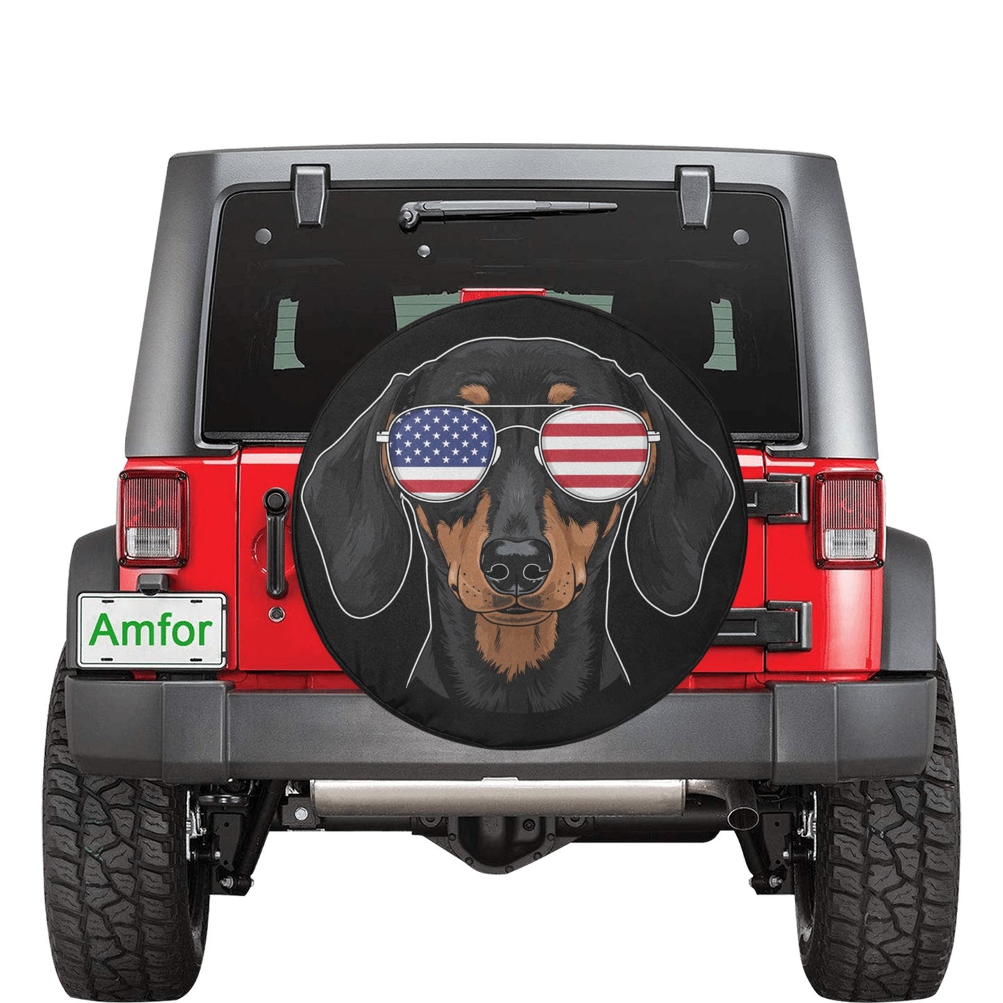 Dachshund Dog American Flag Spare Tire Cover, Puppy Sunglasses Cool Backup Camera Hole Wheel Unique RV Back Cars Men Women Trailer Campers