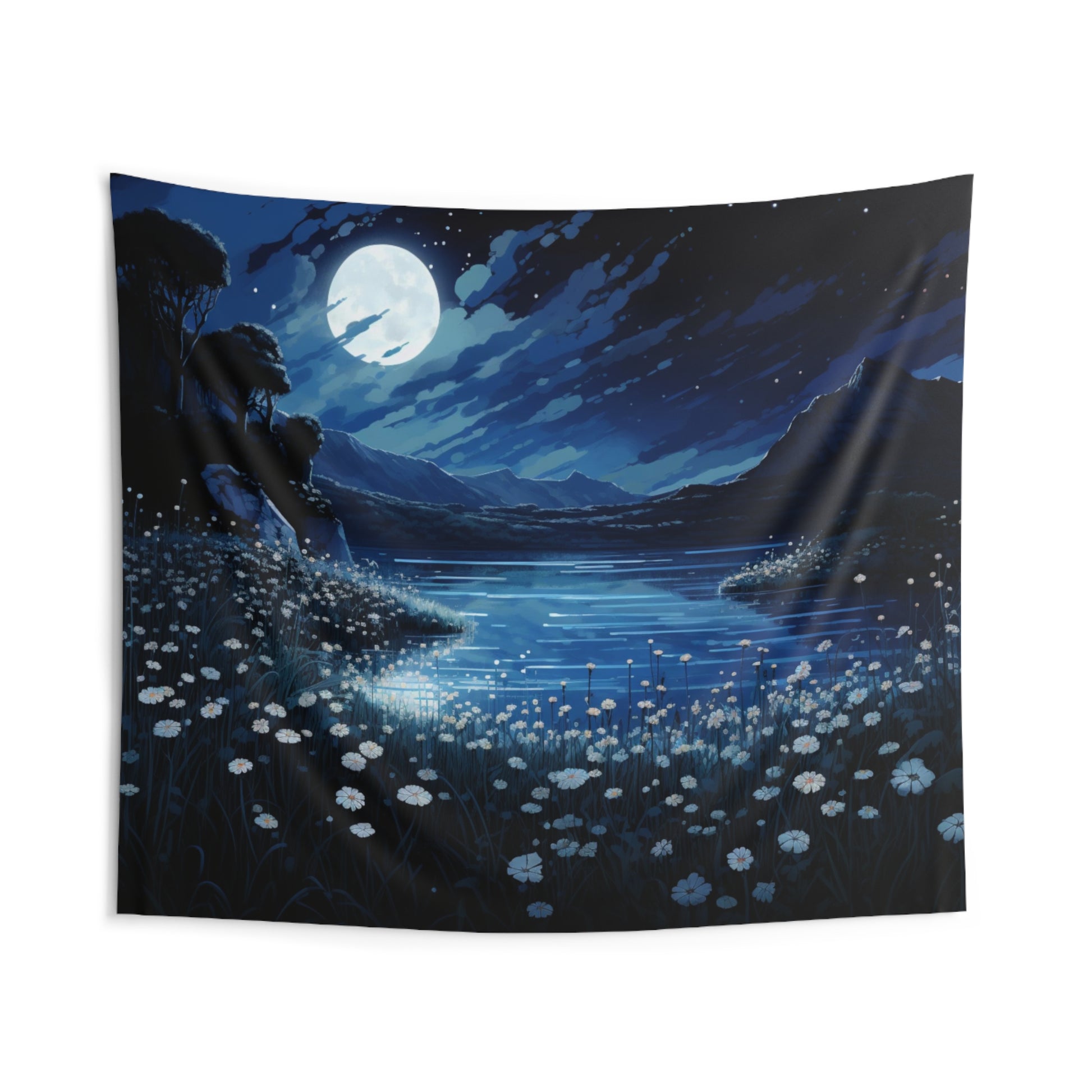 Dark Blue Night Sky Tapestry, Moon Dandelion Flowers Lake Wall Art Hanging Cool Unique Landscape Aesthetic Large Small Decor Bedroom Dorm