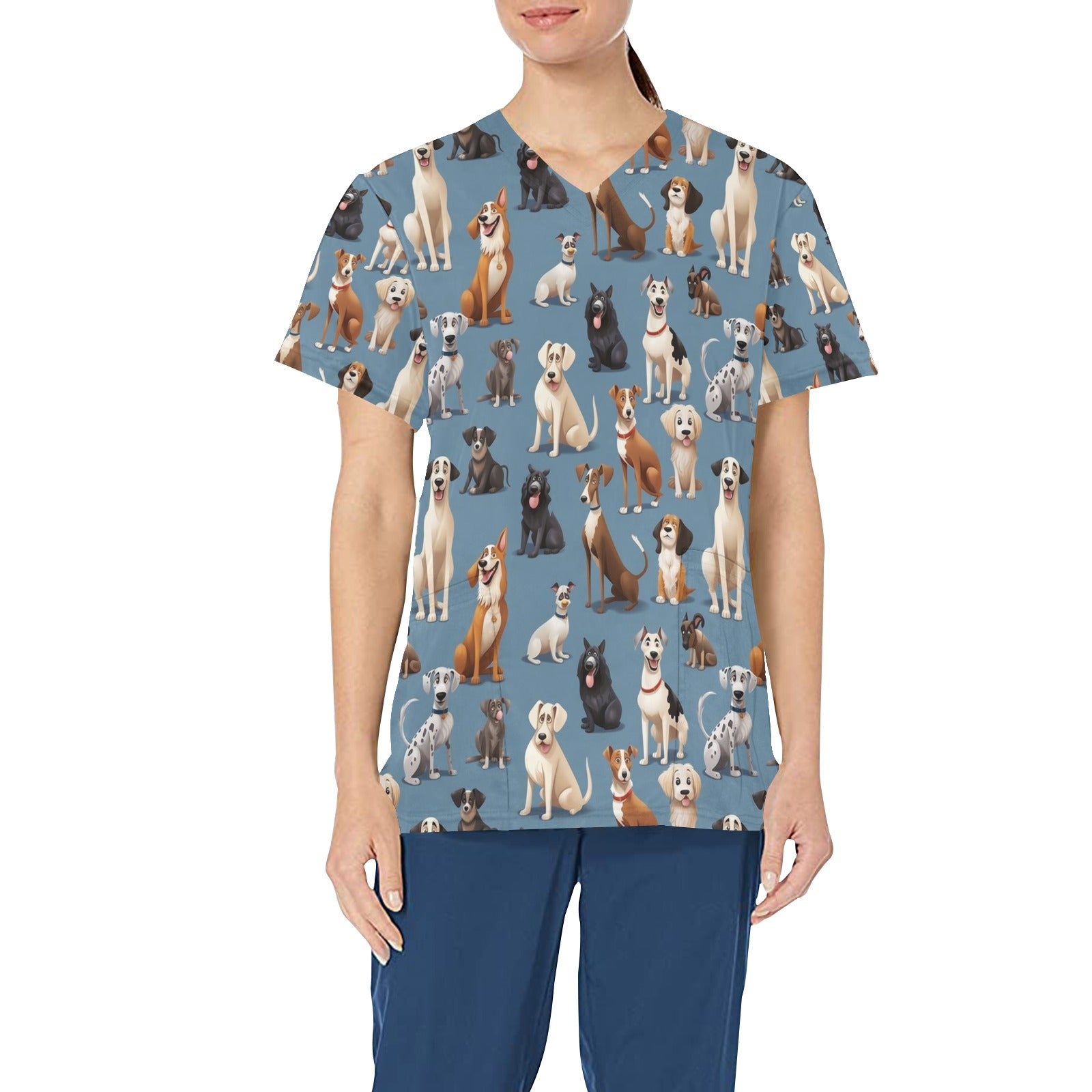 Dog Breed Medical Scrubs Top Women, Pet Animal Grooming Clinic Ladies Female Plus Size Nursing Nurse Vet Veterinary Hospital Uniform Pockets