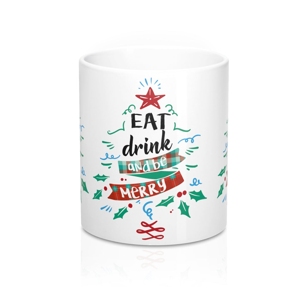 Eat Drink and Be Merry, Christmas Mug, Xmas Holiday tree Star Red Green Cup Tea Lover Unique Novelty Cool Gift Ceramic