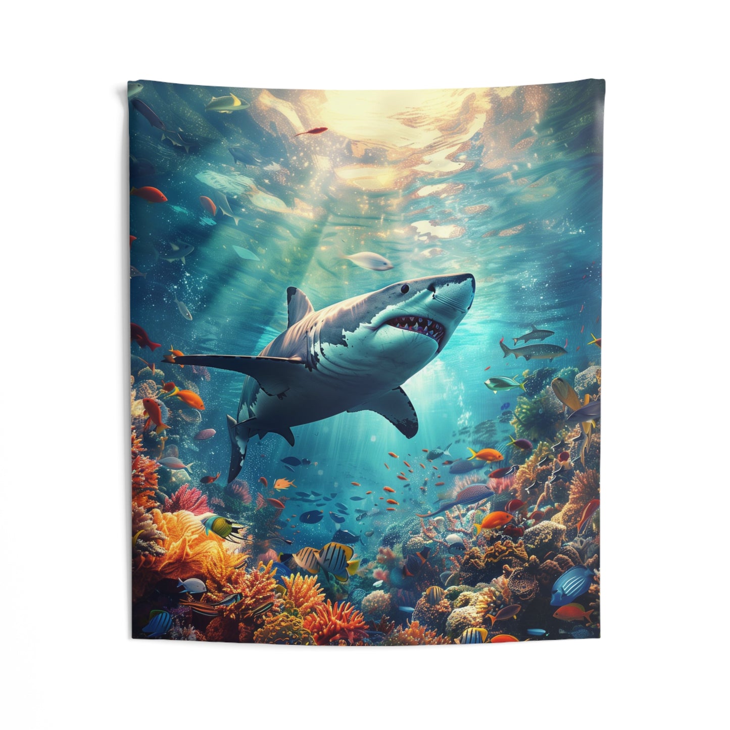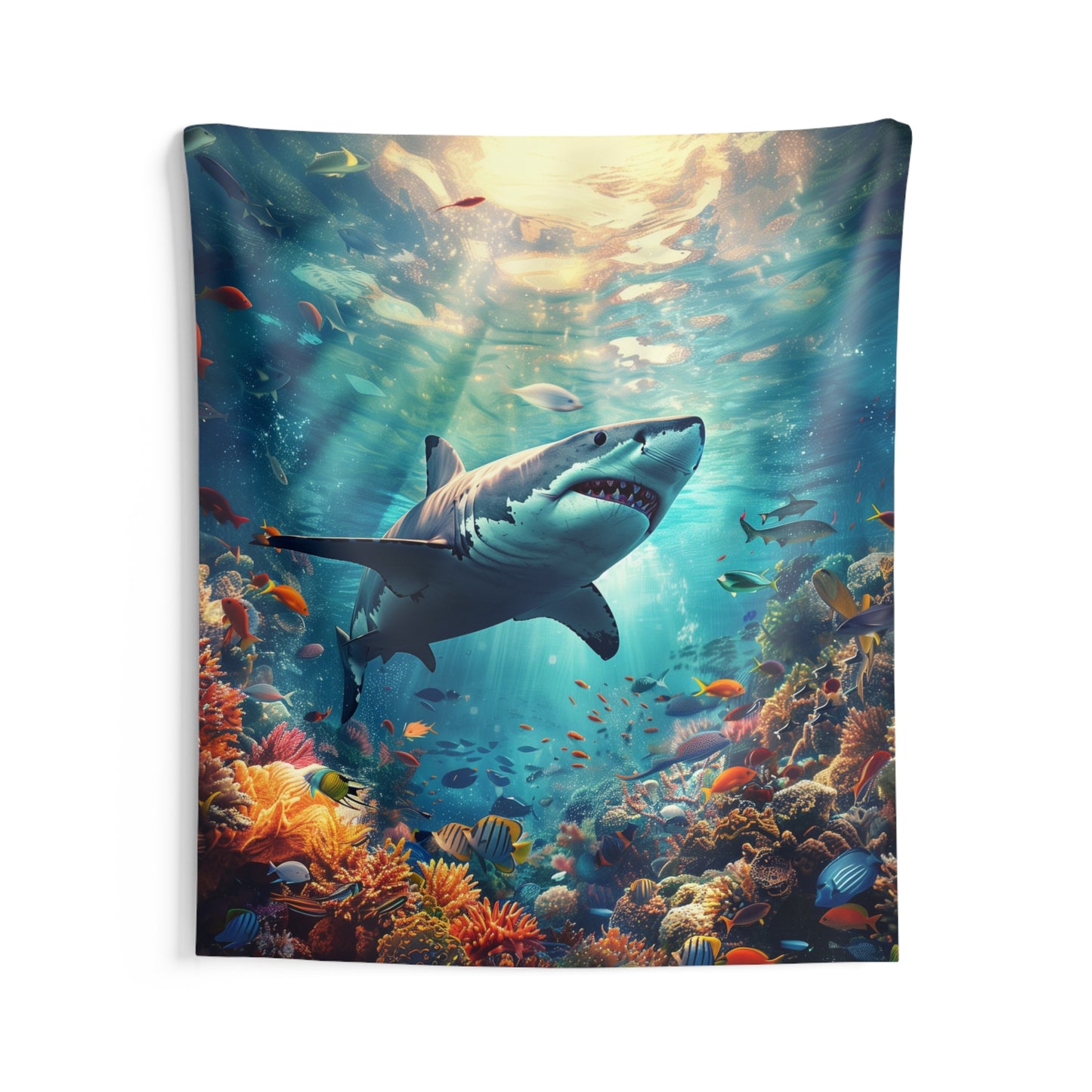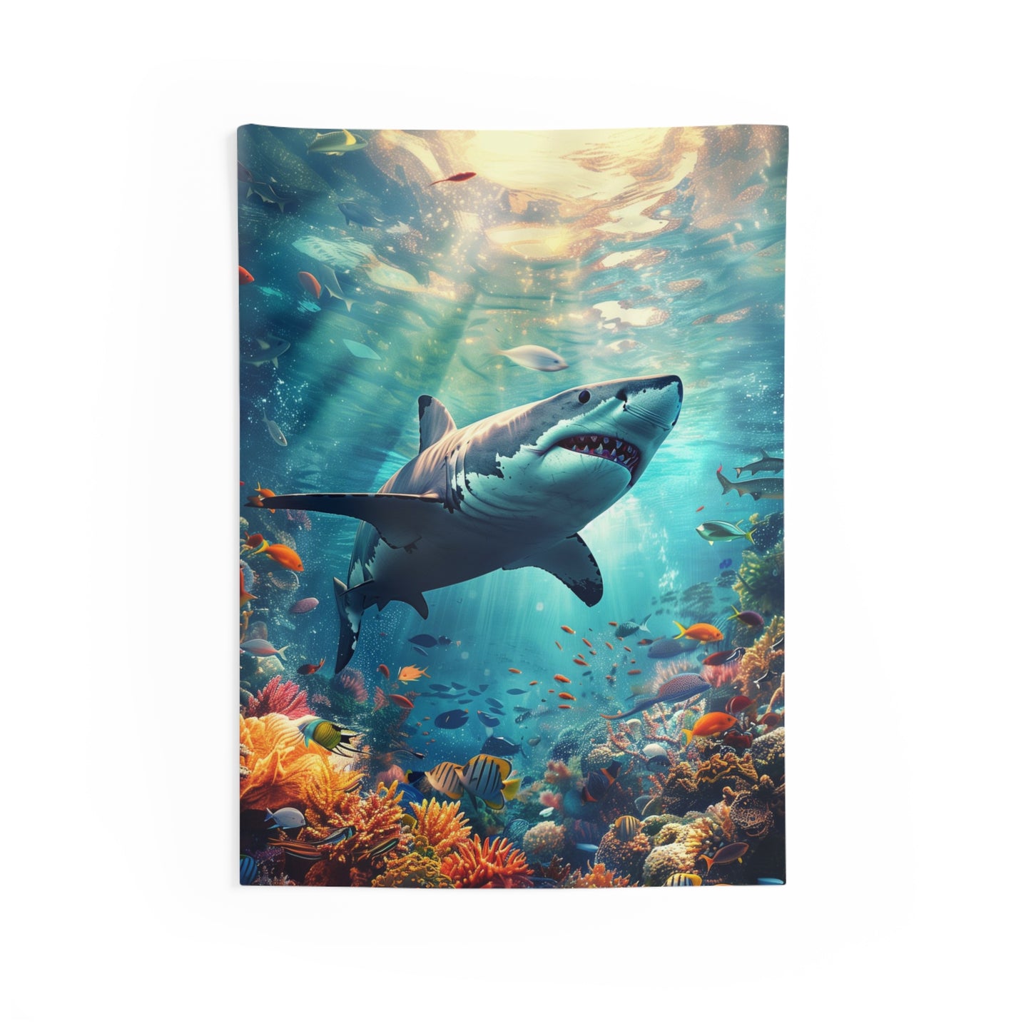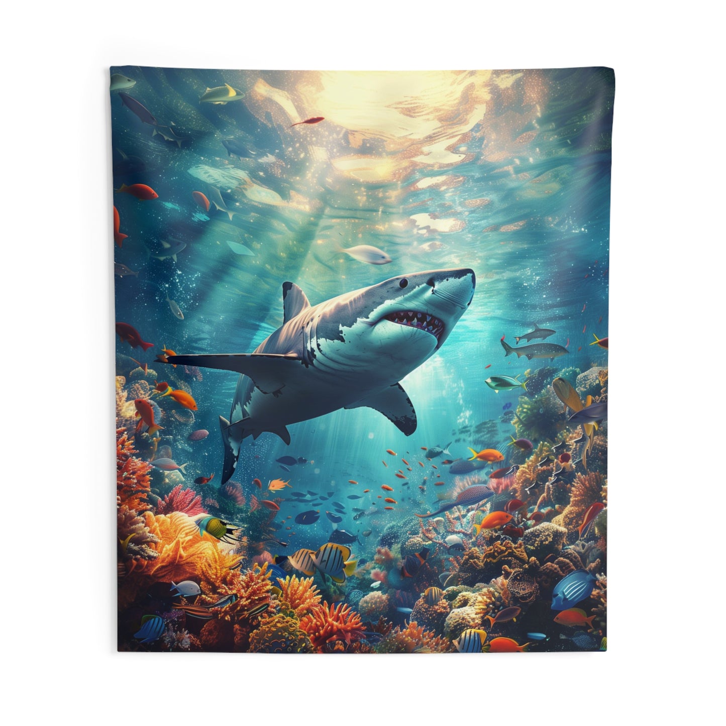 Great White Shark Tapestry, Coral Reef Ocean Sea Wall Art Hanging Cool Unique Vertical Aesthetic Large Small Bedroom College Dorm Room