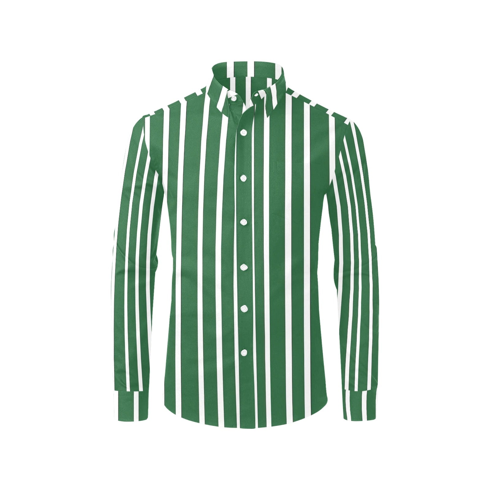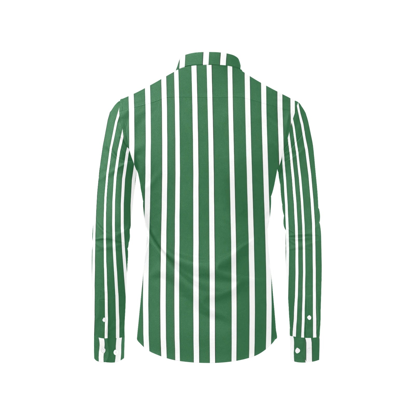 Green White Striped Men Button Up Shirt, Vertical Stripes Long Sleeve Buttoned Down Collar Male Guys Casual Dress Chest Pocket