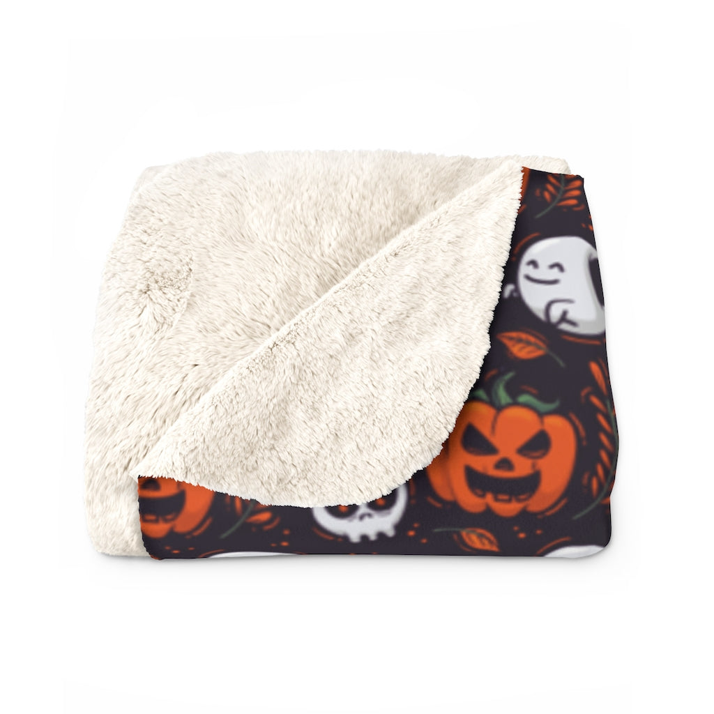 Halloween Sherpa Fleece Blanket, Black Orange Pumpkins Ghosts Spooky Throw Adult Kids Blanket Fall Decor Gift