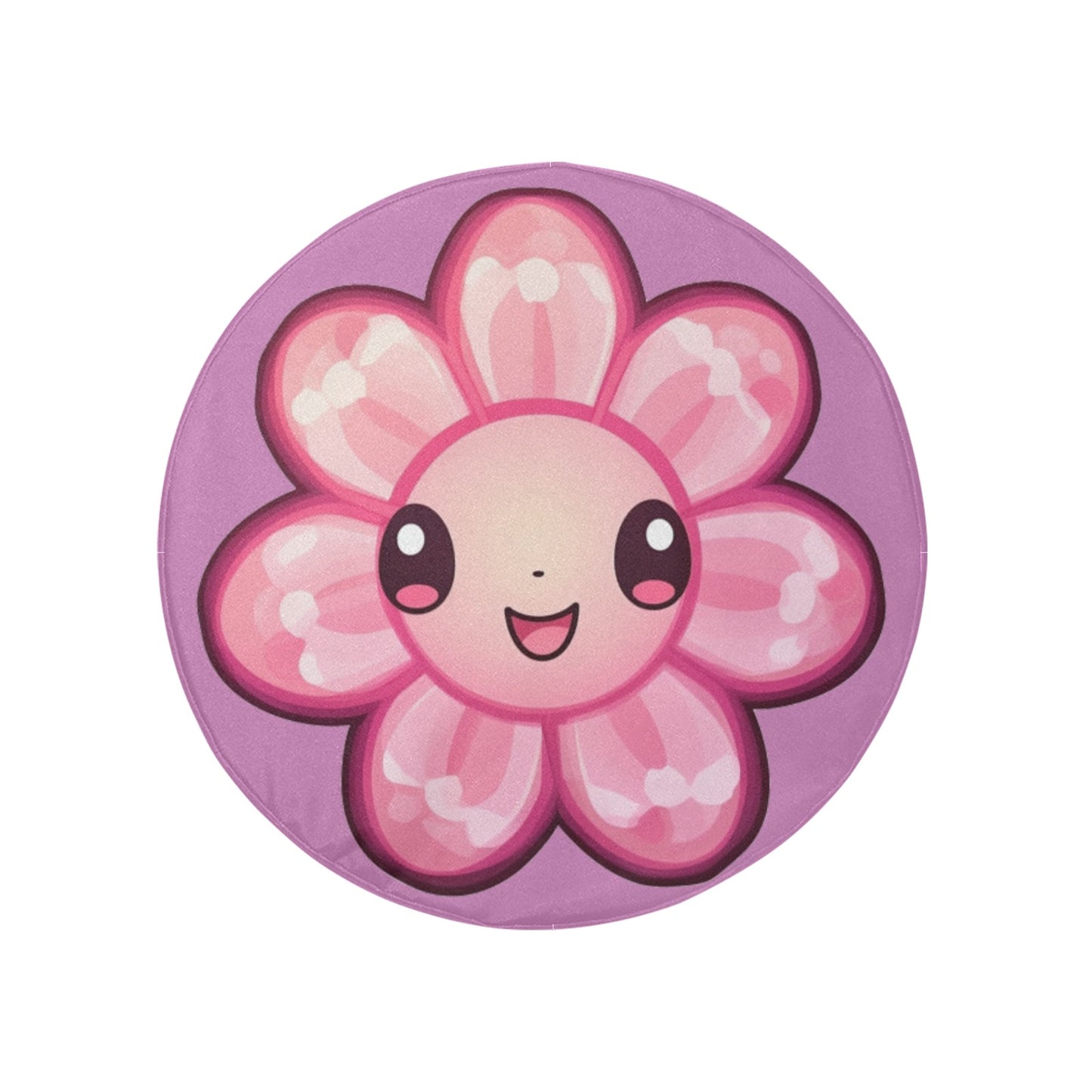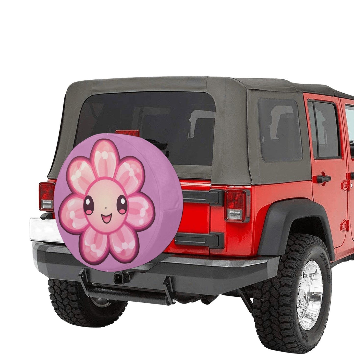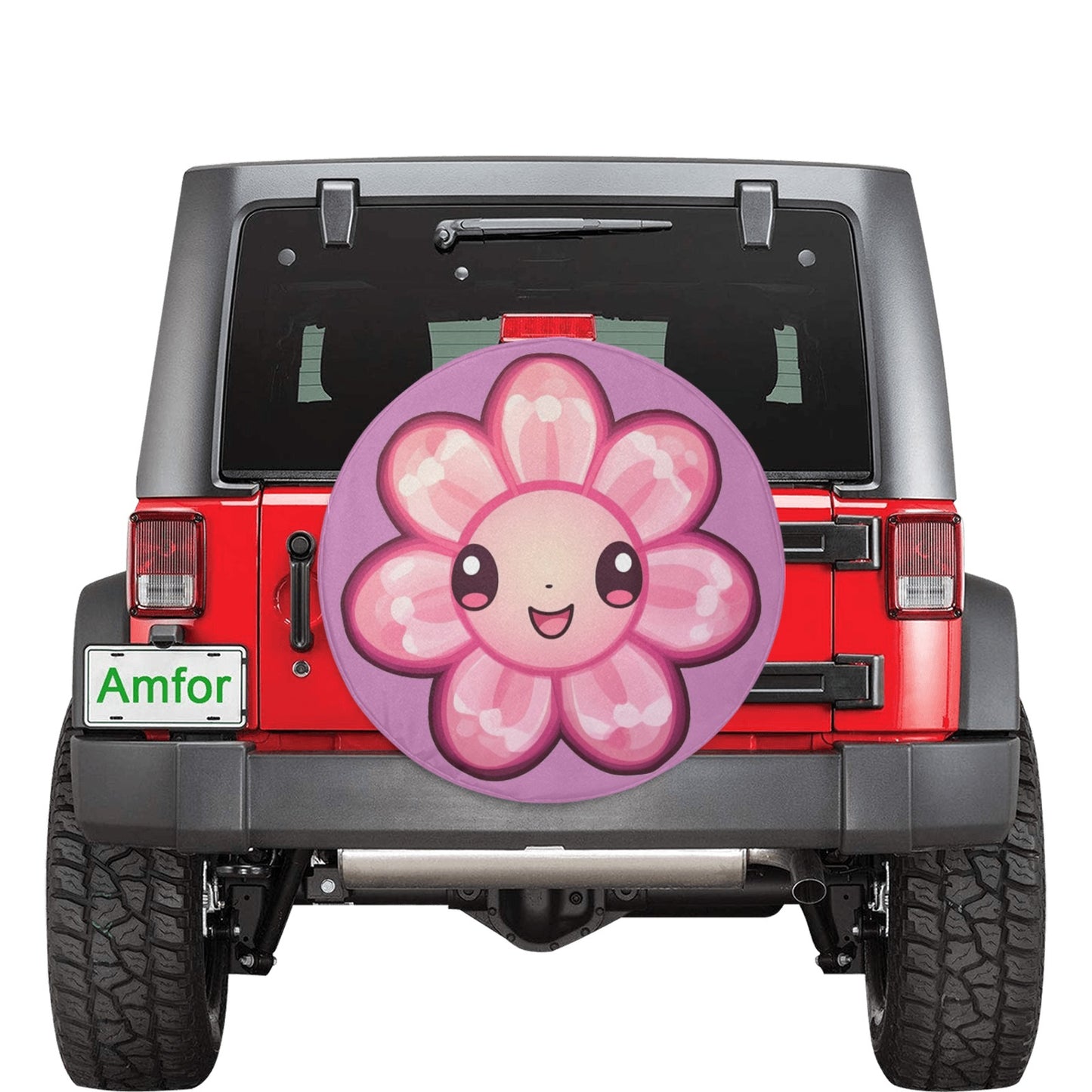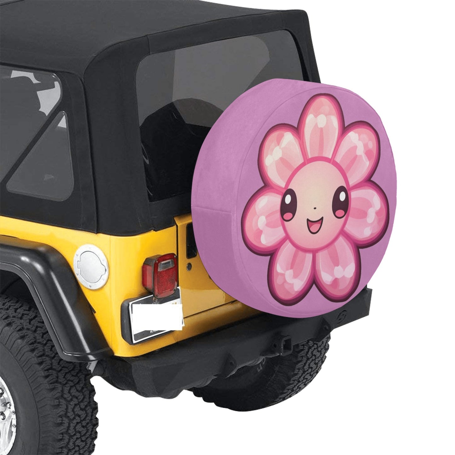 Happy Flower Spare Tire Cover, Pink Smiling Face Kawaii Floral Wheel Accessories Custom Unique Design Backup Camera Hole Trailer Back Women