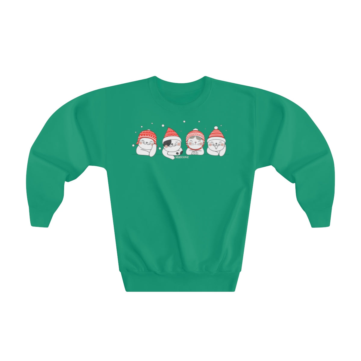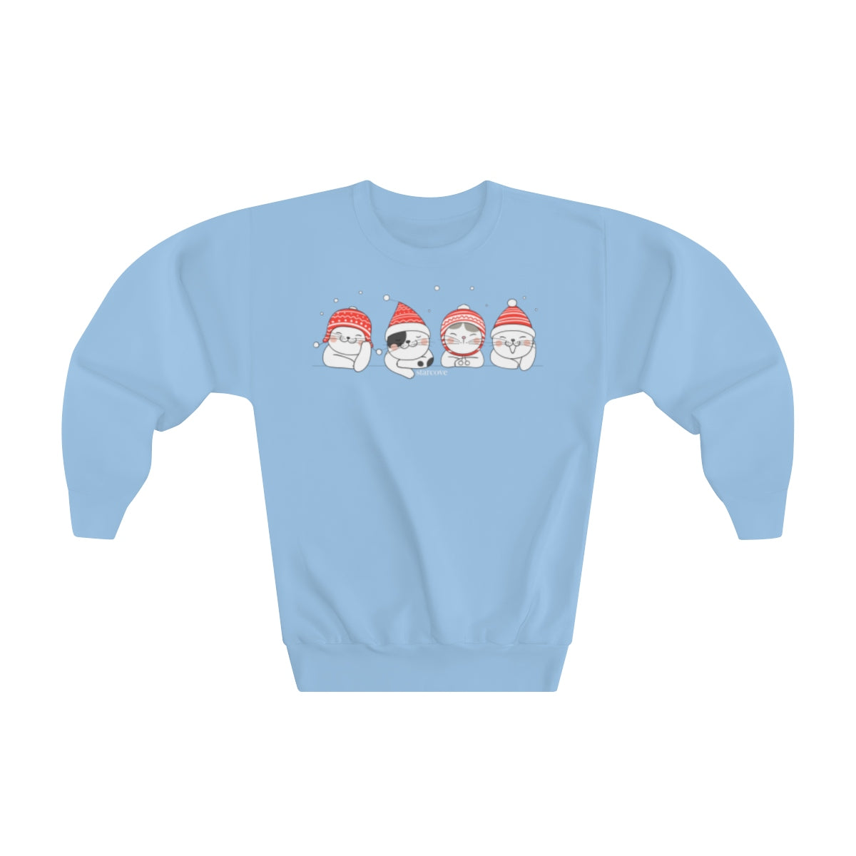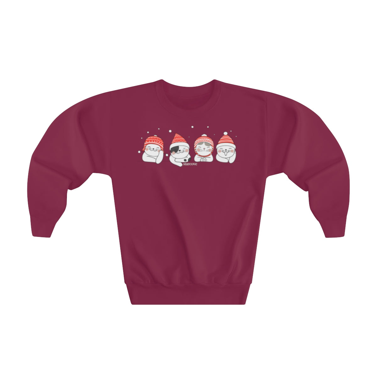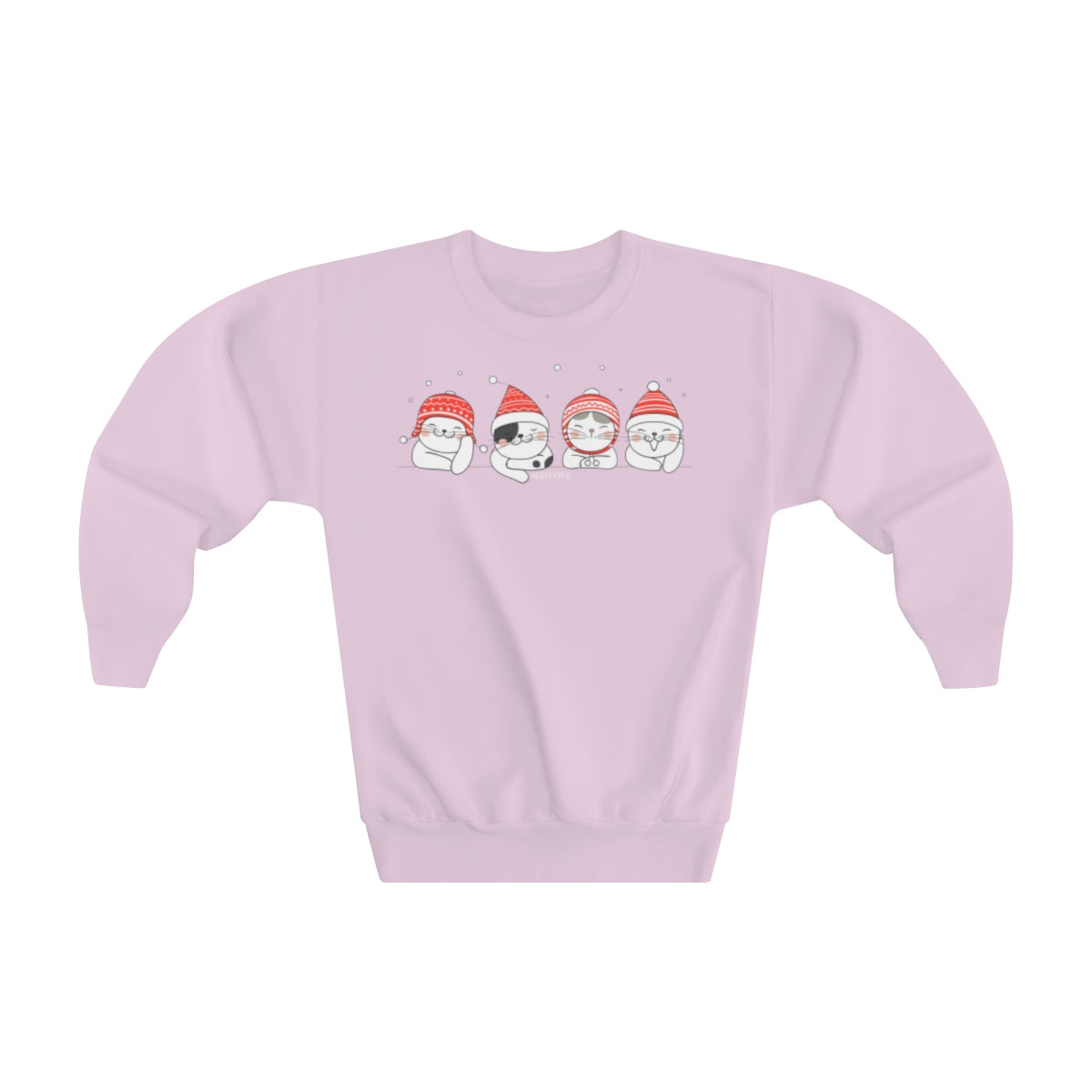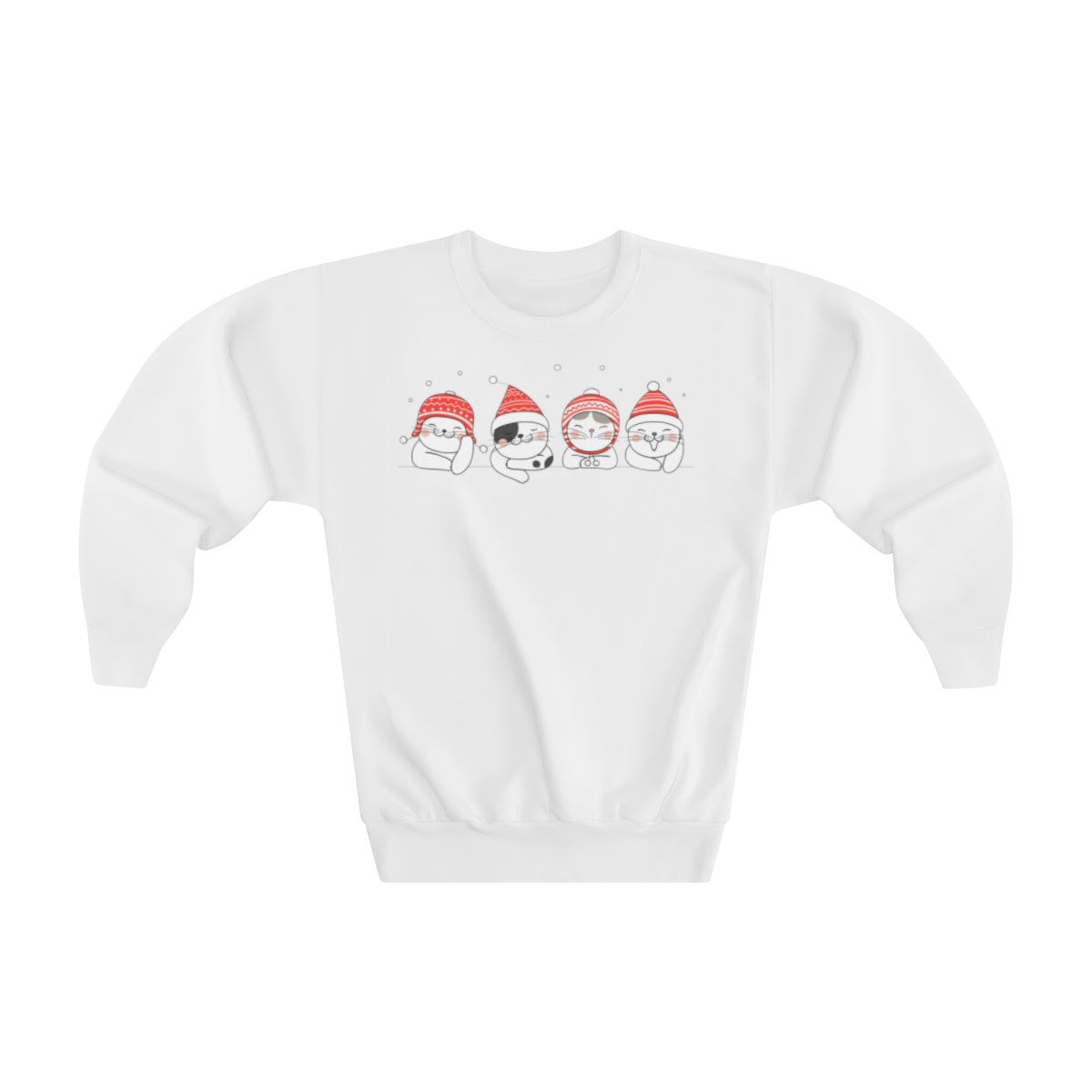 Holiday Winter Cute Cats Fleece Kids Sweatshirt Top, Xmas Christmas Cold Snow Kitten Sweater Youth Crewneck Eco Friendly Fabric Gift