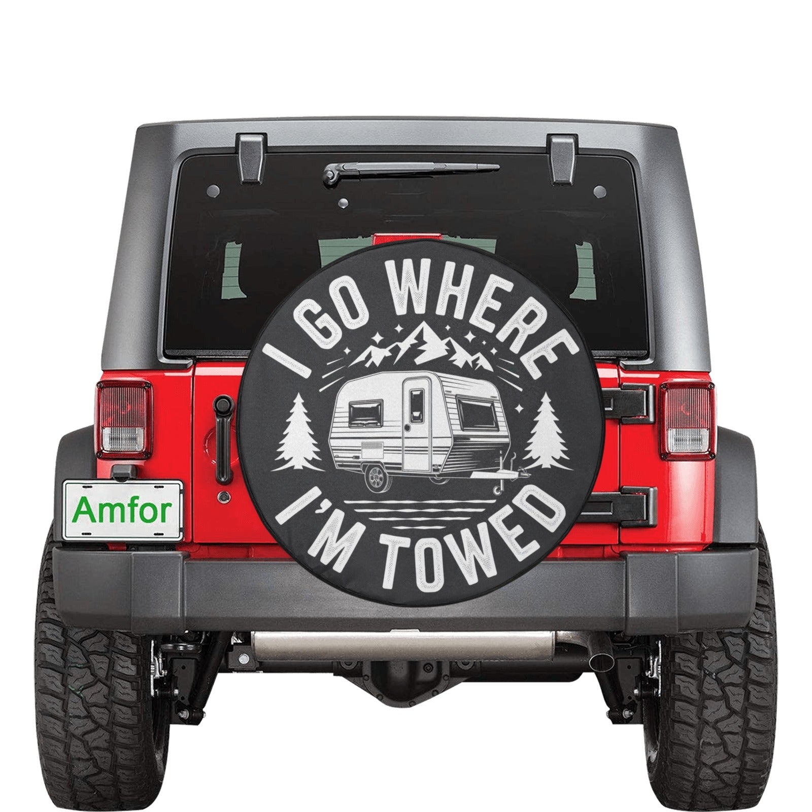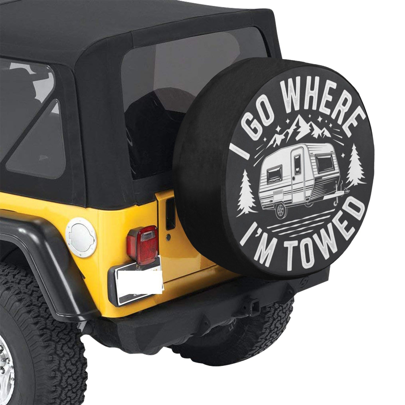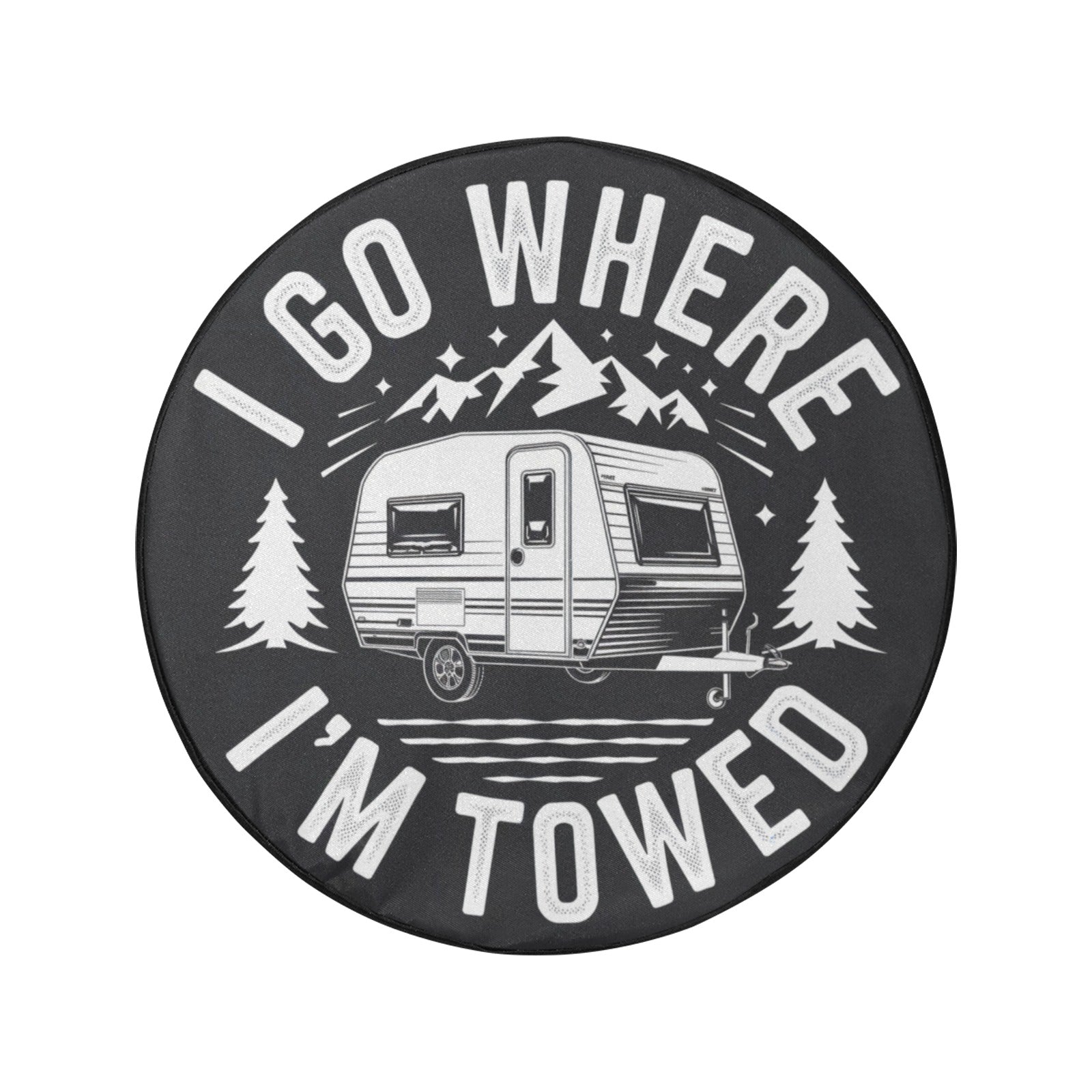 I go where I'm Towed Spare Tire Cover, Travel Caravan Cool Backup Camera Hole Rear Extra Wheel Unique RV Back Cars Men Women Trailer Campers