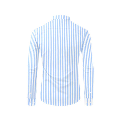 Light Blue Striped Long Sleeve Men Button Up Shirt, White Print Buttoned Collared Dress Shirt with Chest Pocket