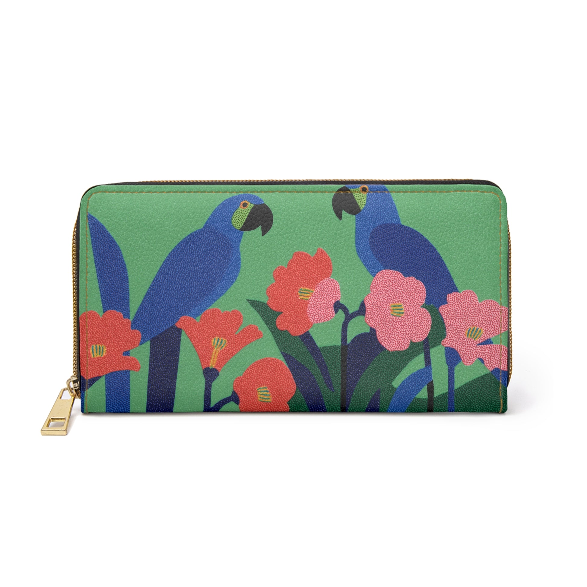 Macaw Parrots Leather Wallet Women, Flowers Bird Vegan Zipper Zip Around Coins Credit Cards Pocket Cash Ladies Female Pouch Clutch Purse