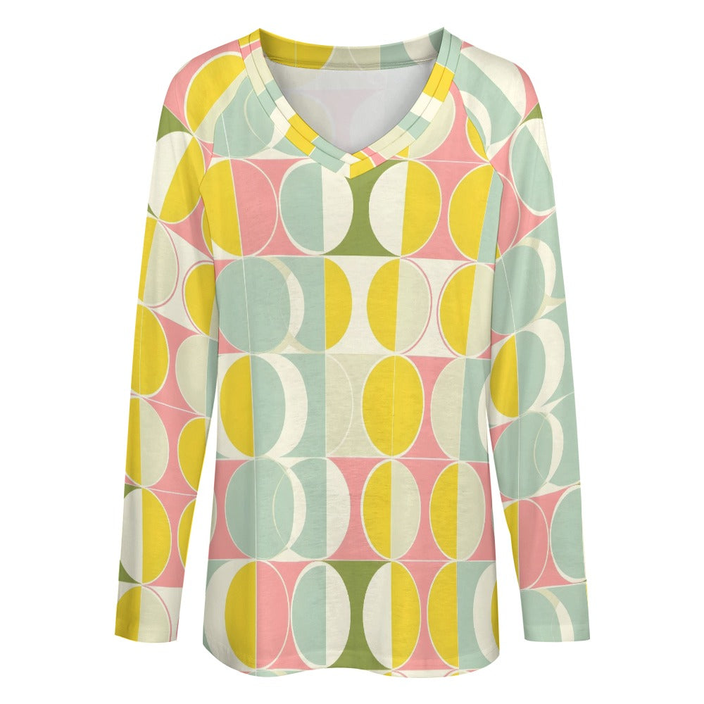 Mid Century Modern Women Long Sleeve Tshirt loose fit, Geometric Retro Relaxed V-neck Designer Graphic Aesthetic Ladies Female Tee Top Shirt