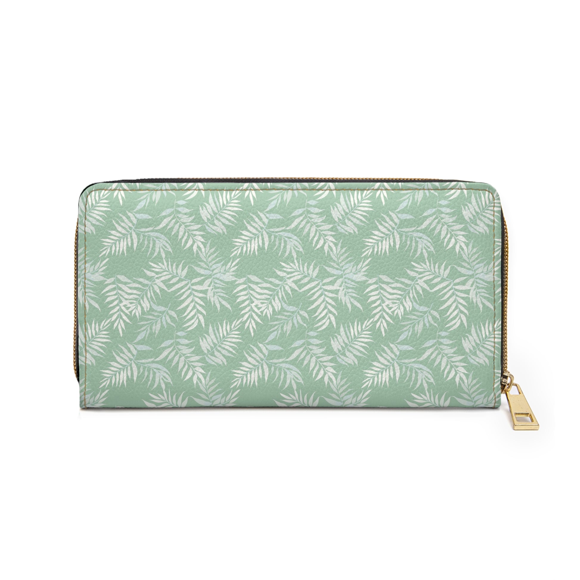 Mint Green Leather Wallet Women, Palm Tree Leaf Vegan Zipper Zip Around Coins Credit Cards Pocket Cash Ladies Female Pouch Slim Clutch Purse