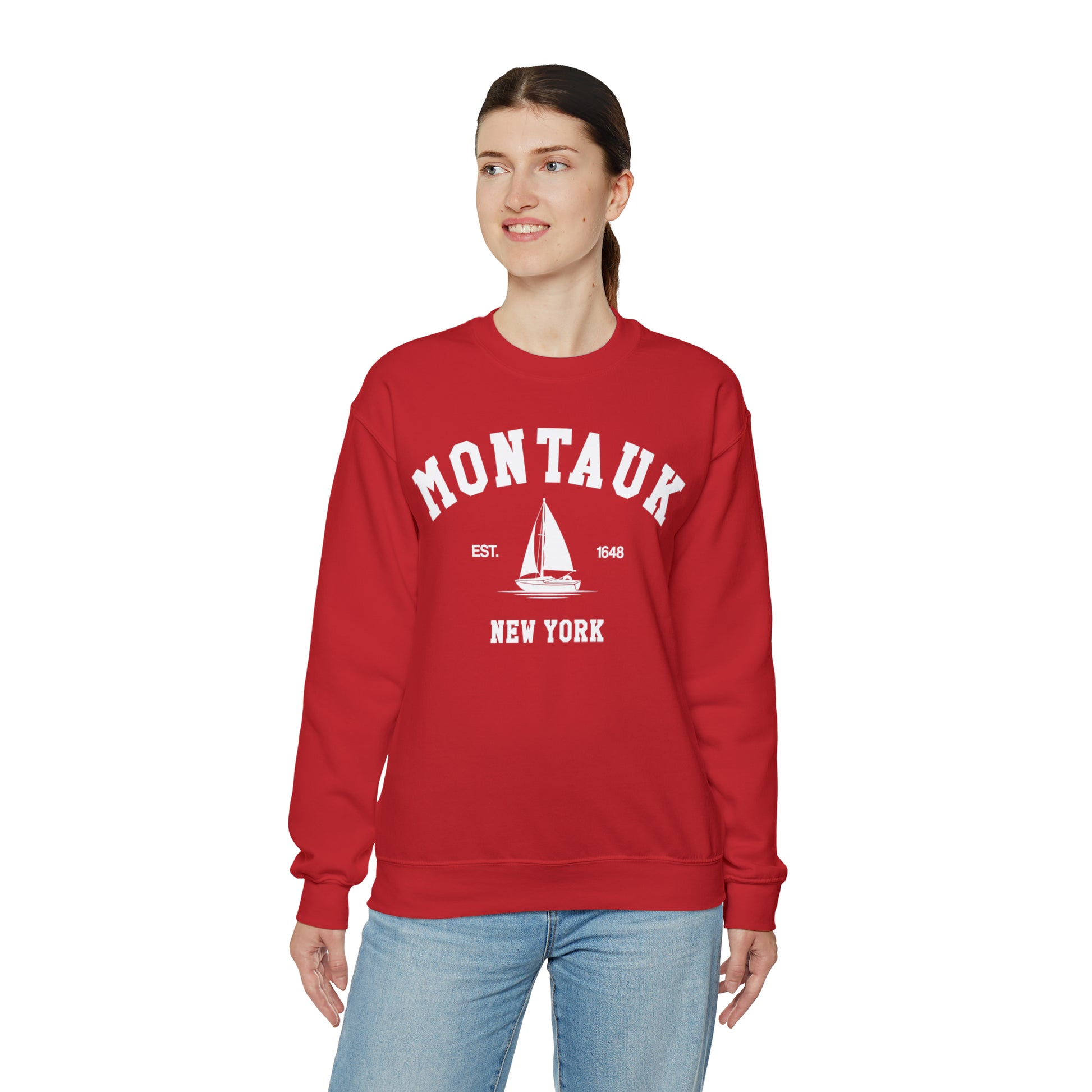 Vintage Montauk New York sweatshirt with coastal sailing graphic design.
