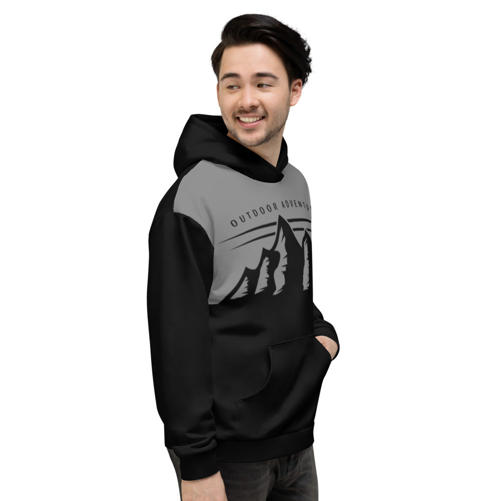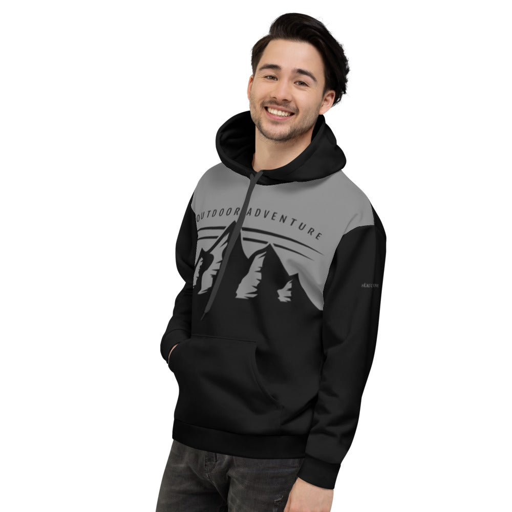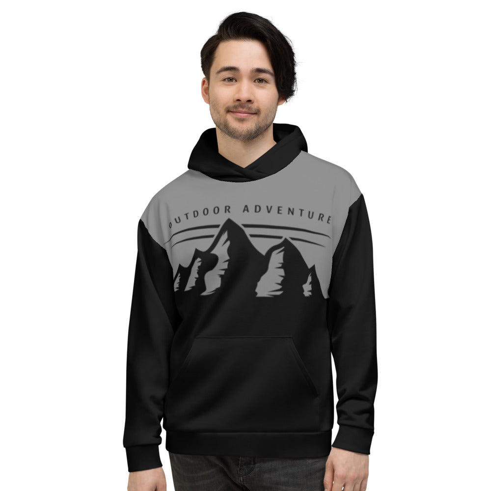 Mountain Unisex Hoodie, Outdoor Adventure Camping Black Grey Pullover Men Adult Aesthetic Graphic Hooded Sweatshirt with Pockets