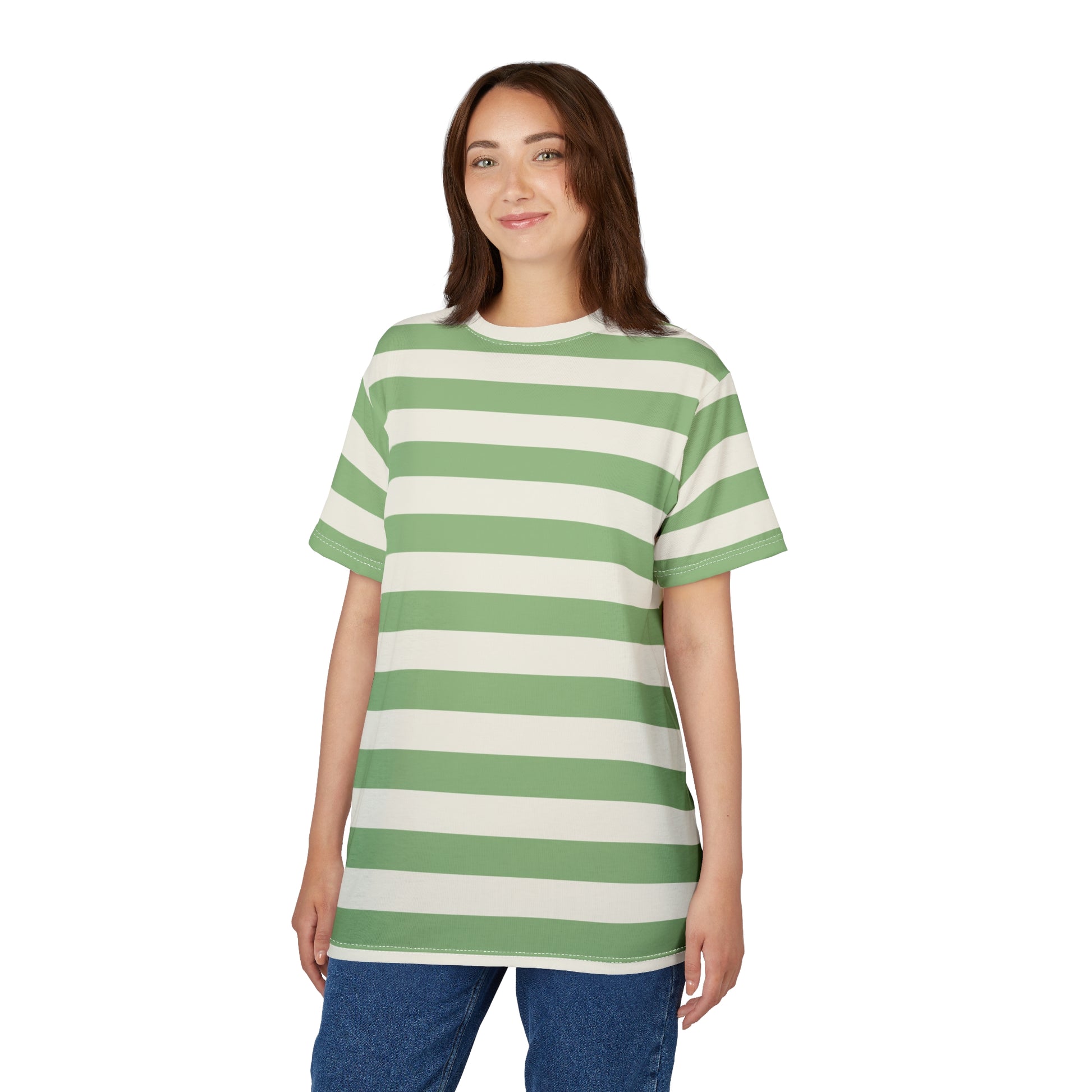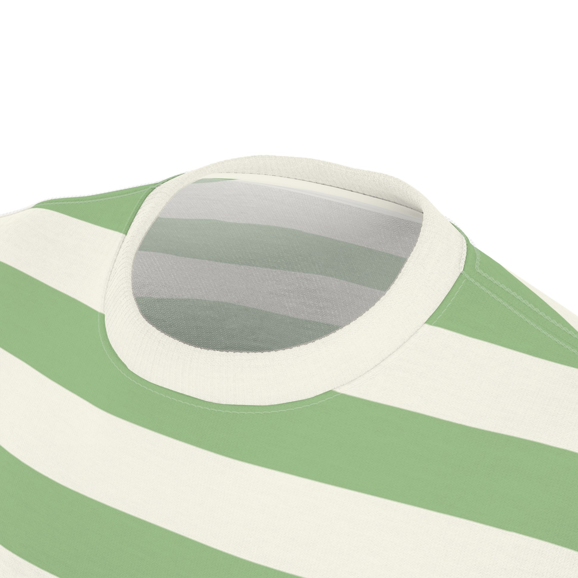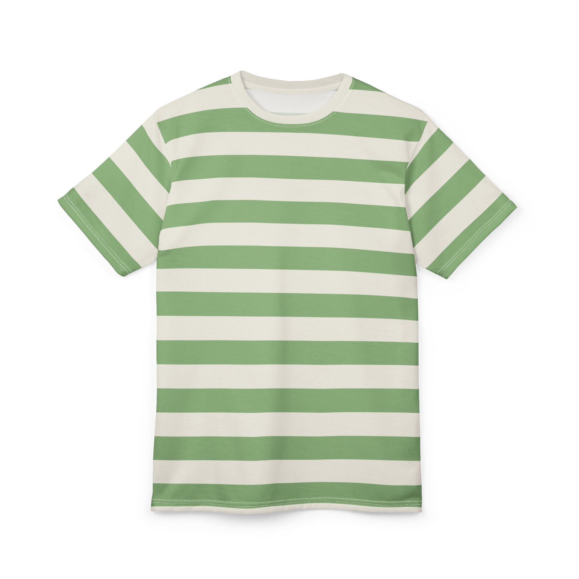 Olive Green and Cream Striped Tshirt, Off White Wide Horizontal Stripe Designer Aesthetic Crewneck Men Women Tee Top Short Sleeve Shirt