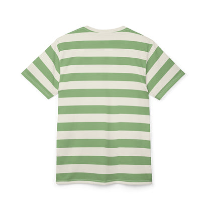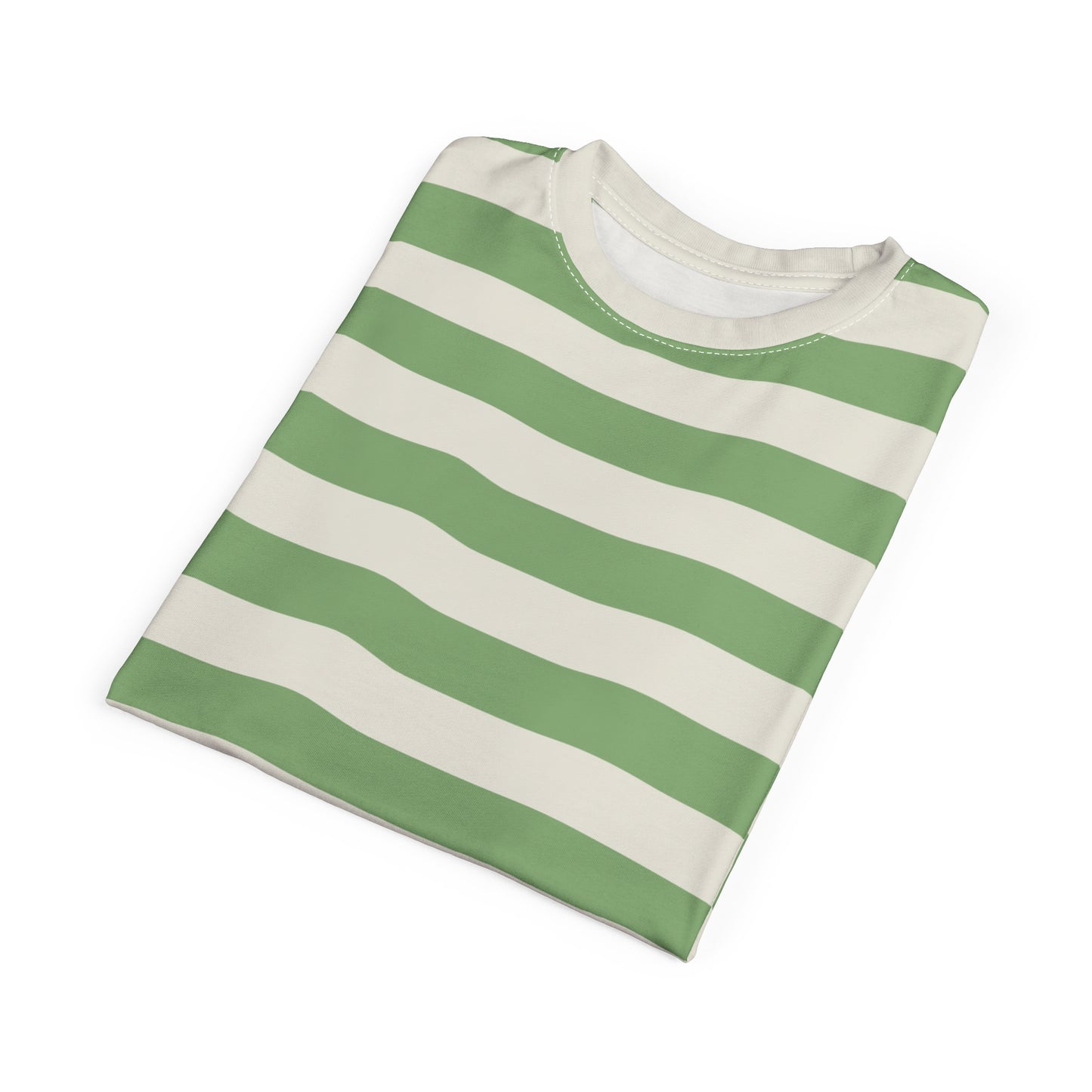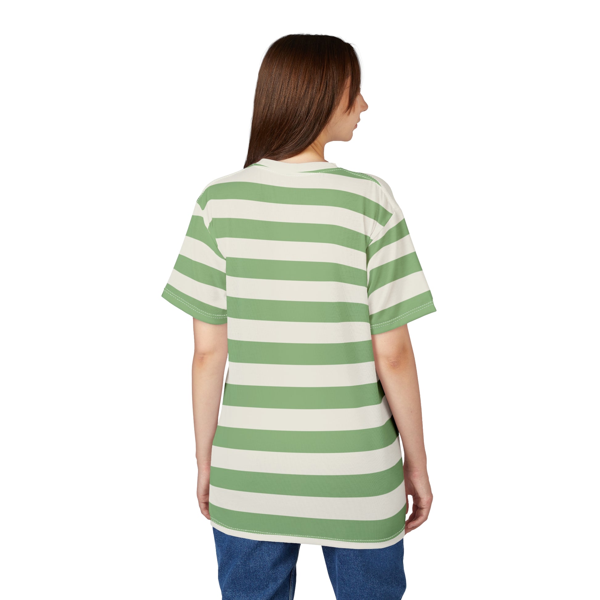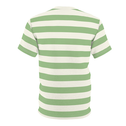 Olive Green and Cream Striped Tshirt, Off White Wide Horizontal Stripe Designer Aesthetic Crewneck Men Women Tee Top Short Sleeve Shirt