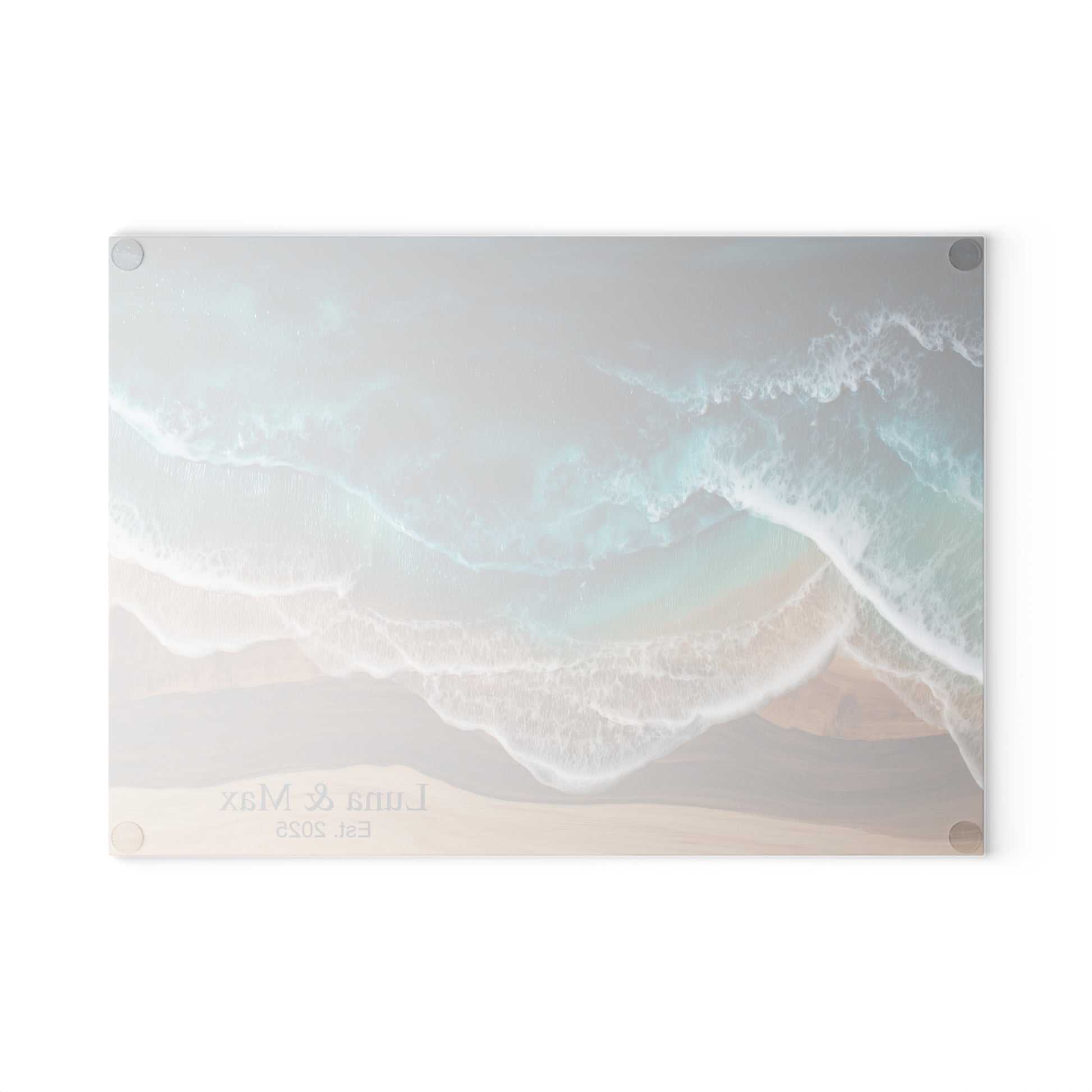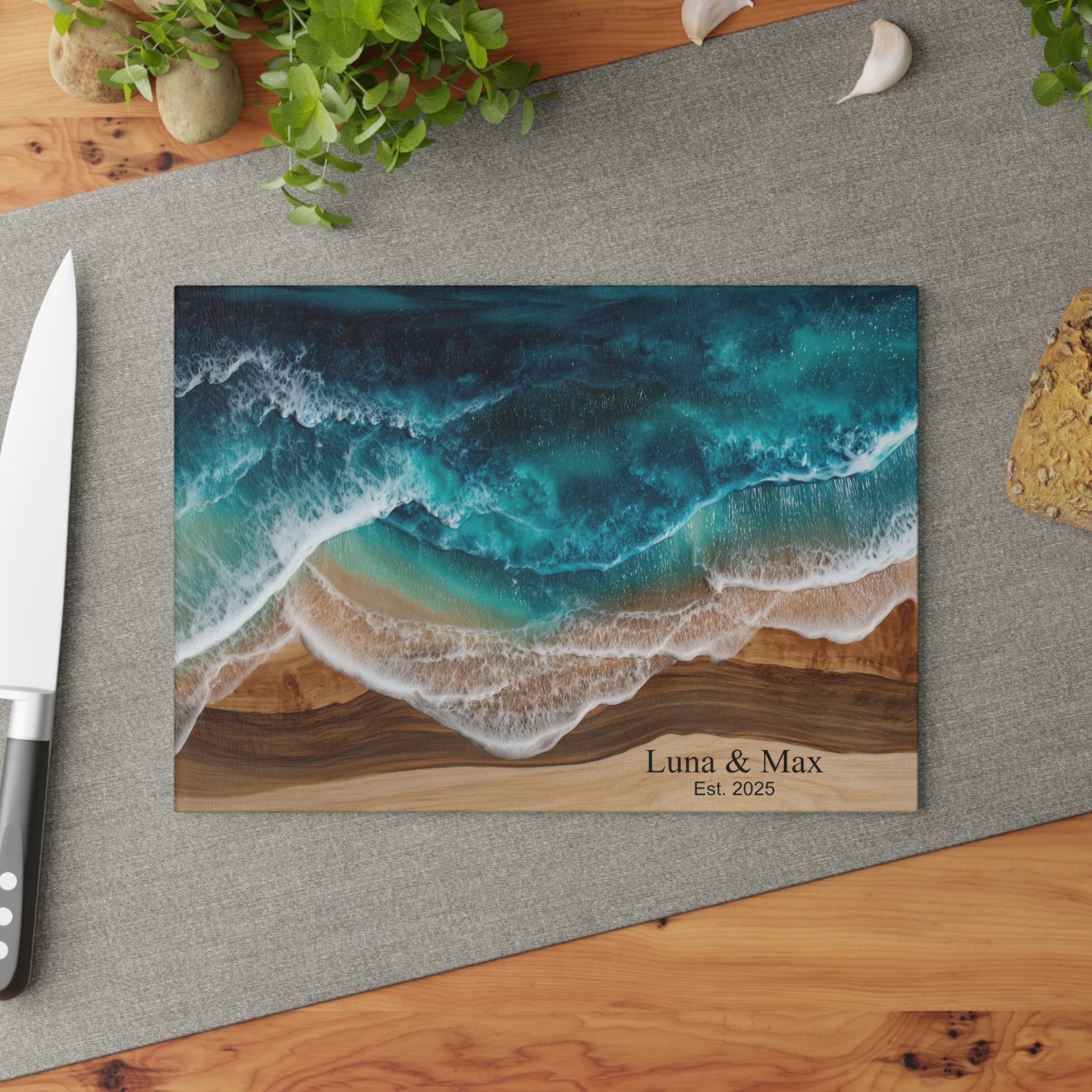 Personalized Glass Cutting Board, Custom Anniversary Coastal Wood Epoxy Charcuterie Chopping Tempered Small Large Kitchen Ocean Couples