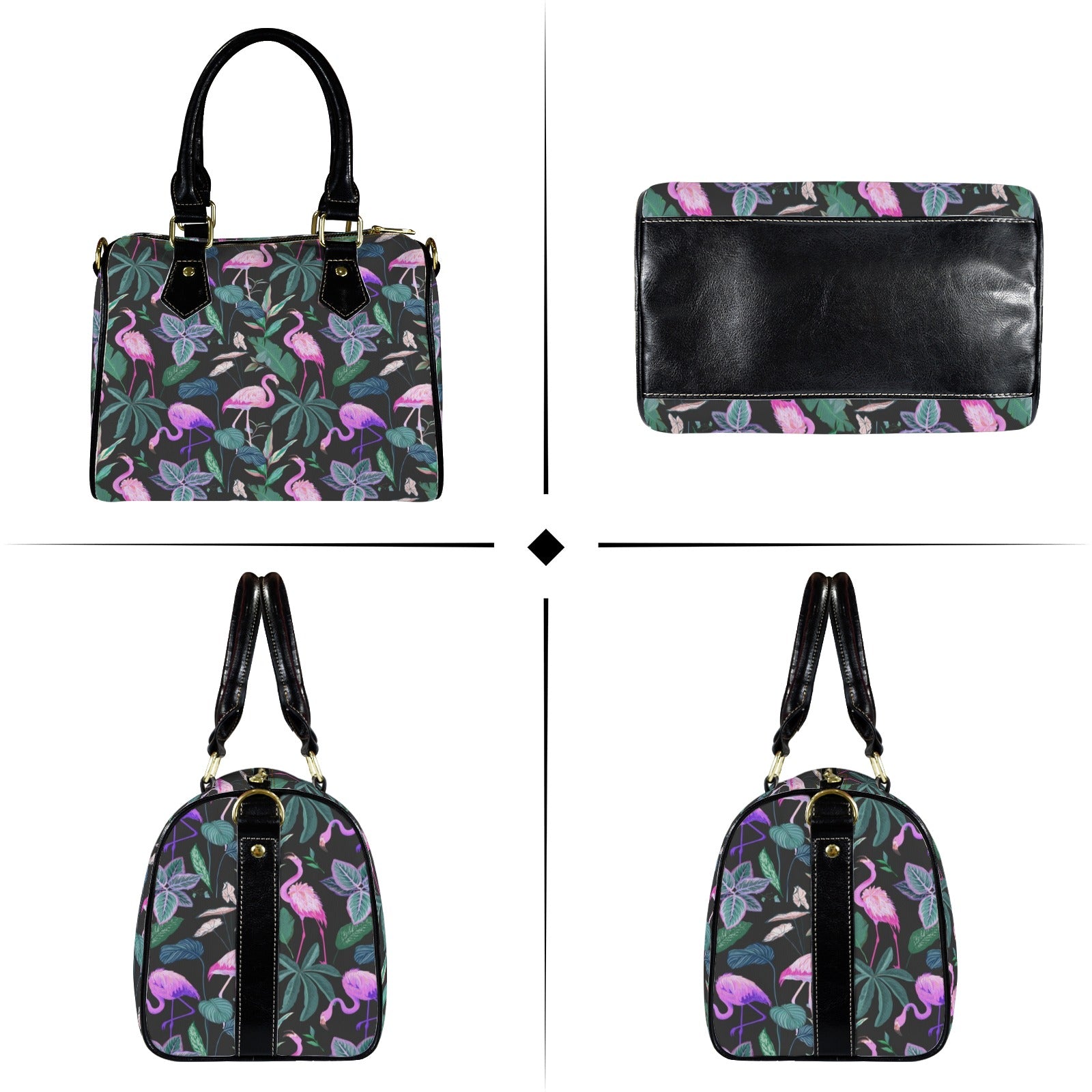 Pink Flamingo Purse Handbag, Palm Tree Women Ladies Print Canvas and Leather Barrel Type Designer Accessory Shoulder Crossbody Bag Gift