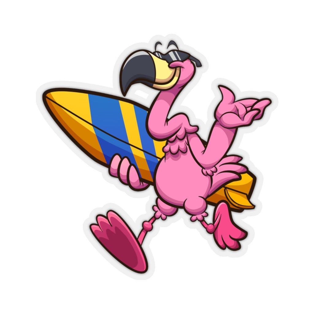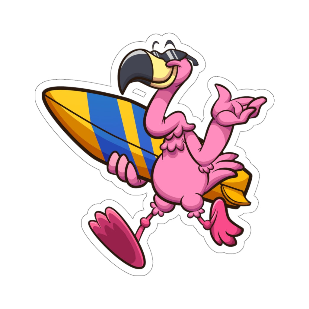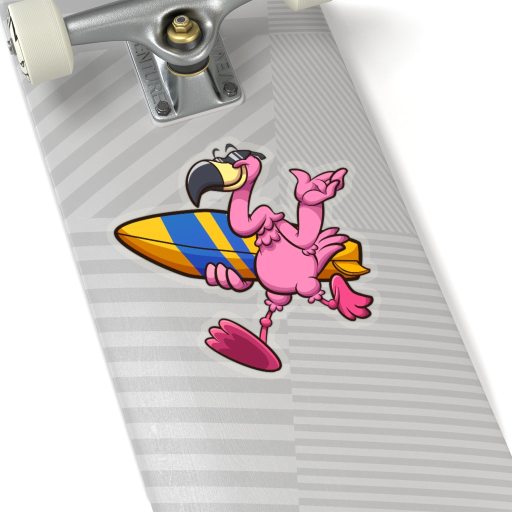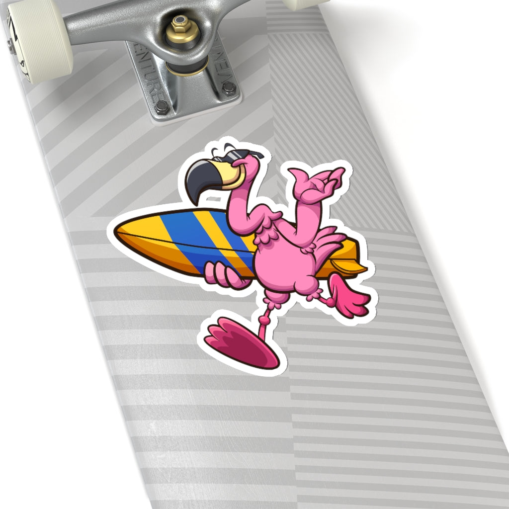 Pink Flamingo Surfing Sticker, Character Surfboard Laptop Decal Vinyl Cute Waterbottle Car Waterproof Aesthetic Die Cut Wall Mural