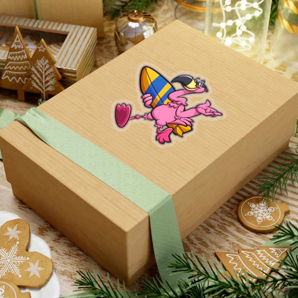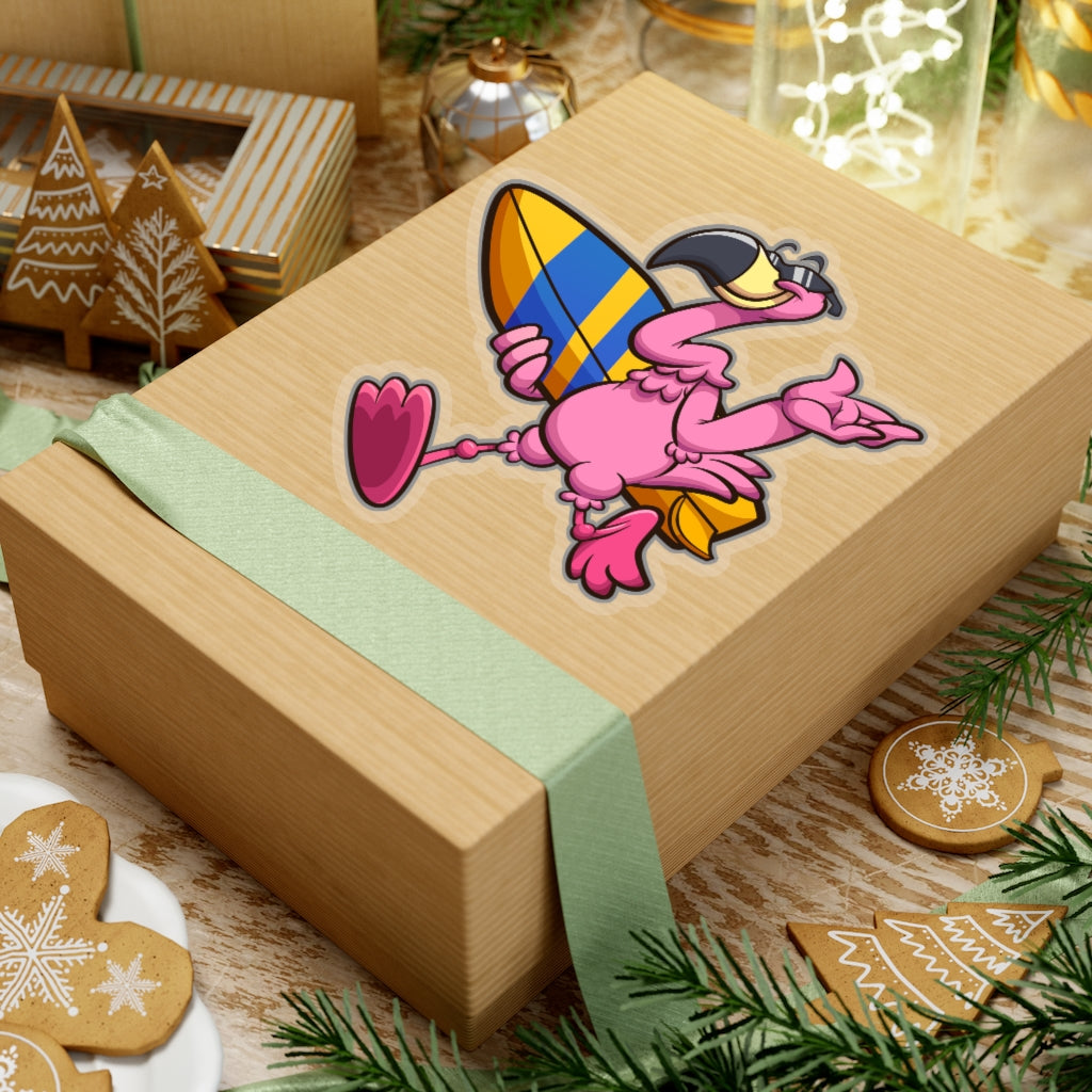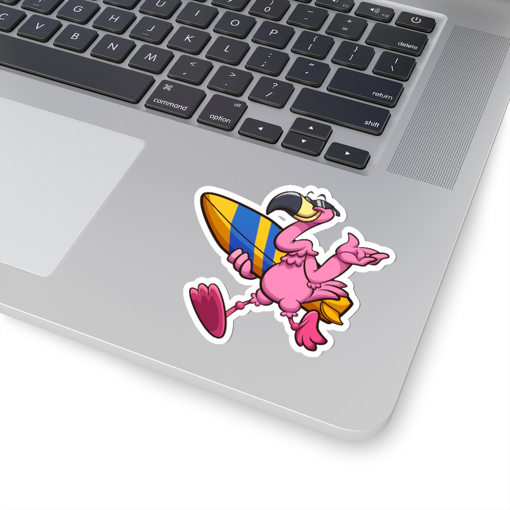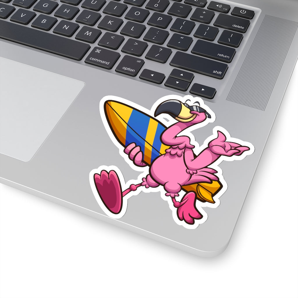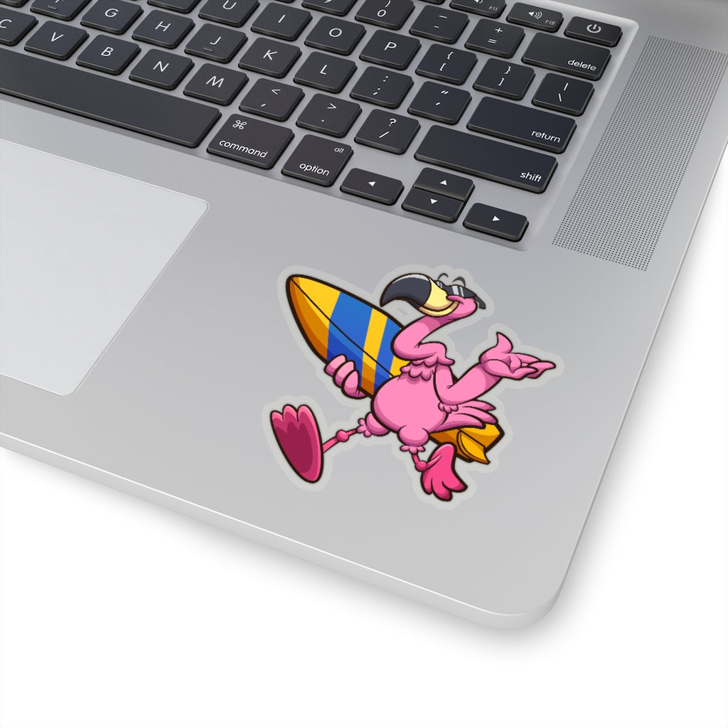 Pink Flamingo Surfing Sticker, Character Surfboard Laptop Decal Vinyl Cute Waterbottle Car Waterproof Aesthetic Die Cut Wall Mural