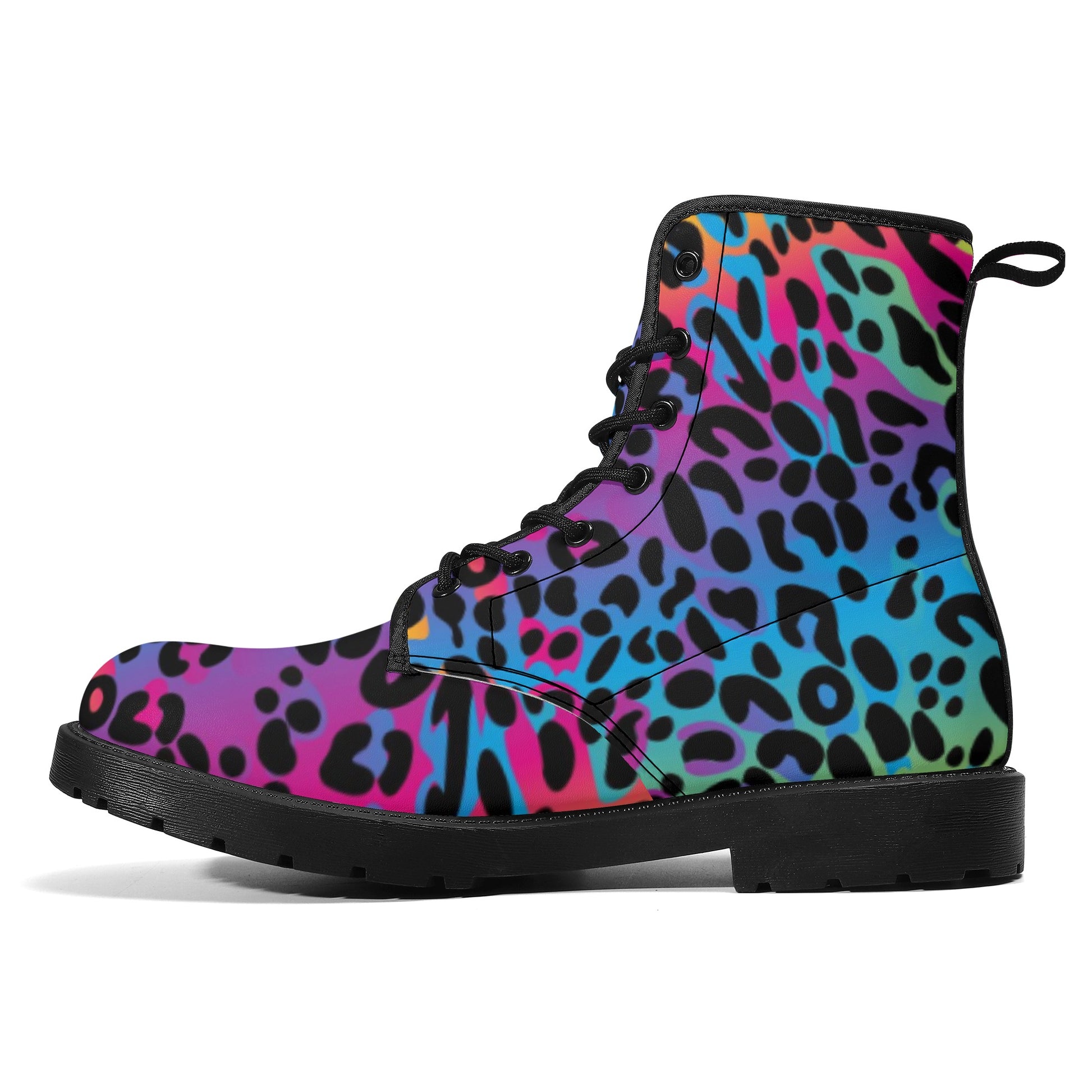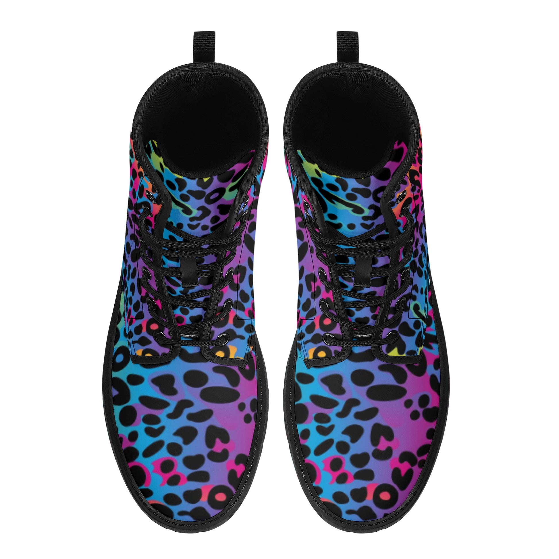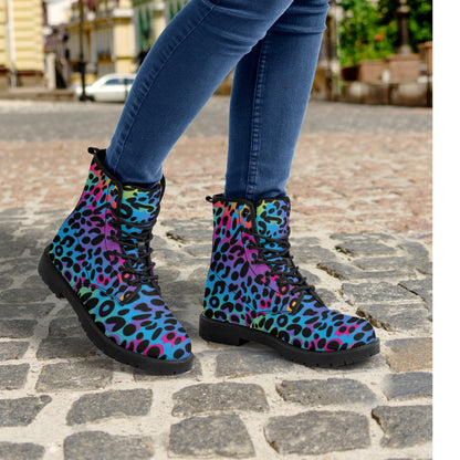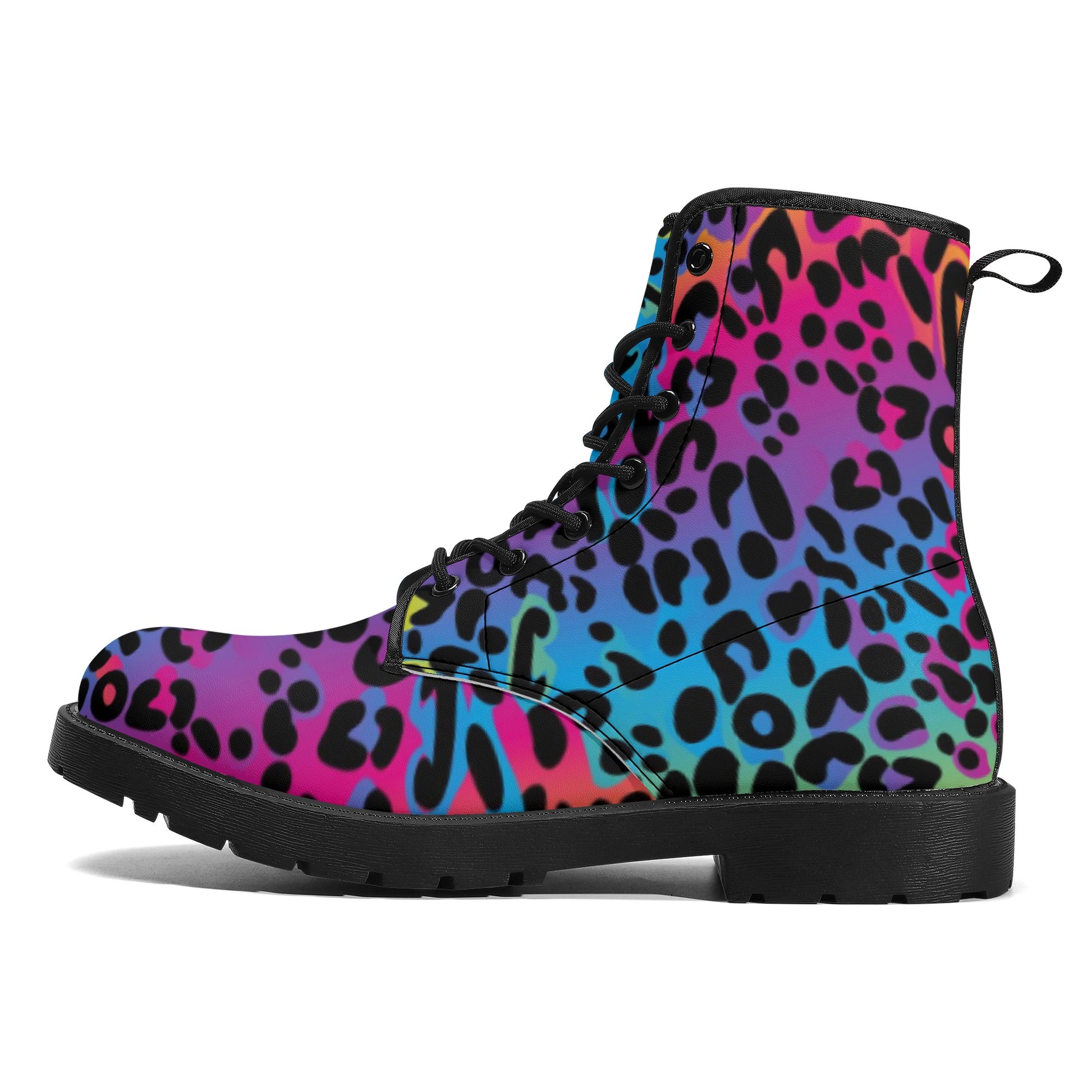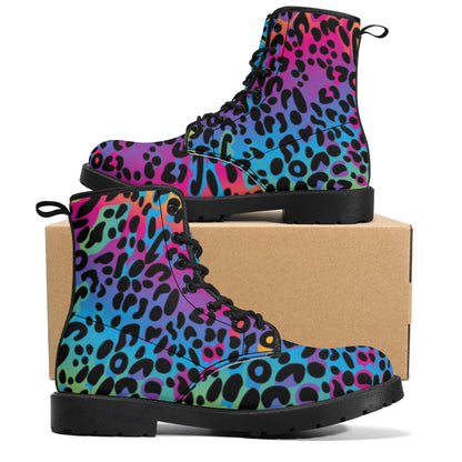 Rainbow Leopard Women's Leather Combat Boots, Animal Print Lace Up Shoes Hiking Festival Black Ankle Work Winter Casual Custom Gift