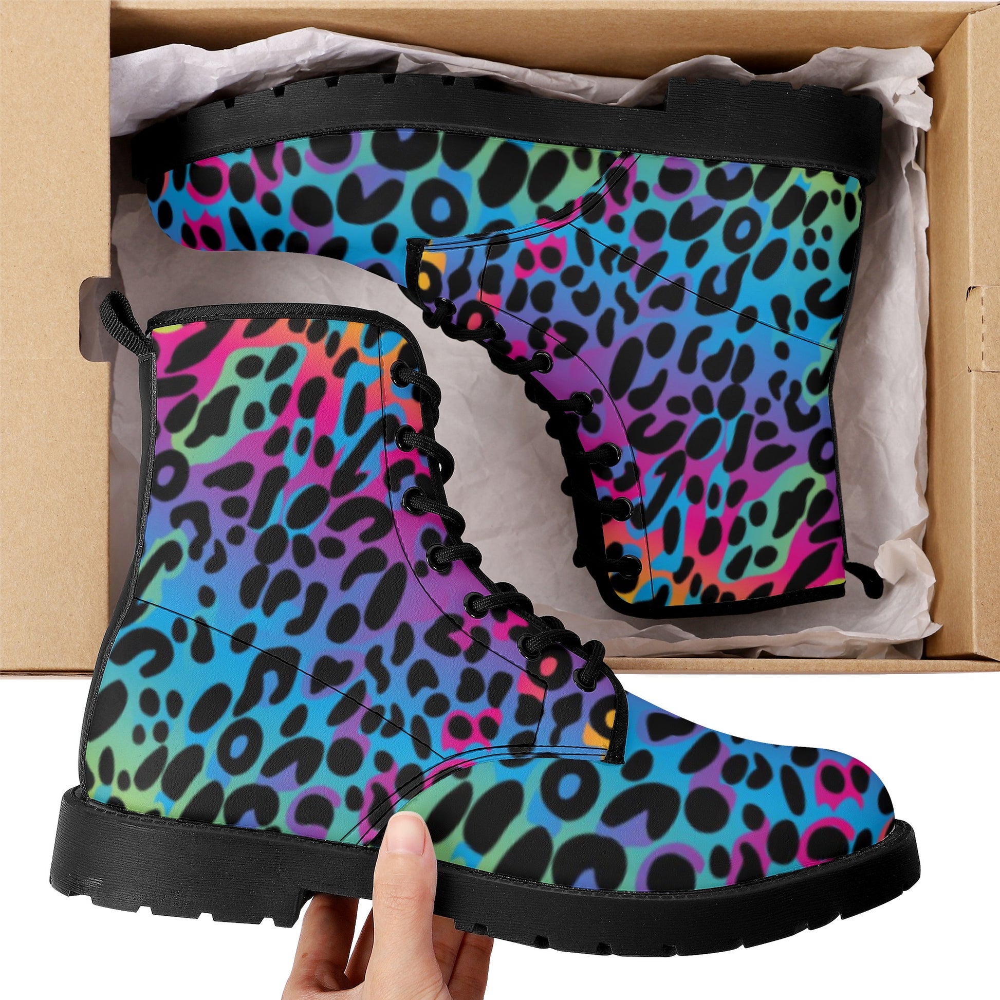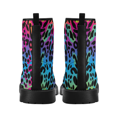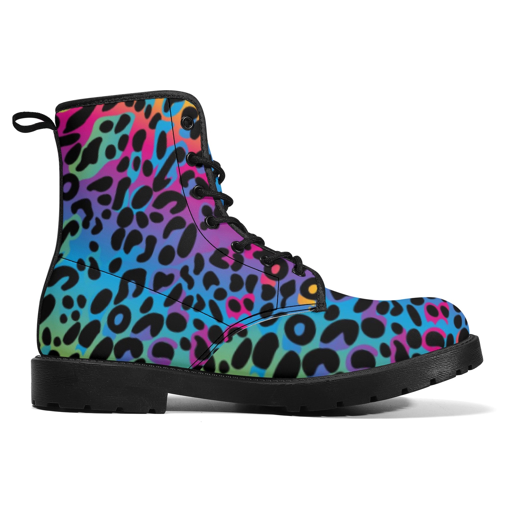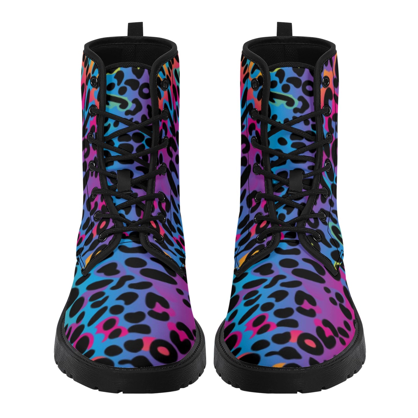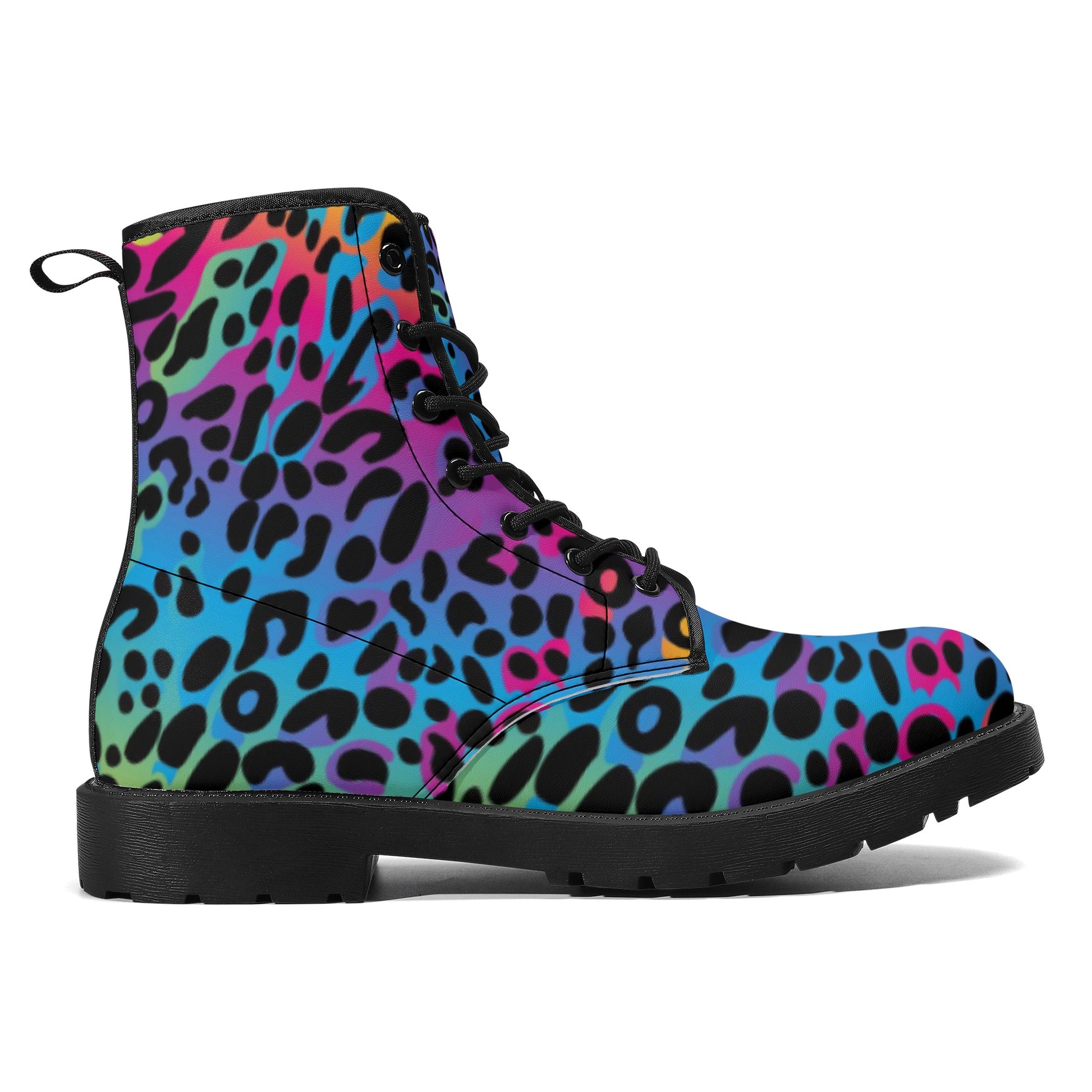 Rainbow Leopard Women's Leather Combat Boots, Animal Print Lace Up Shoes Hiking Festival Black Ankle Work Winter Casual Custom Gift