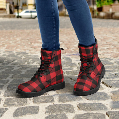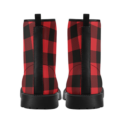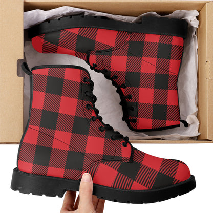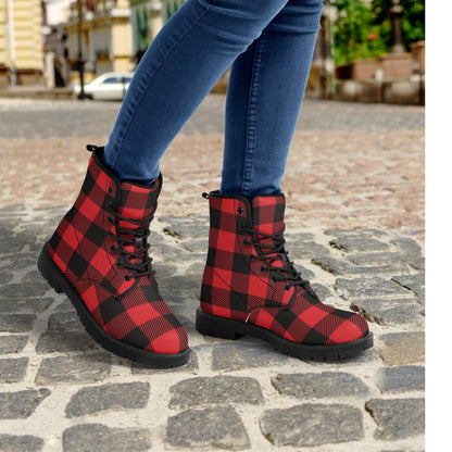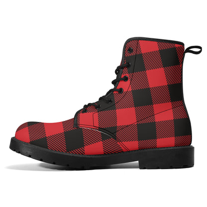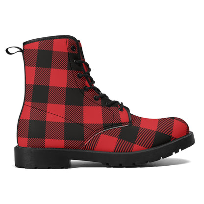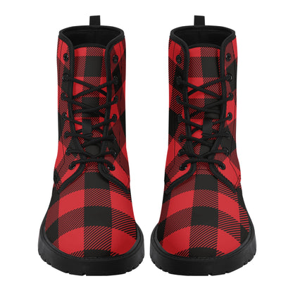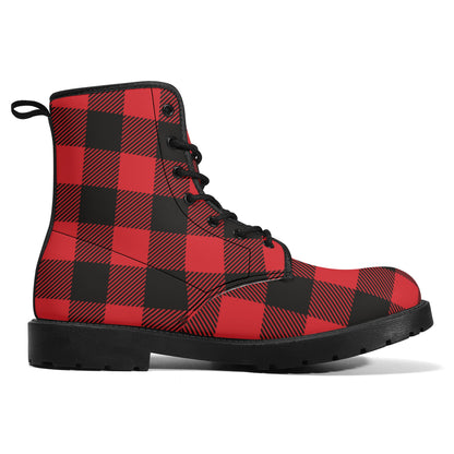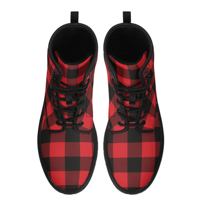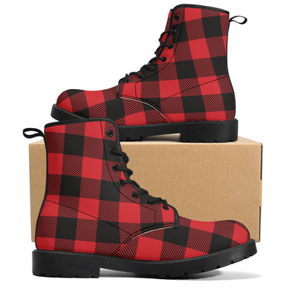 Red Buffalo Plaid Women Leather Boots, Check Vegan Lace Up Shoes Hiking Festival Black Ankle Combat Work Winter Waterproof Custom Ladies