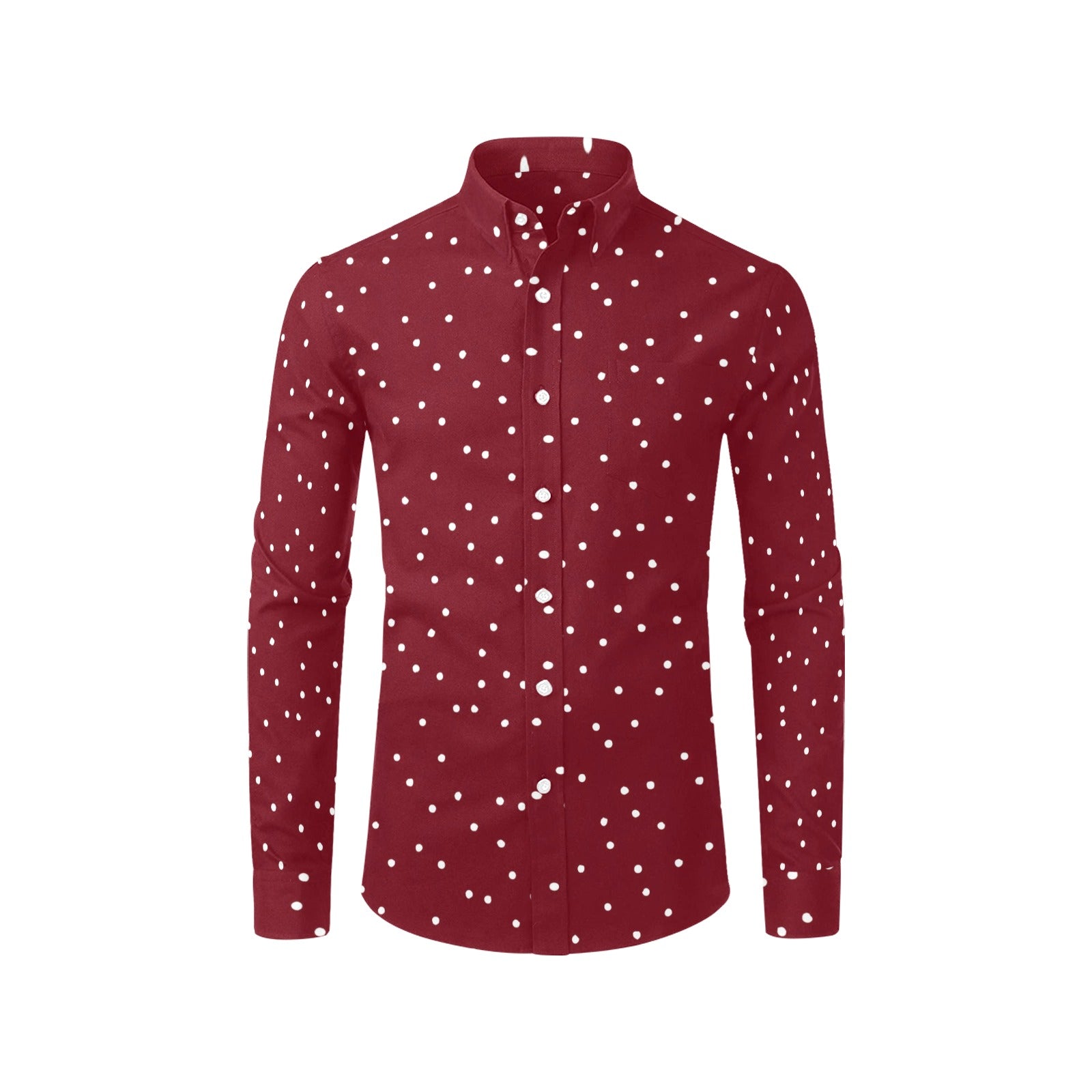 Red Long Sleeve Men Button Up Shirt, Festive White Dots Print Casual Buttoned Collared Designer Dress Shirt with Chest Pocket Guys Male