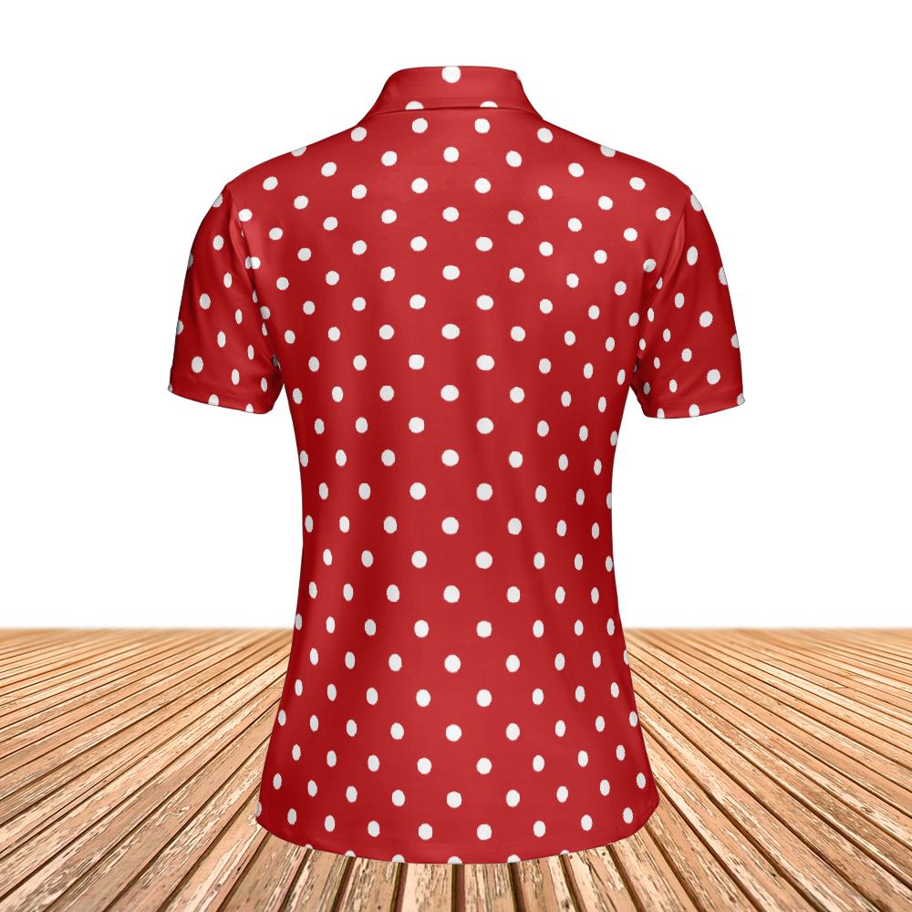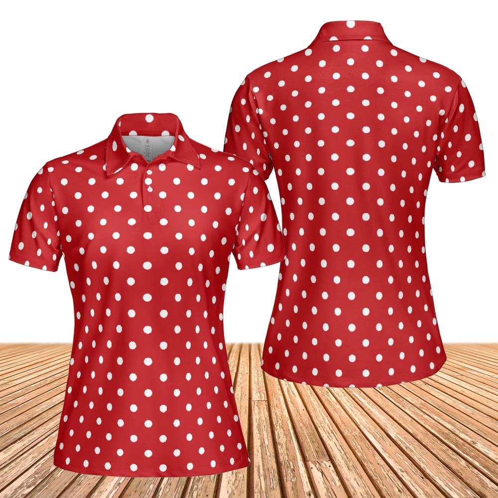 Red Polka Dots Women Polo Shirt, Vintage Retro Ladies Slim Fit Short Sleeve Collared Casual Summer Buttoned Down Up Sports Golf Tee Top