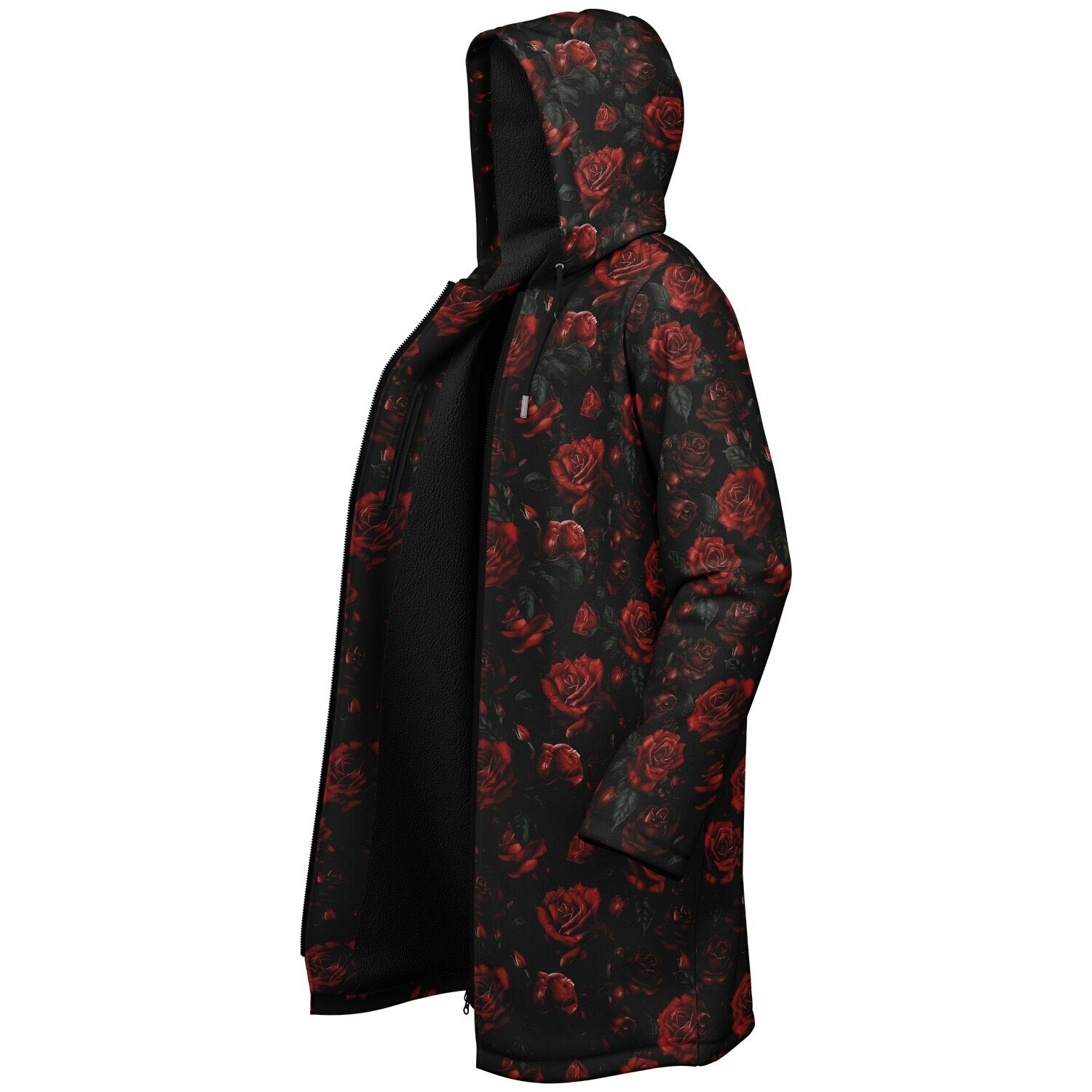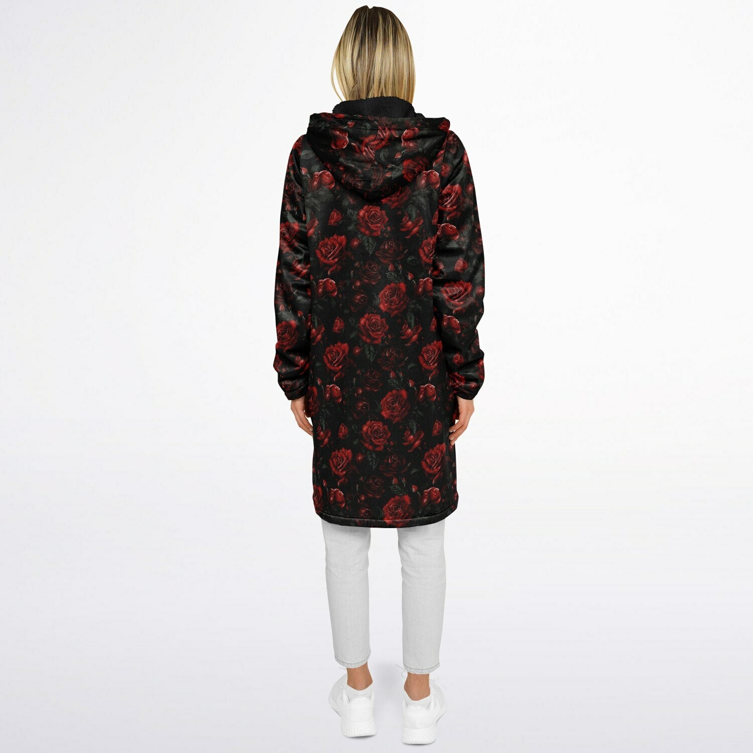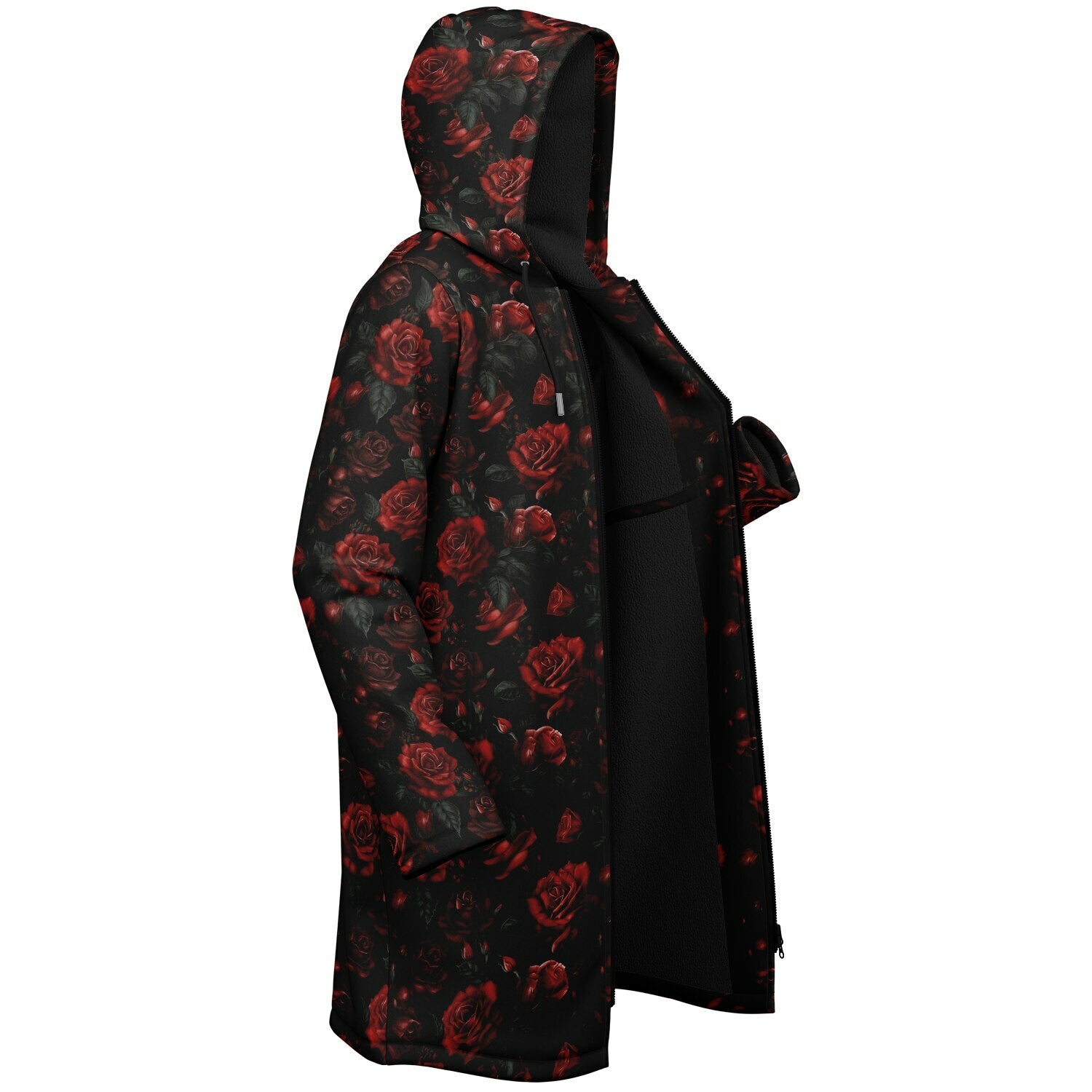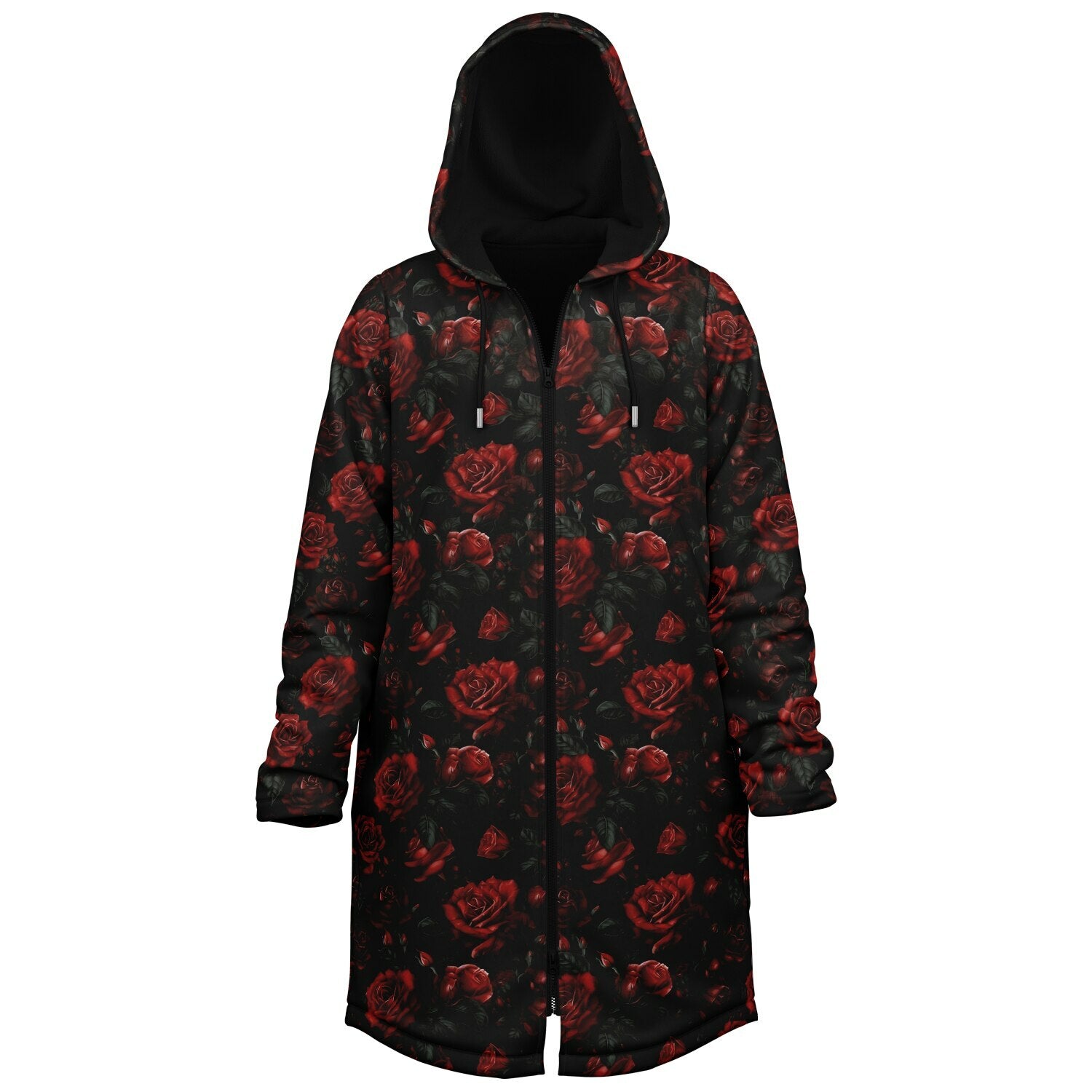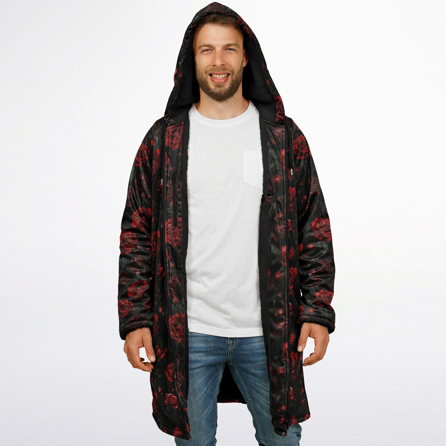 Red Roses Hooded Fleece Jacket, Black Zipper Coat Cloak Men Women Ladies Long Winter Warm Mink Hooded Parka Festival Wearable Cape Pockets