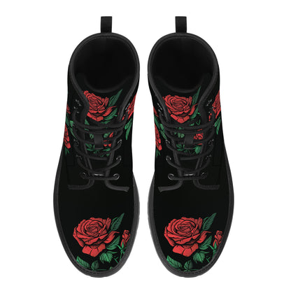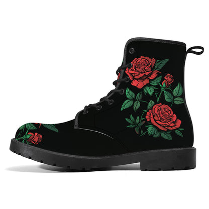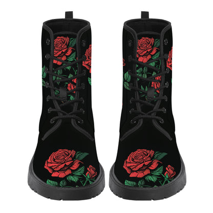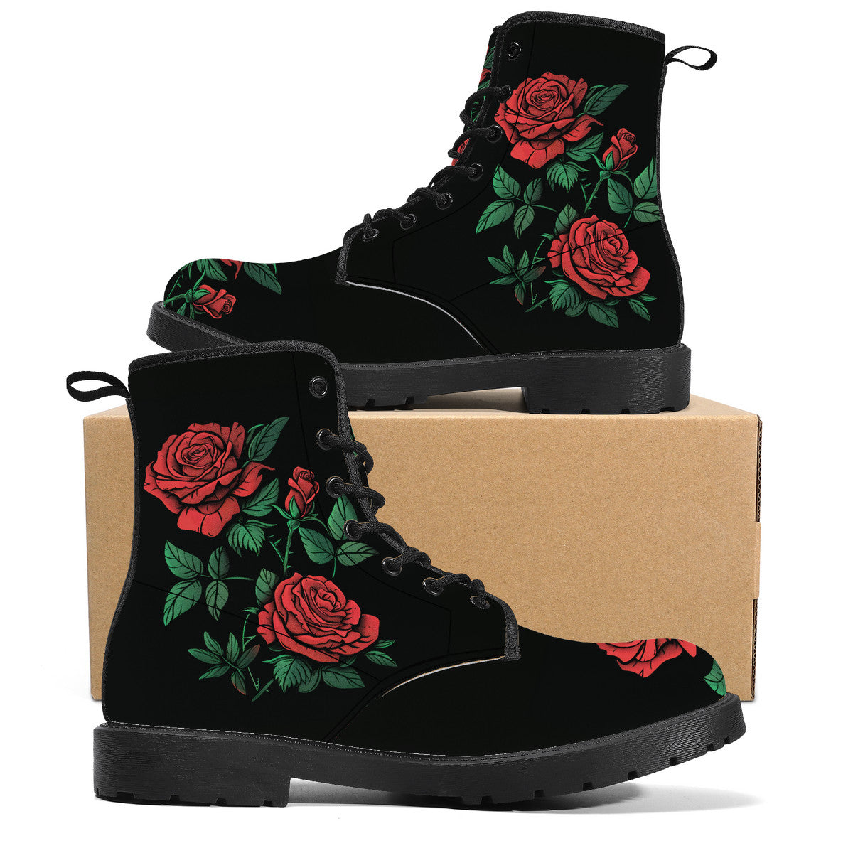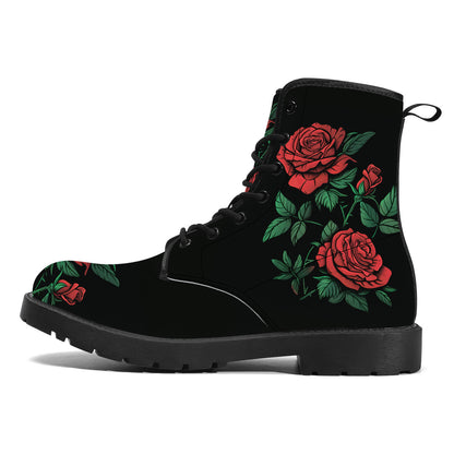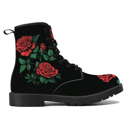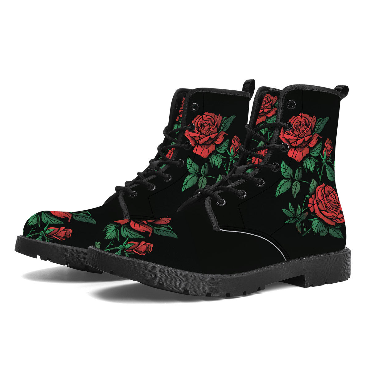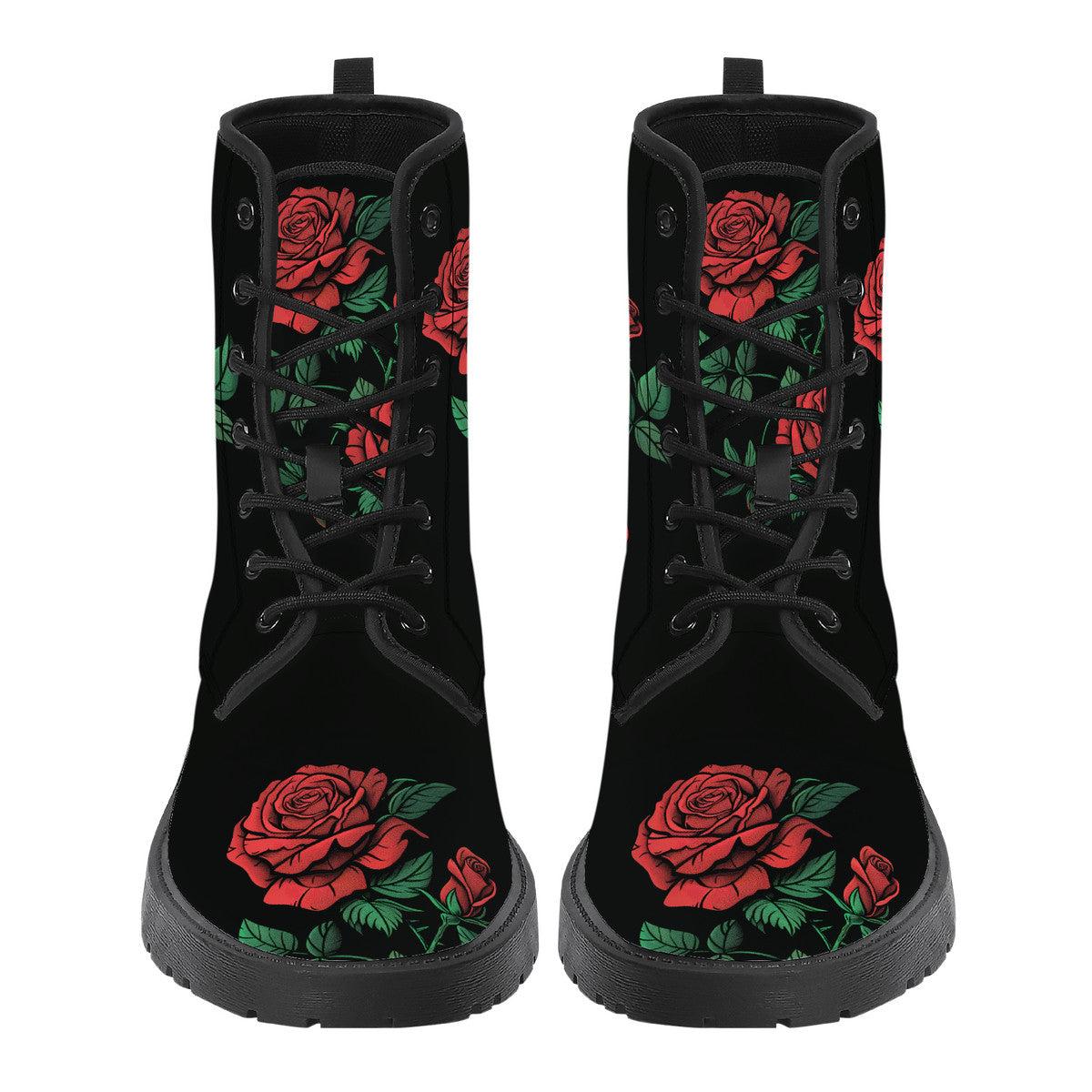 Red Roses Boots, Floral Flowers Women Men Black Vegan Leather Lace Up Shoes Print Ankle Punk Combat Gothic Winter Ladies Designer