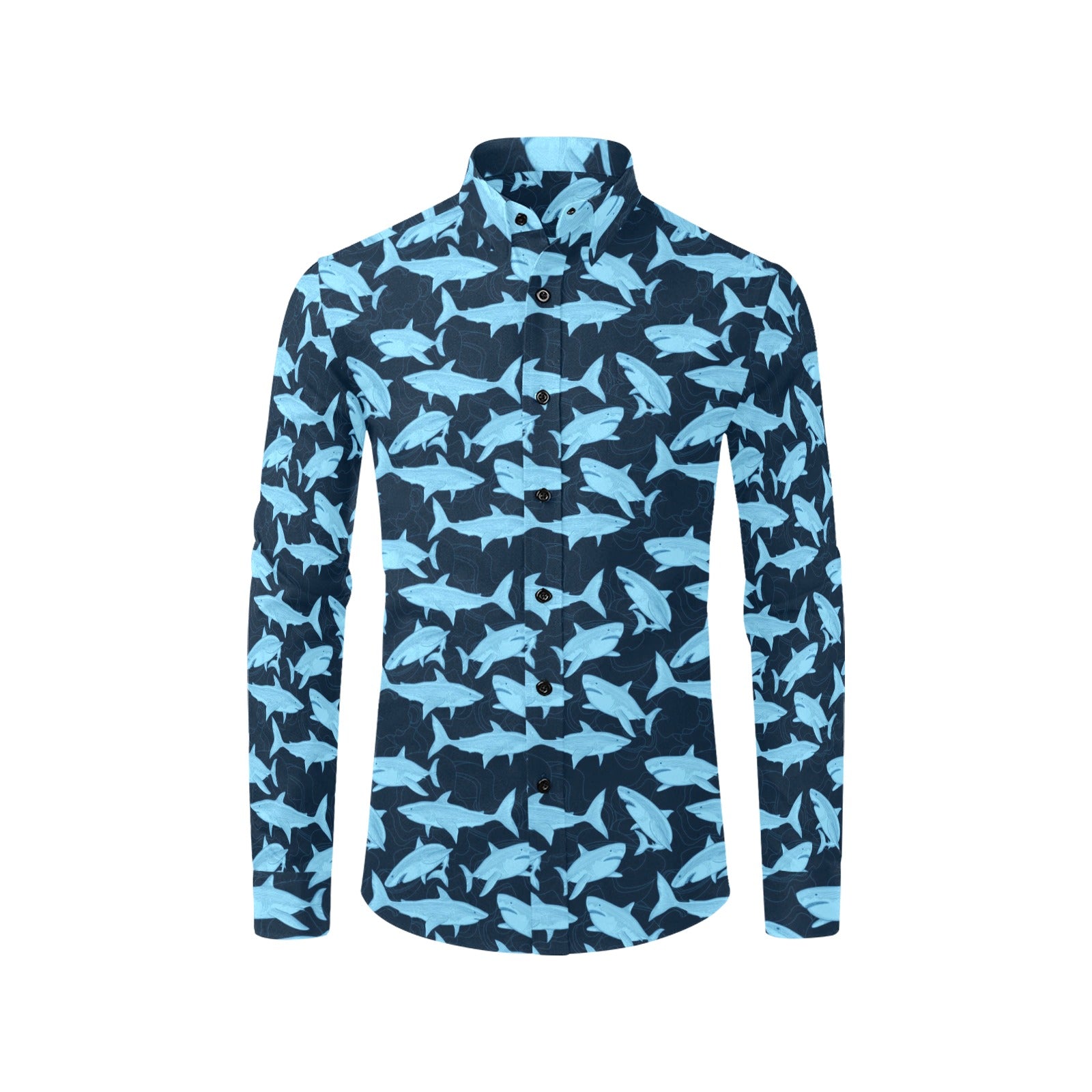 Shark Long Sleeve Men Button Up Shirt, Marine Animal Print Unique Buttoned Down Collar Business Casual Dress Shirt Male with Chest Pocket