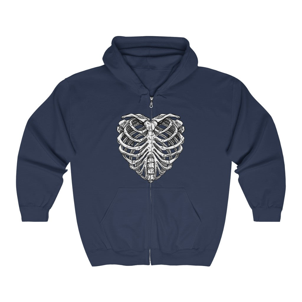 Skeleton Heart Hoodie Zip Up, Skull Rib Cage Bones Halloween Gothic Y2K Full Zip Men Women Adult Aesthetic Graphic Hooded Sweatshirt Pockets