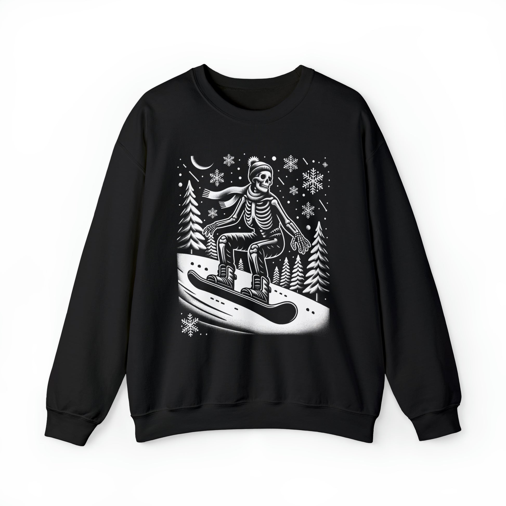 Skeleton Snowboarder Sweatshirt, Ski Winter Snow Boarding Sports Snowflakes Graphic Crewneck Fleece Cotton Sweater Jumper Pullover Men Women