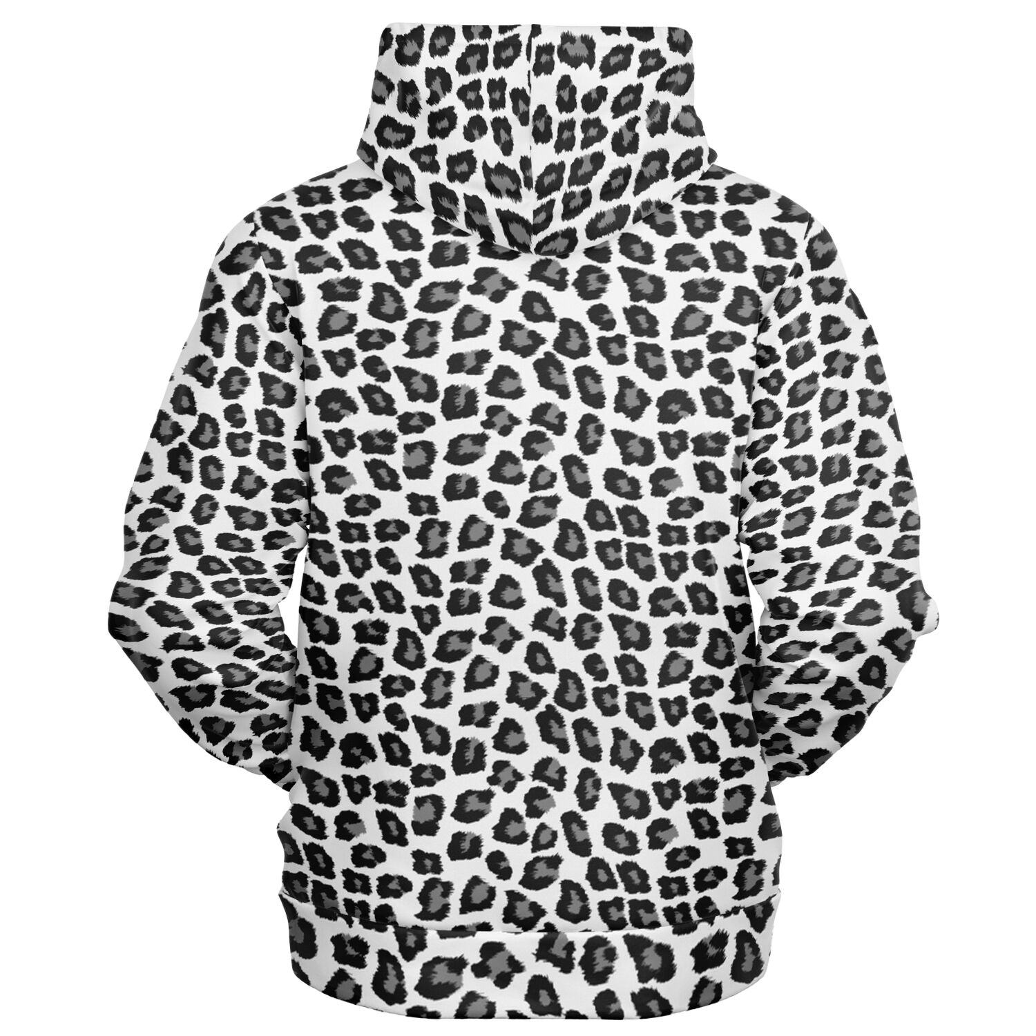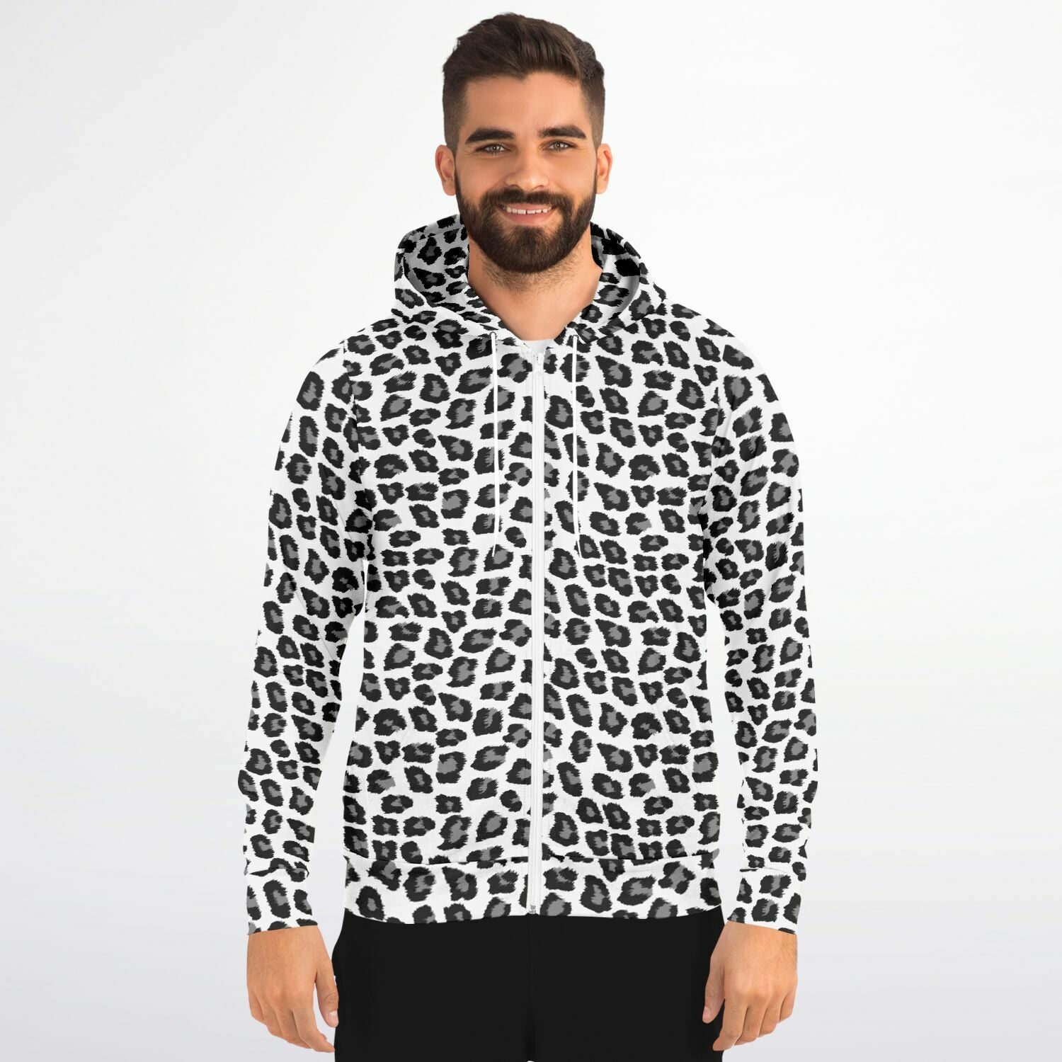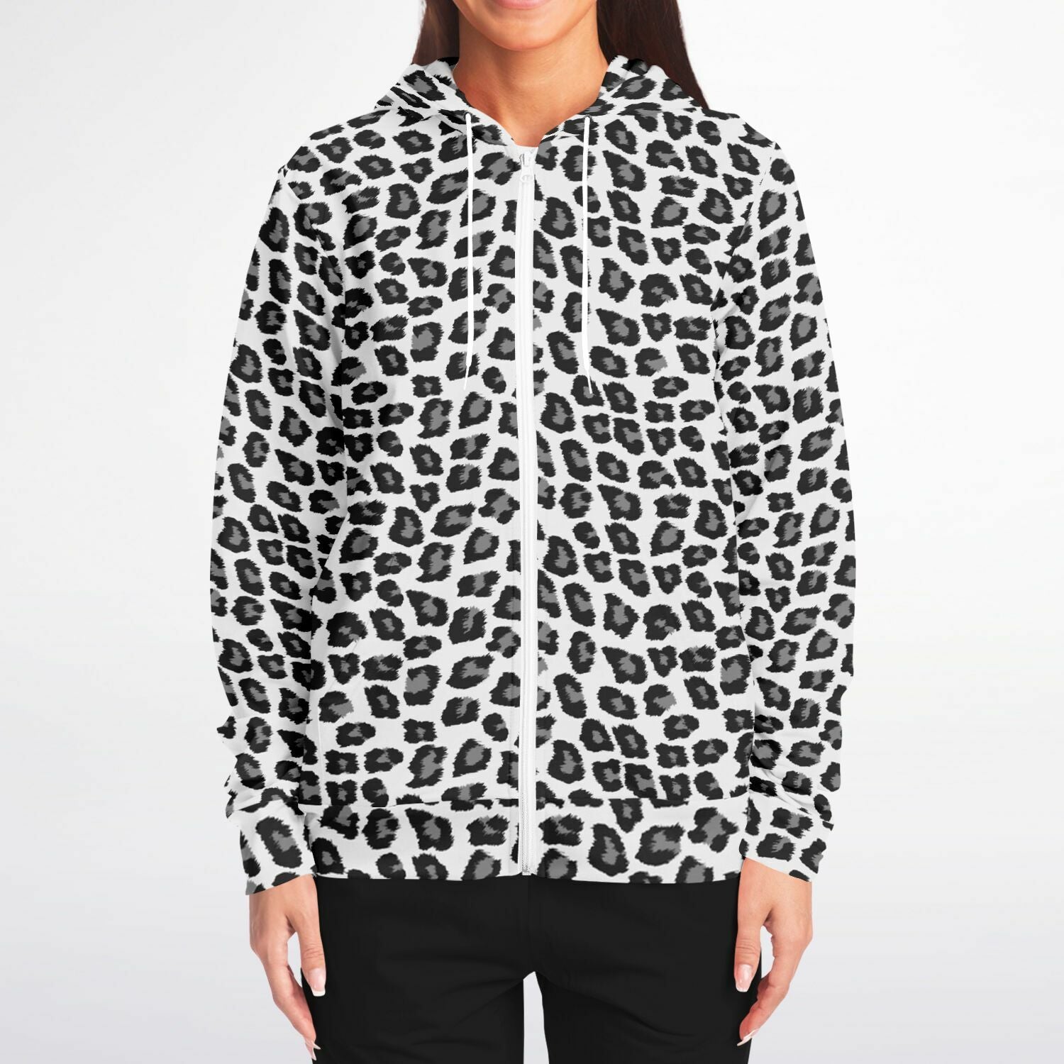 Snow Leopard Zip Up Hoodie, Black White Animal Print Full Zipper Pocket Men Women Unisex Adult Graphic Cotton Fleece Hooded Sweatshirt