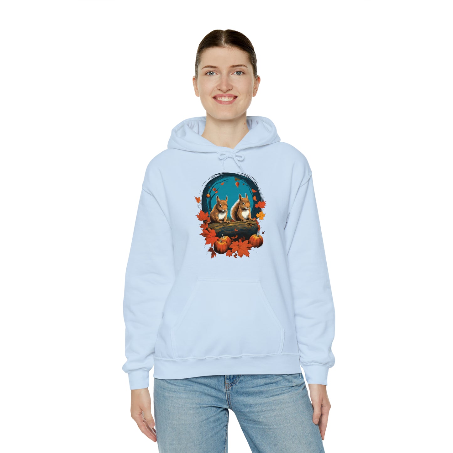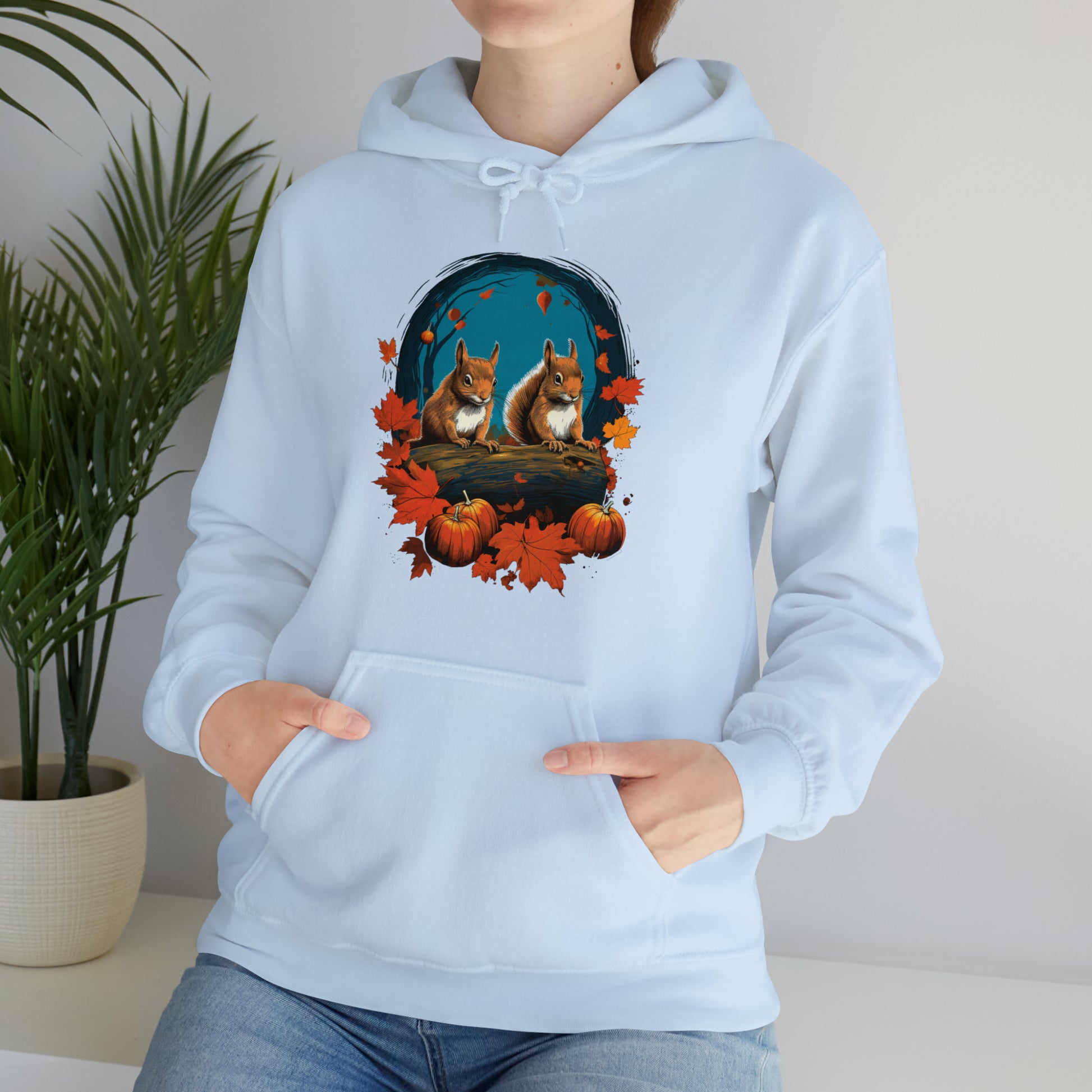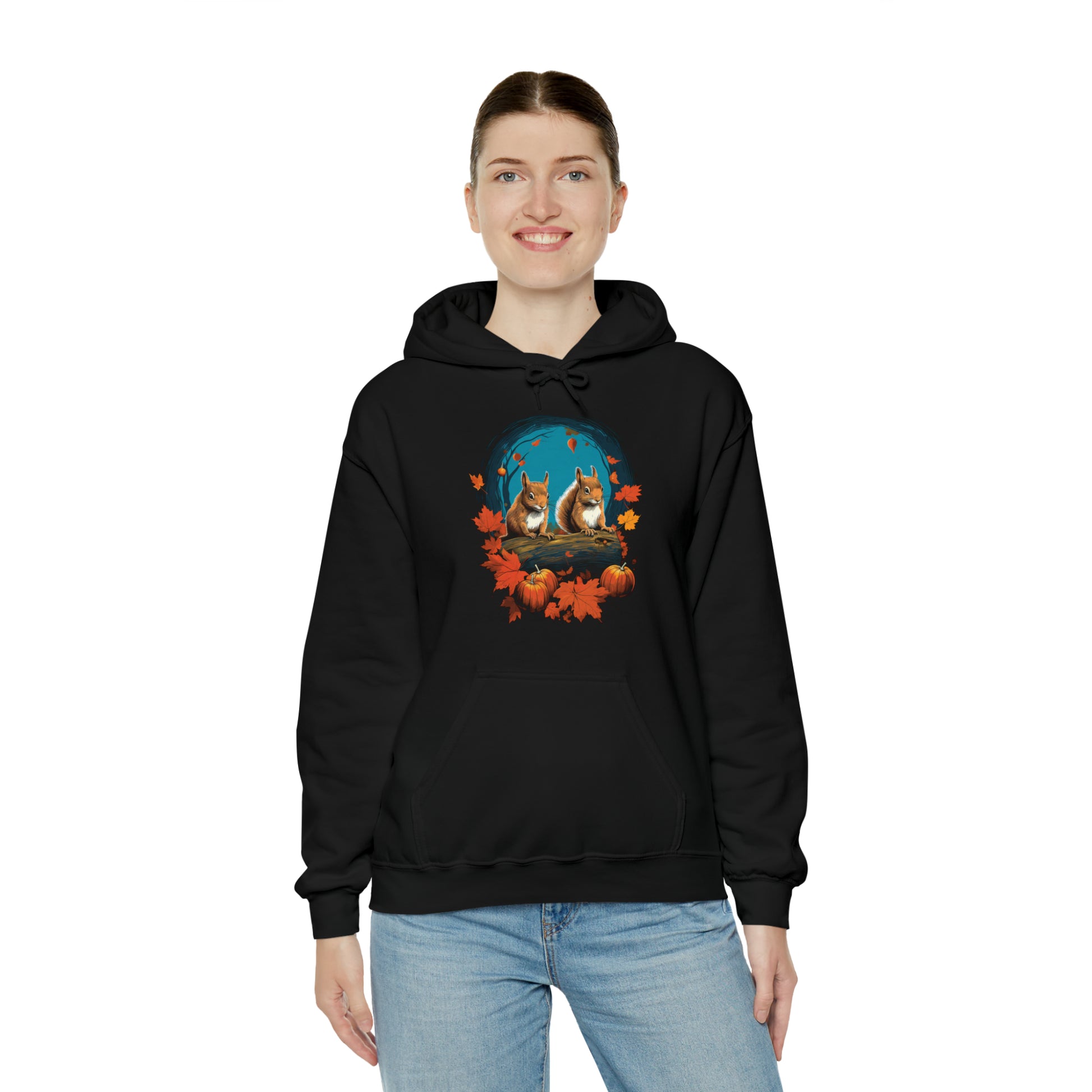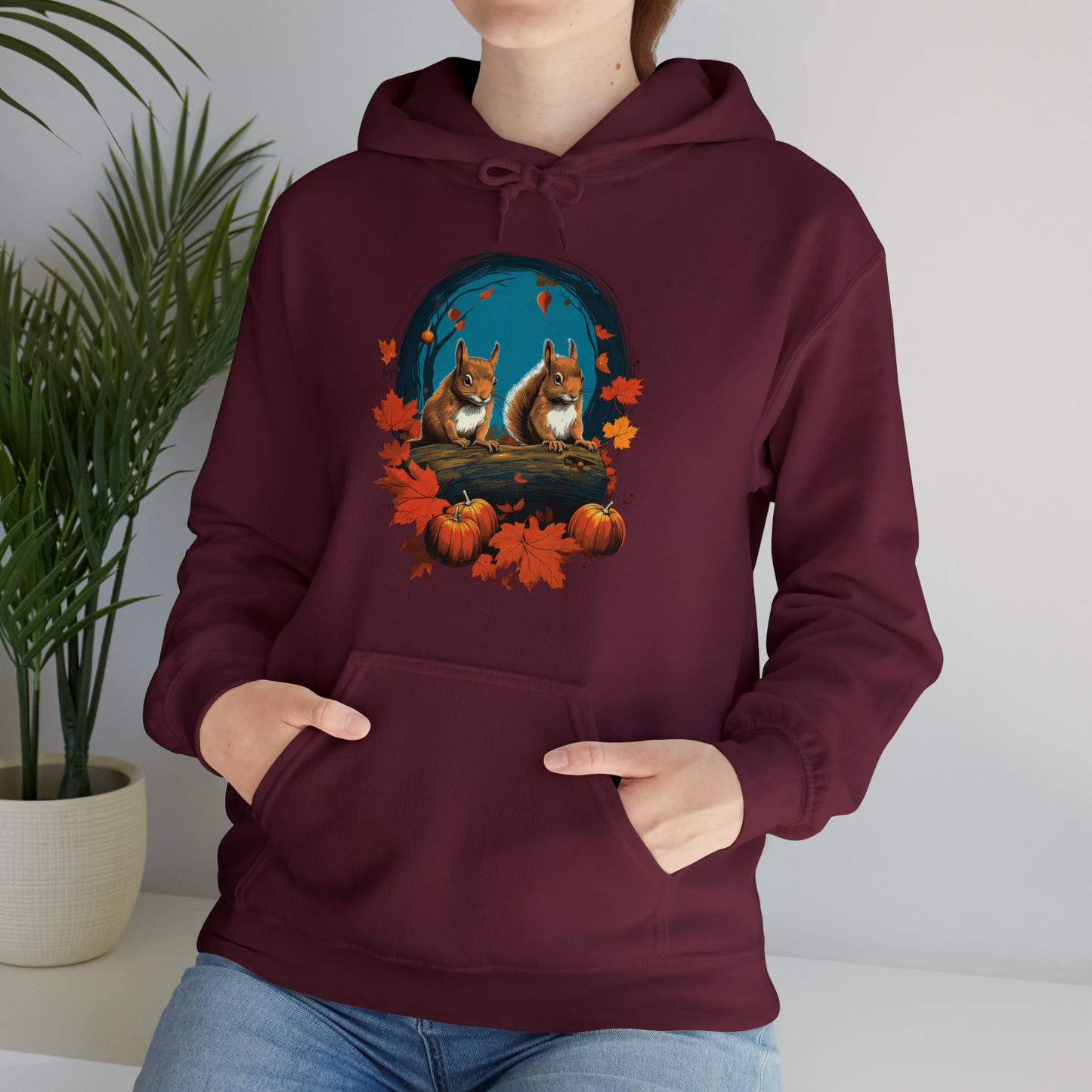 Squirrels Hoodie, Fall Autumn Leaves Pumpkins Animals Pullover Men Women Adult Aesthetic Graphic Cotton Hooded Sweatshirt Pockets