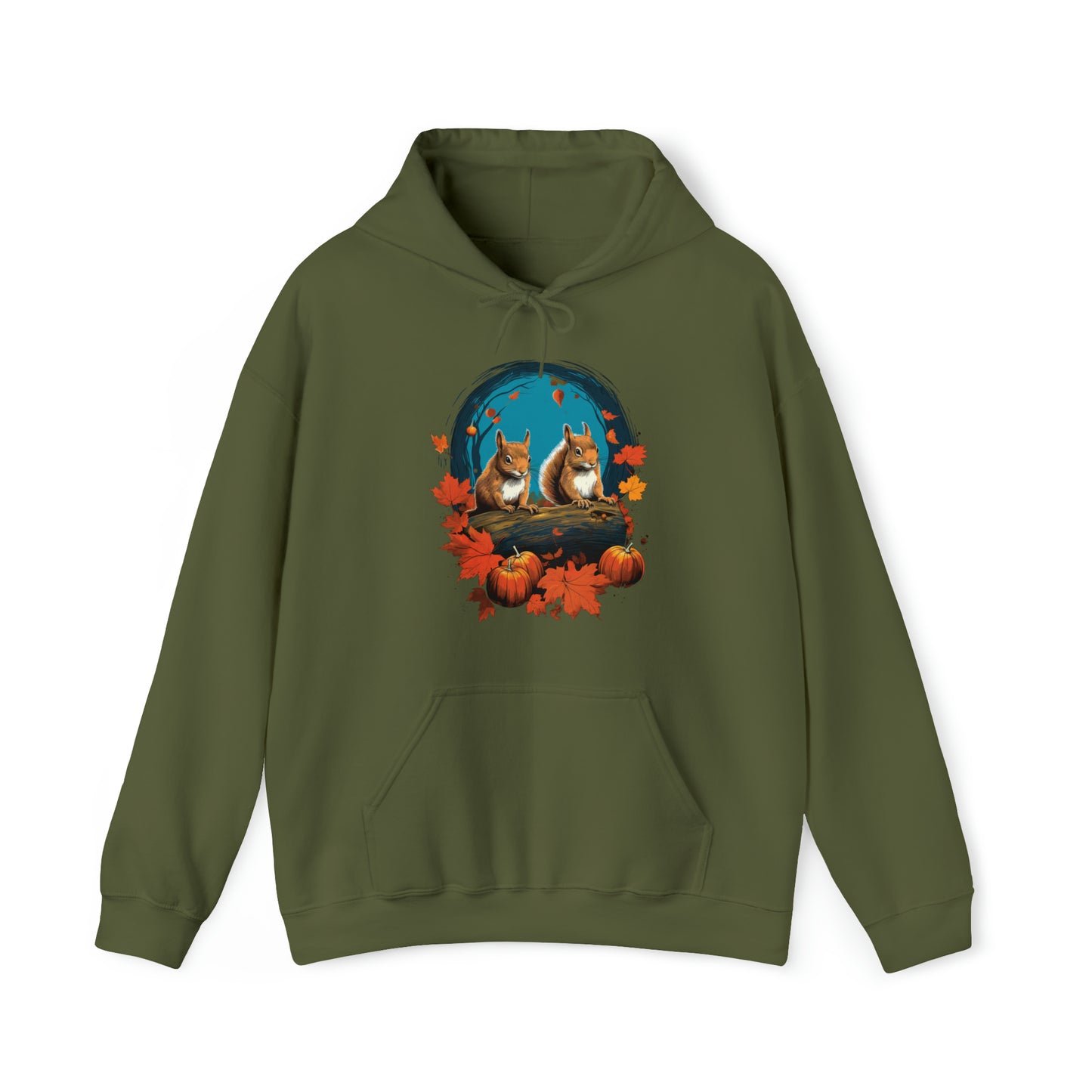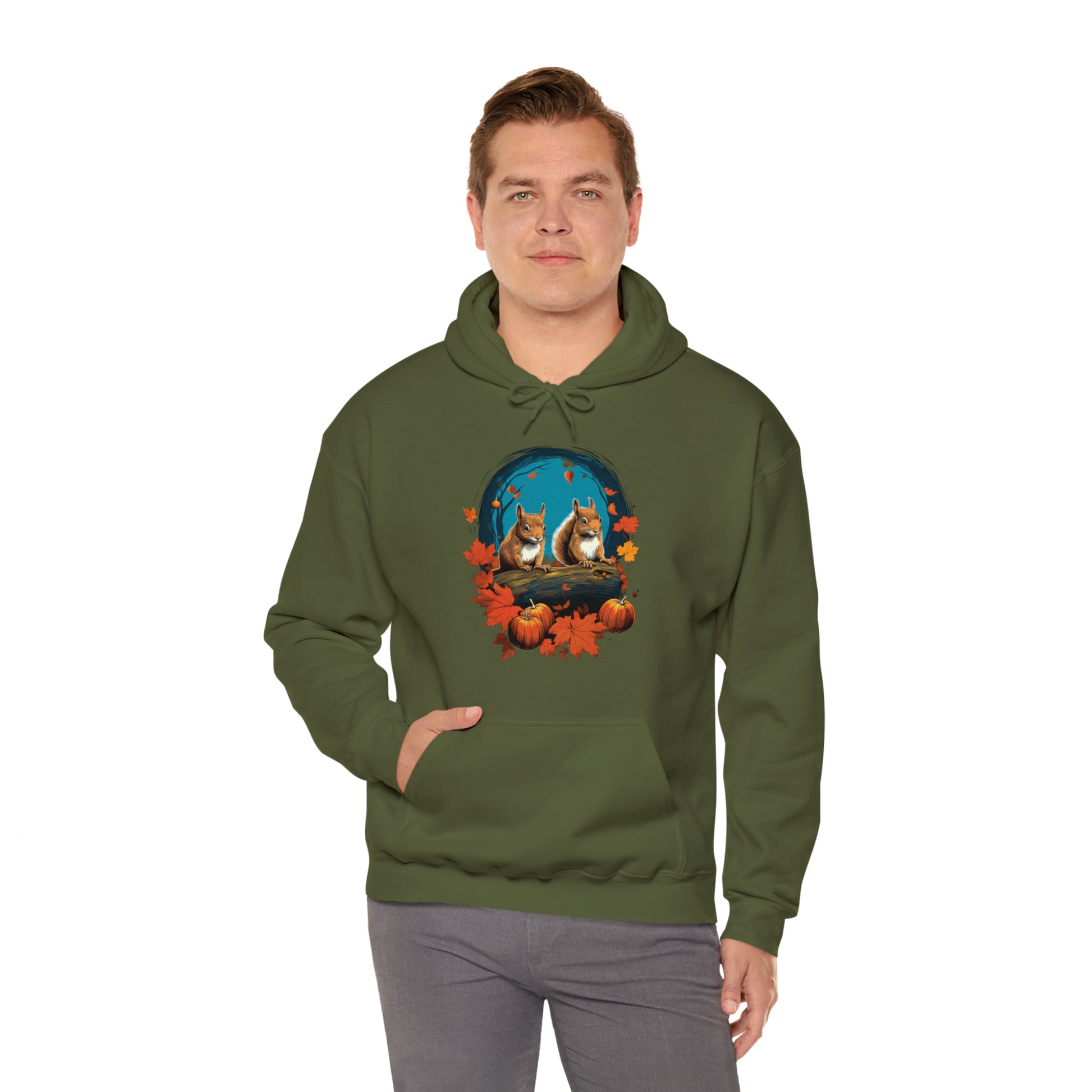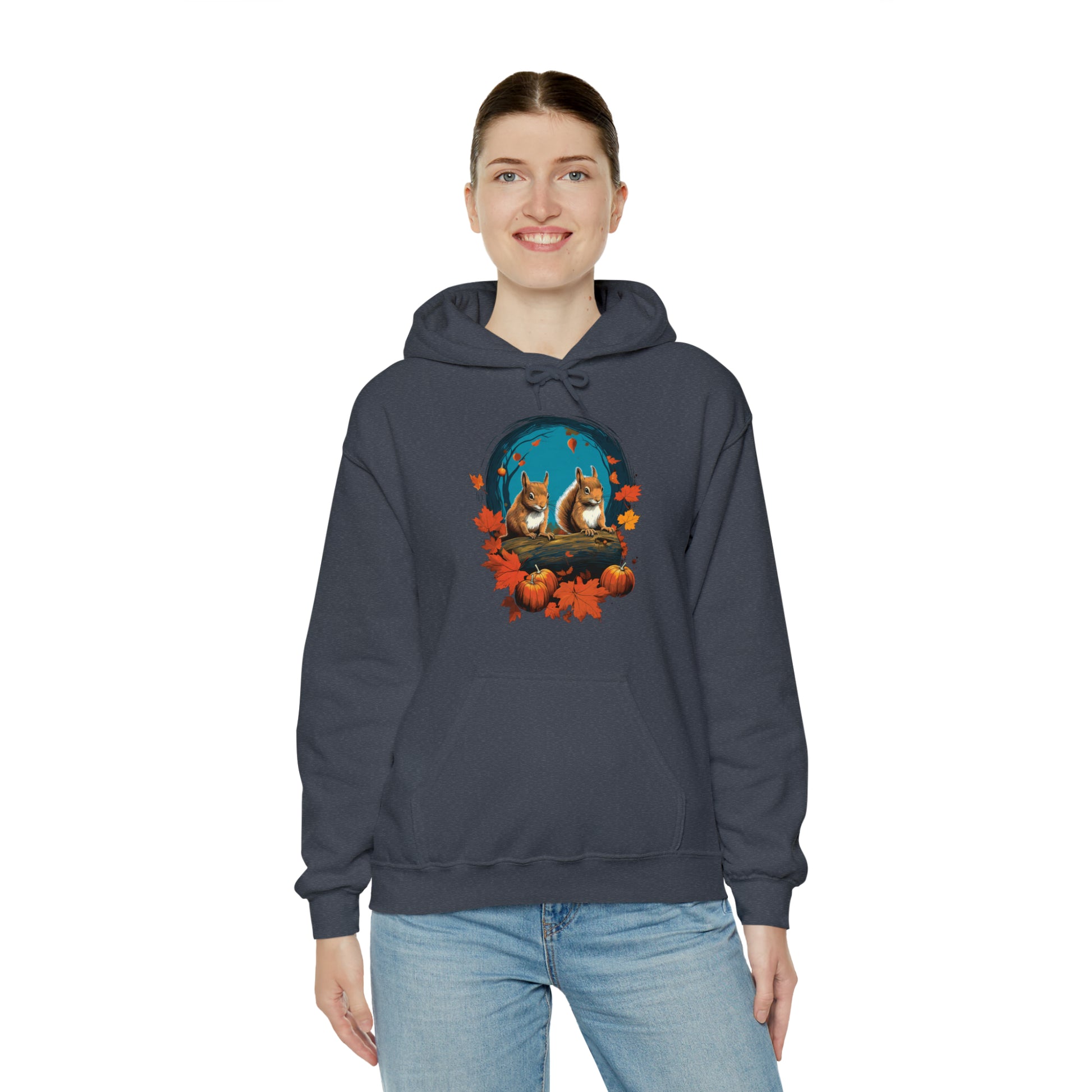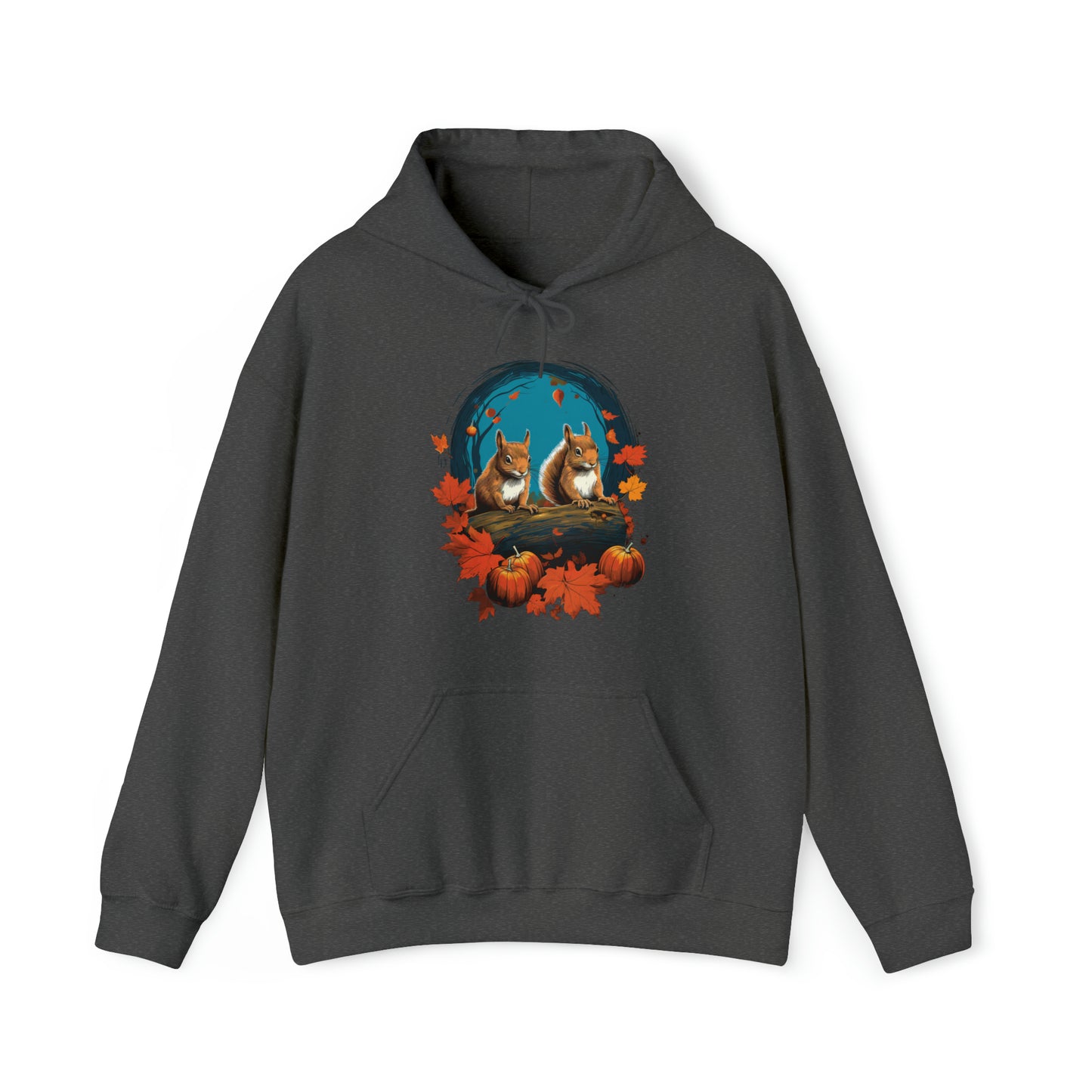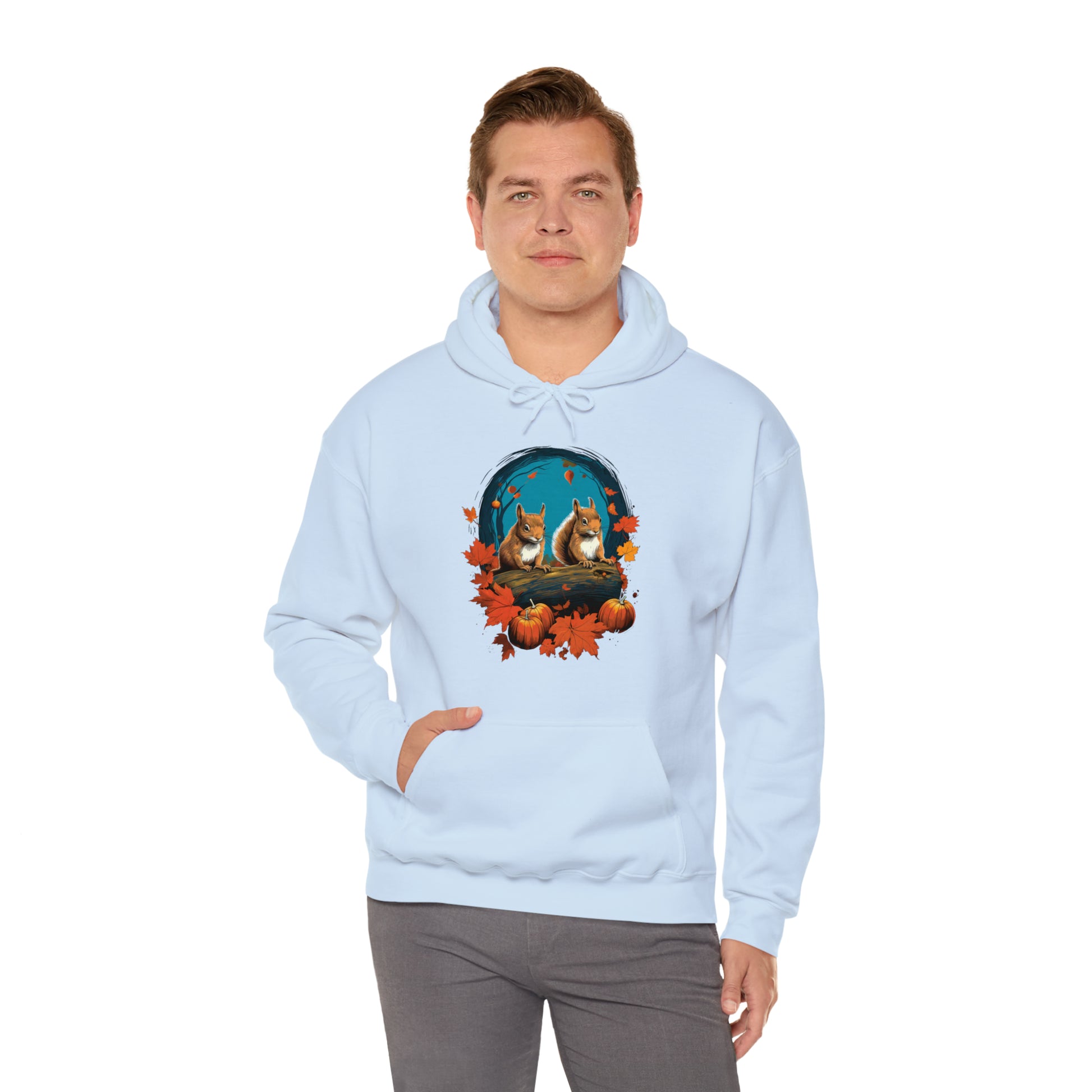 Squirrels Hoodie, Fall Autumn Leaves Pumpkins Animals Pullover Men Women Adult Aesthetic Graphic Cotton Hooded Sweatshirt Pockets