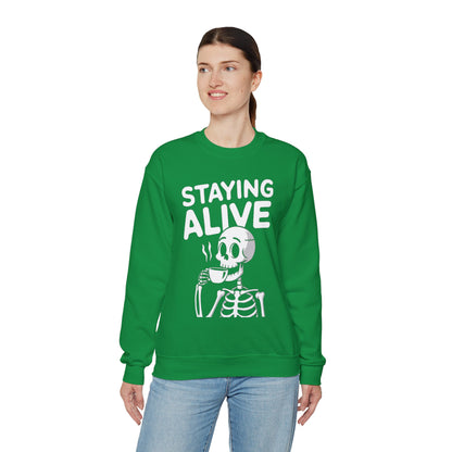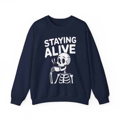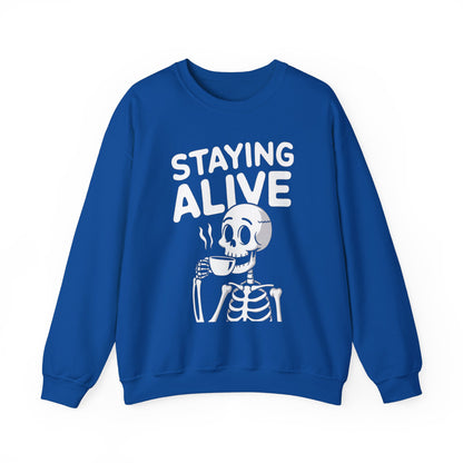 Staying Alive Coffee Sweatshirt, Skeleton Halloween Funny Graphic Crewneck Fleece Cotton Sweater Jumper Pullover Men Women Adult Top
