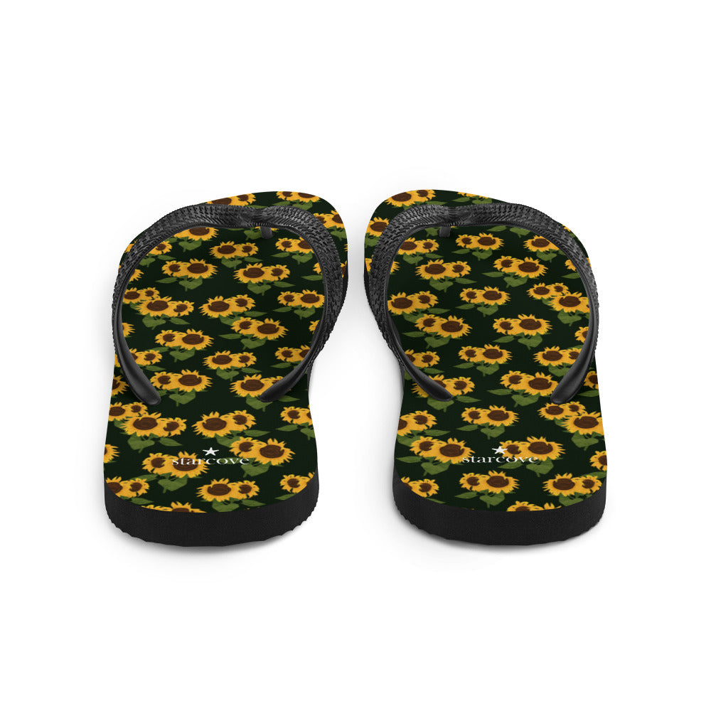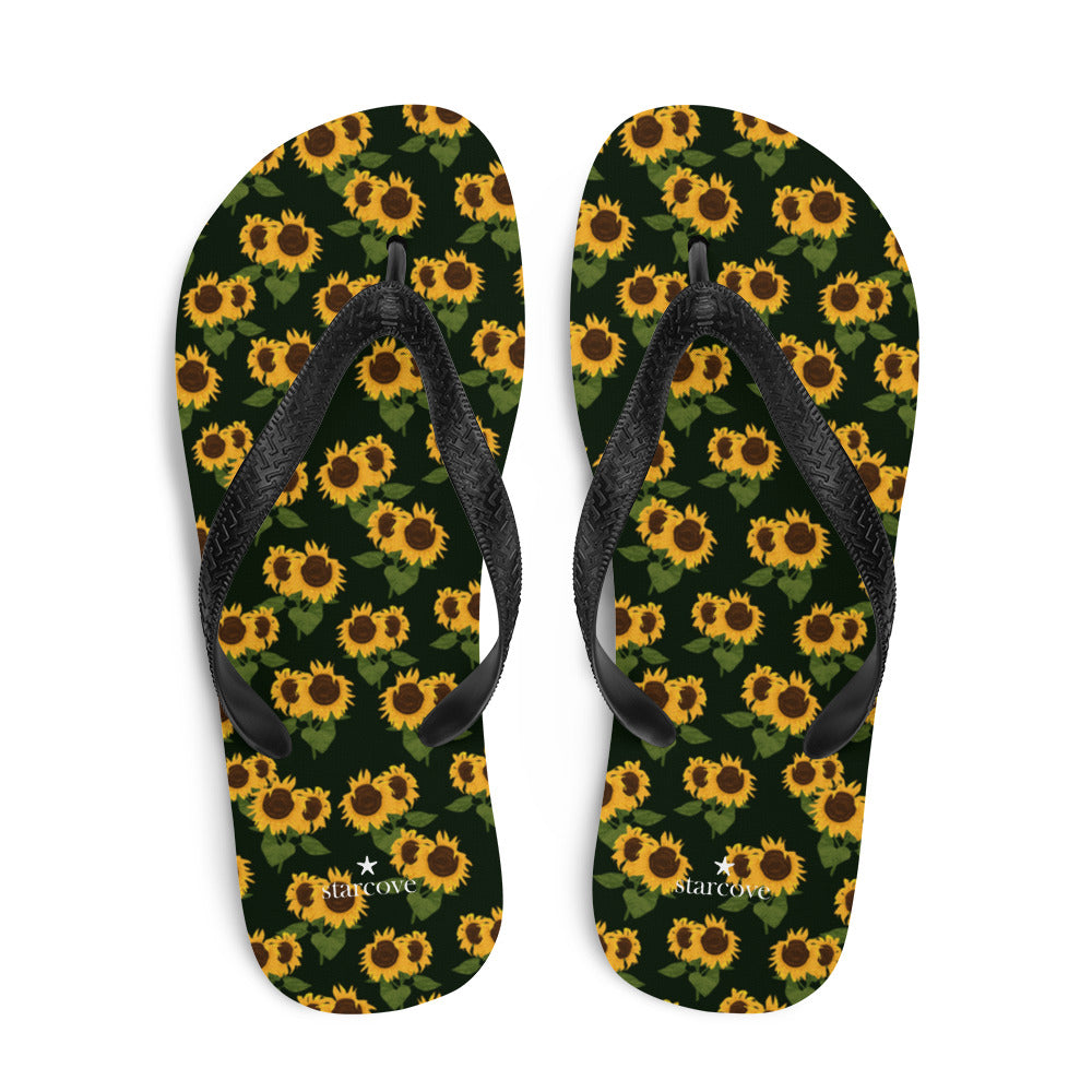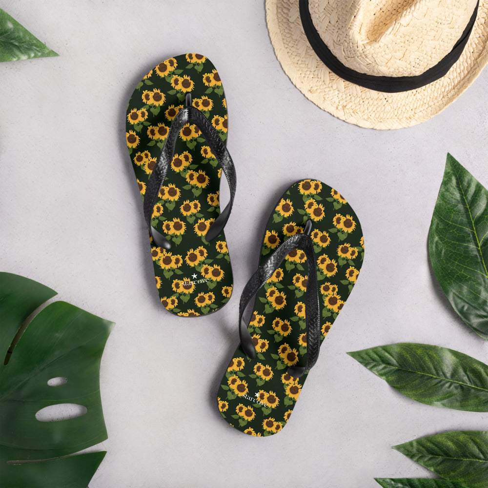 Sunflower Flip Flops, Floral Flower Footwear, Black Yellow Thong Sandals Summer Woman Men Beach Sunflower Print Shoes