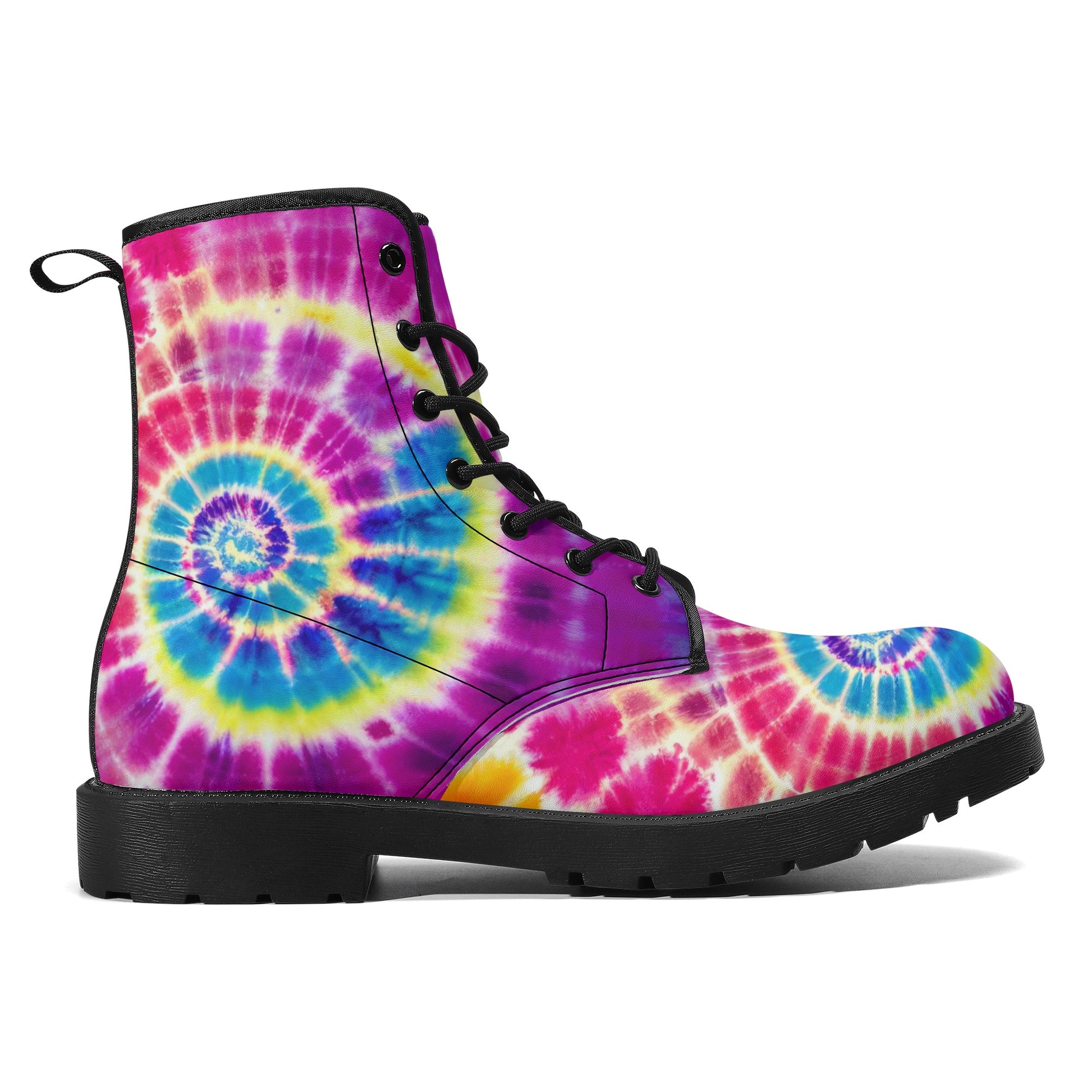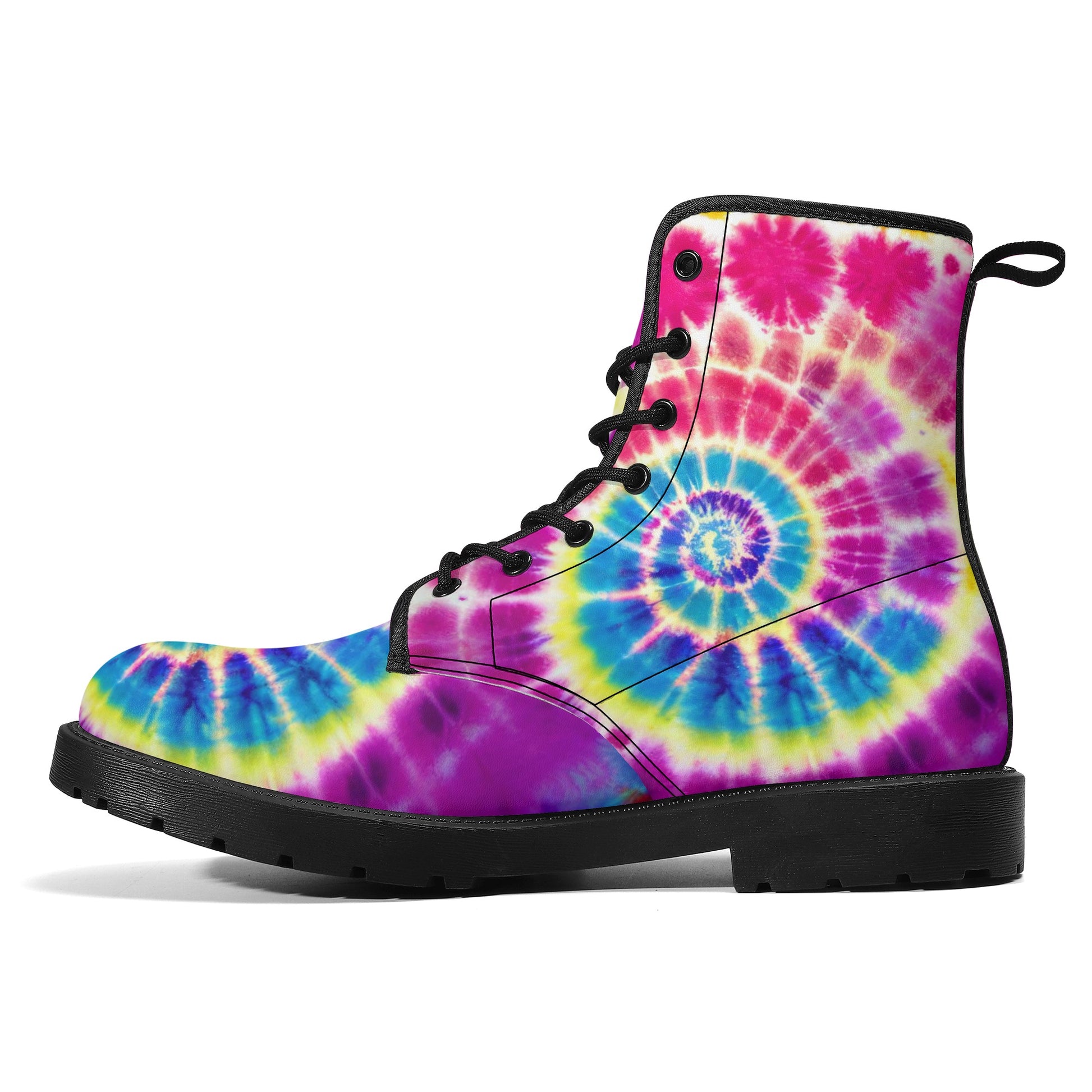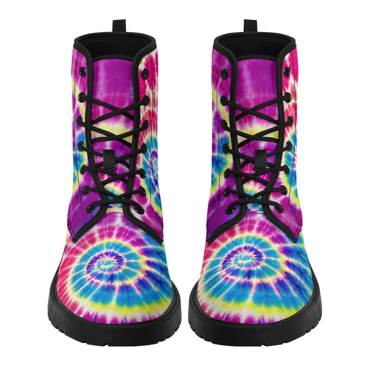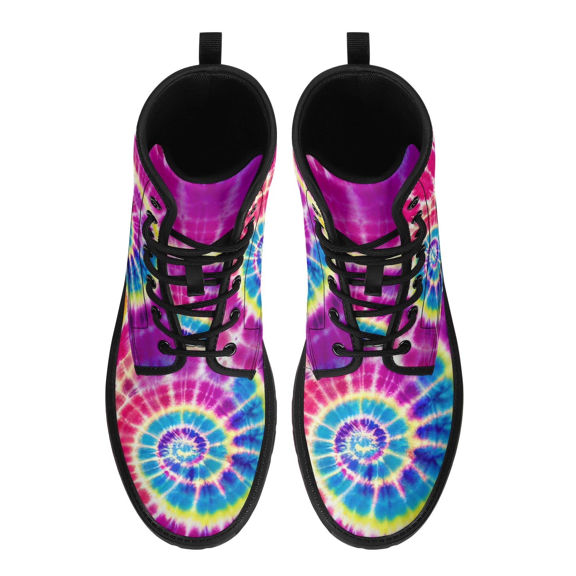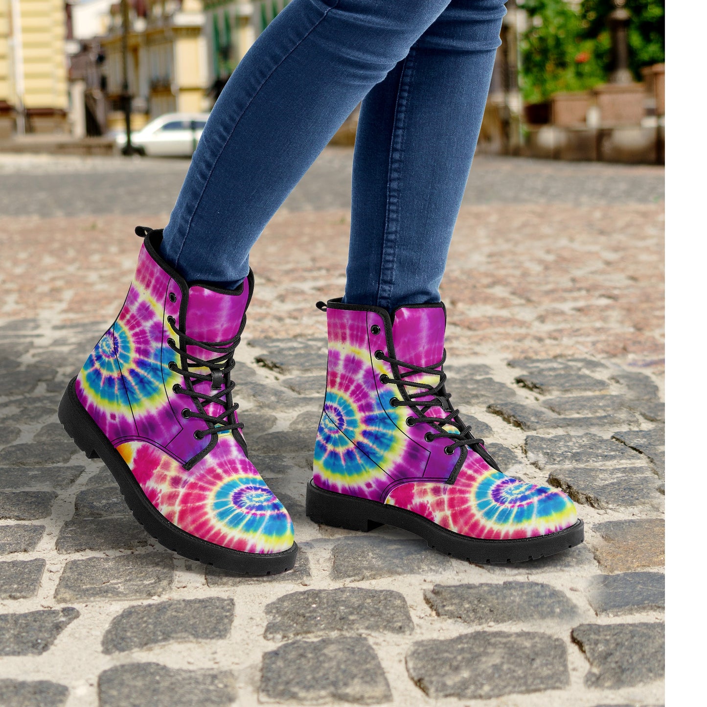 Tie Dye Women Leather Boots, Hippie Purple Vegan Lace Up Shoes Festival Black Ankle Combat Rave Winter Waterproof Custom Gift
