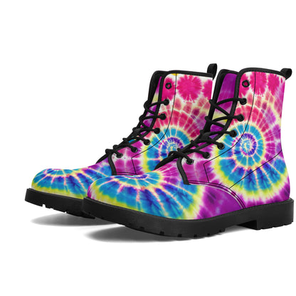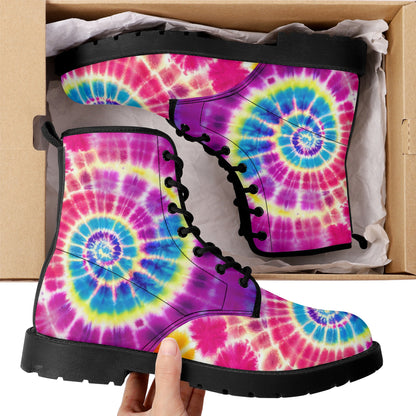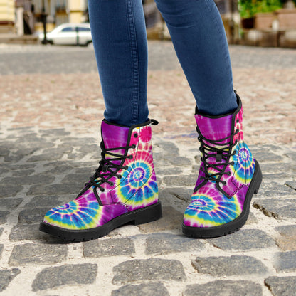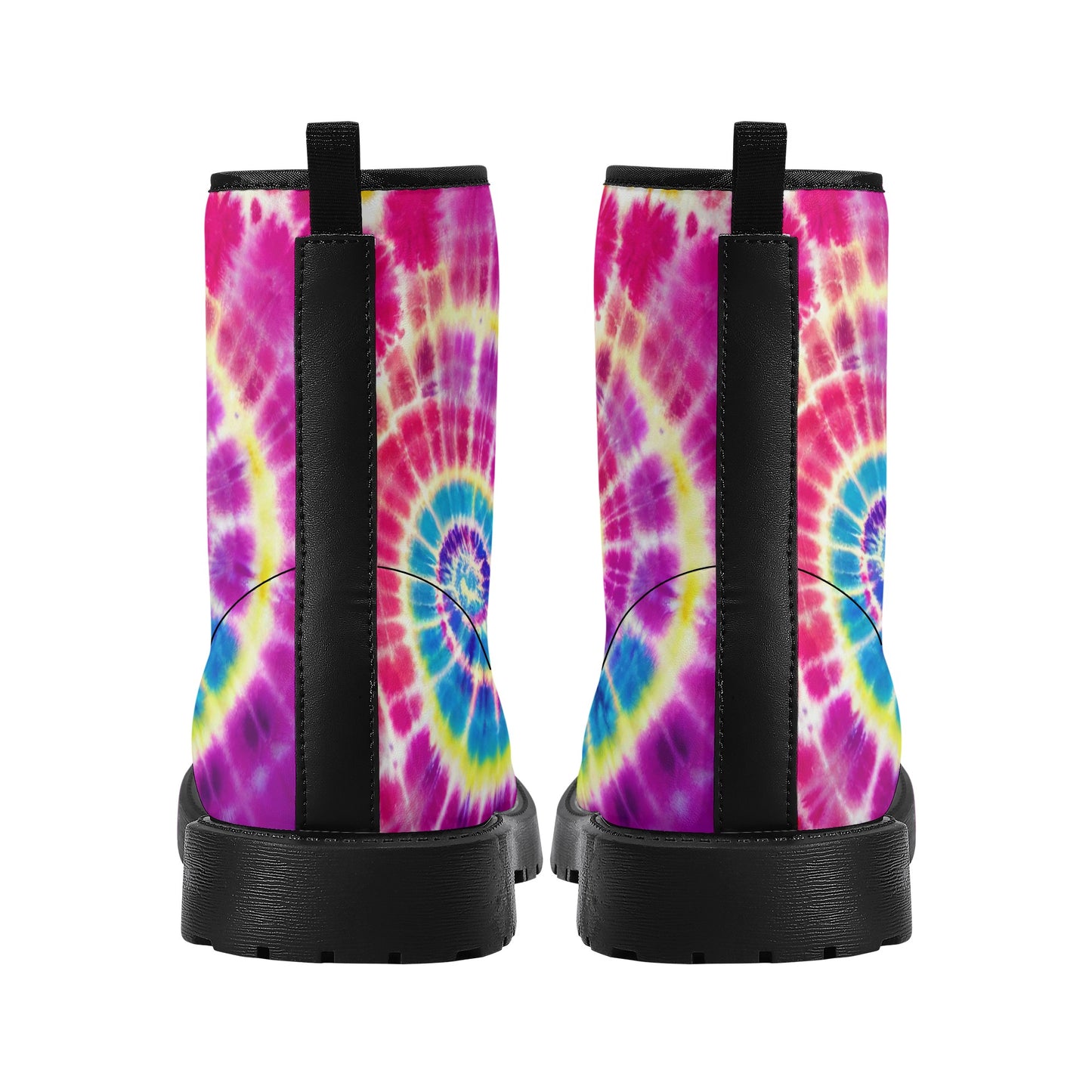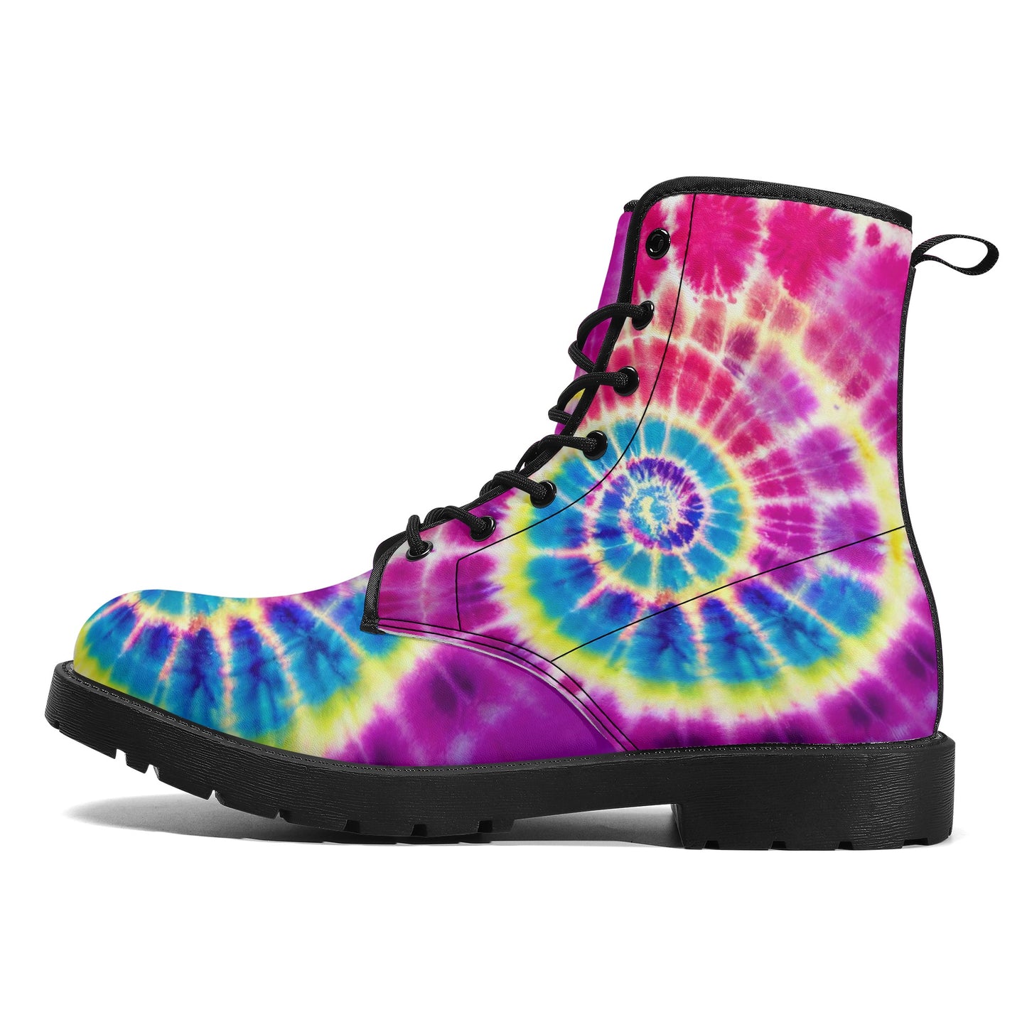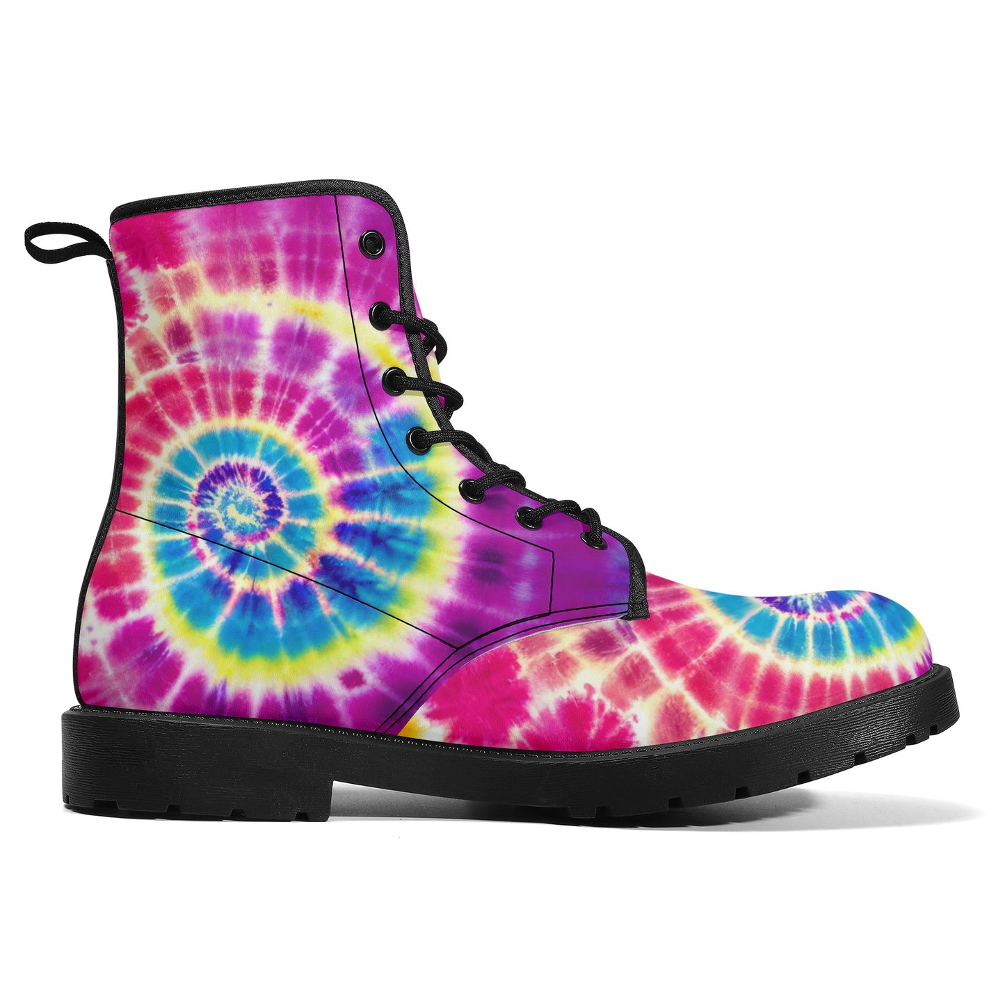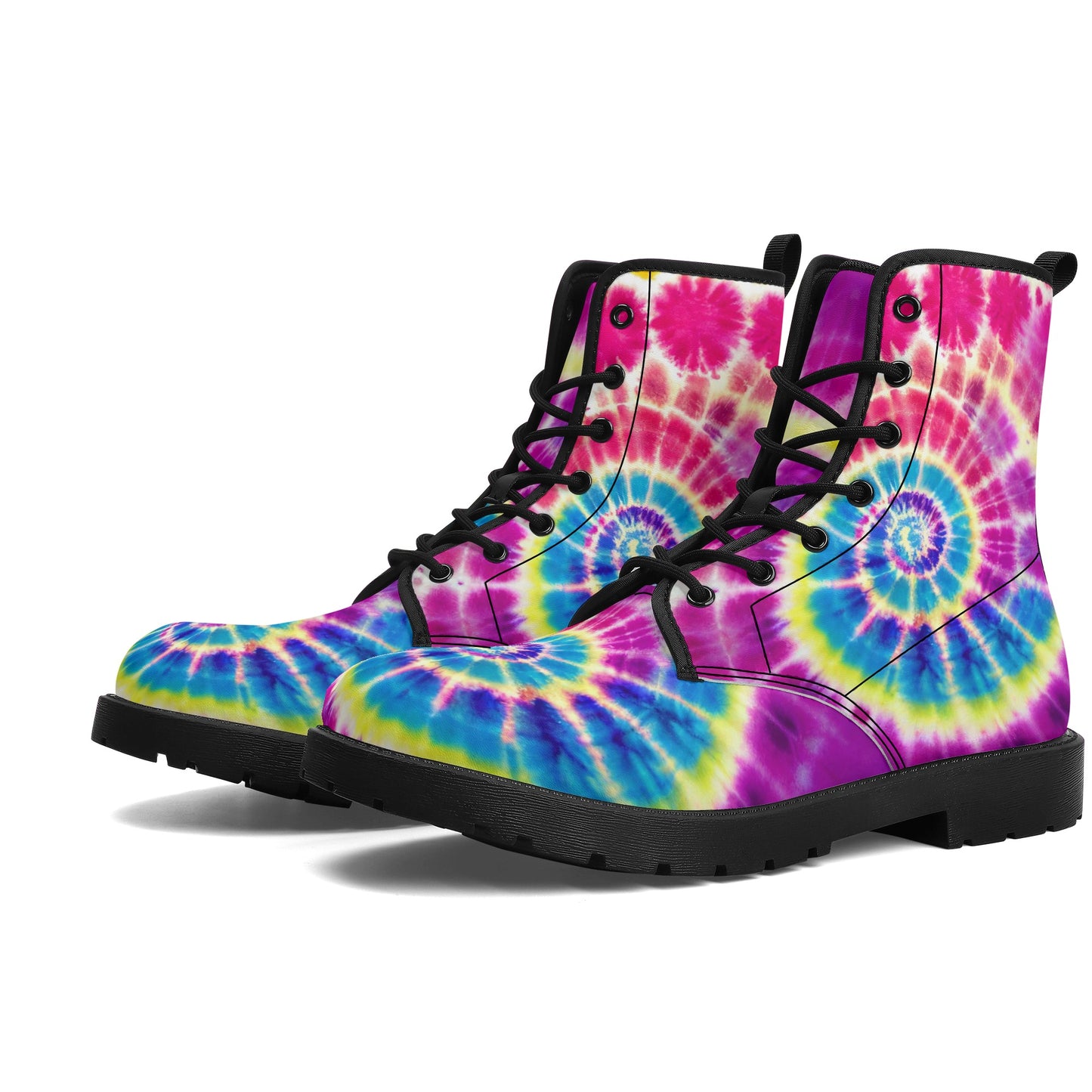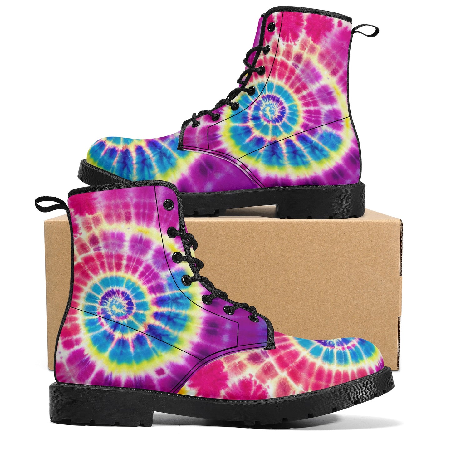 Tie Dye Women Leather Boots, Hippie Purple Vegan Lace Up Shoes Festival Black Ankle Combat Rave Winter Waterproof Custom Gift