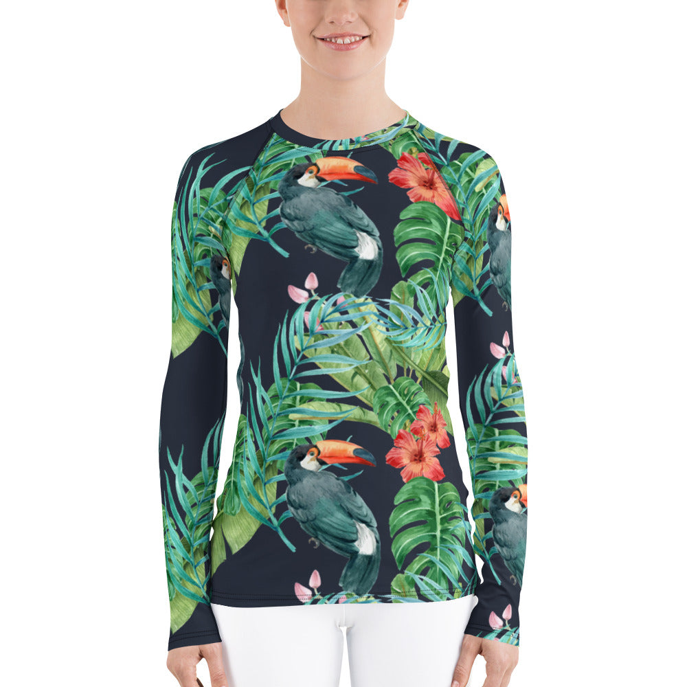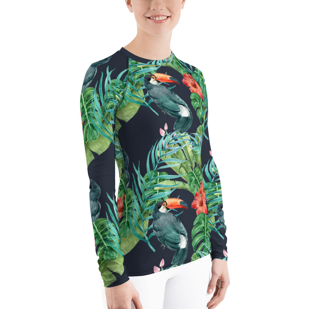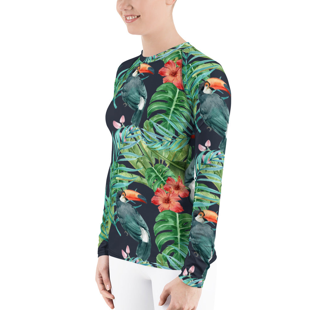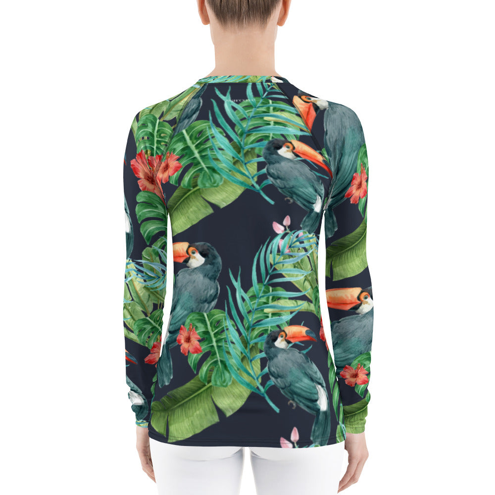 Toucan Tropical Bird Pattern Women's Rash Guard, Leaves Print Surf Long Sleeve Shirt Swimwear Sun Beach Designer Wet Suit Protection 40 UPF