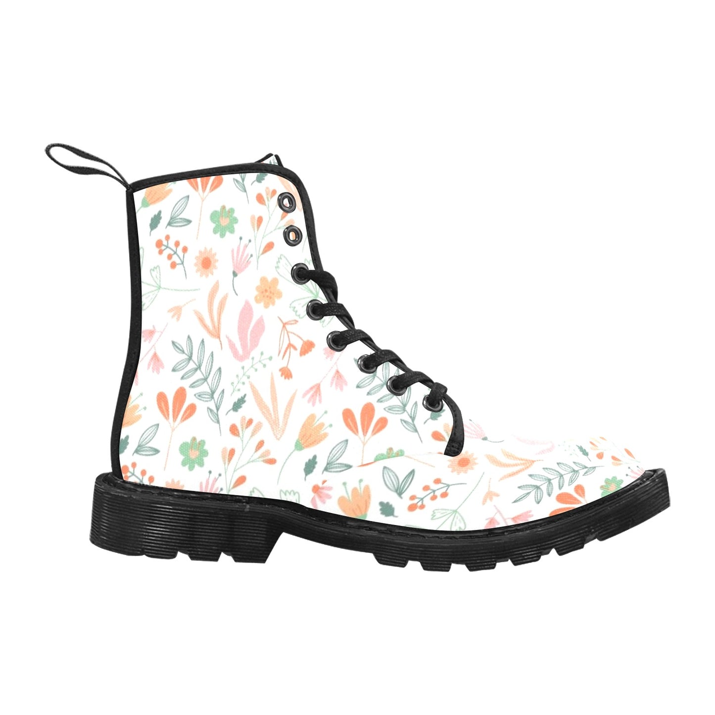 White Floral Combat Boots Women, Pink Flowers Vegan Canvas Lace Up Shoes Print Black Ankle Casual Custom Gift